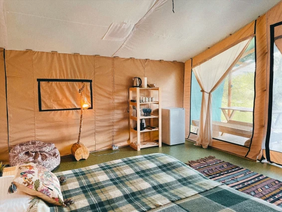 Ваша палатка с удобными кроватями, своим душем и туалетом. Мягкое постельное бельё, пушистые полотенца и холодильник для прохладительных напитков. Посуда, чайник, решетка и шампуры. Рядом уютная зона с мангалом.