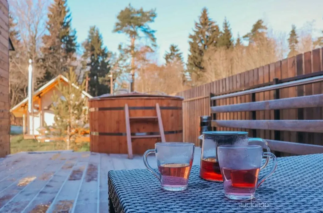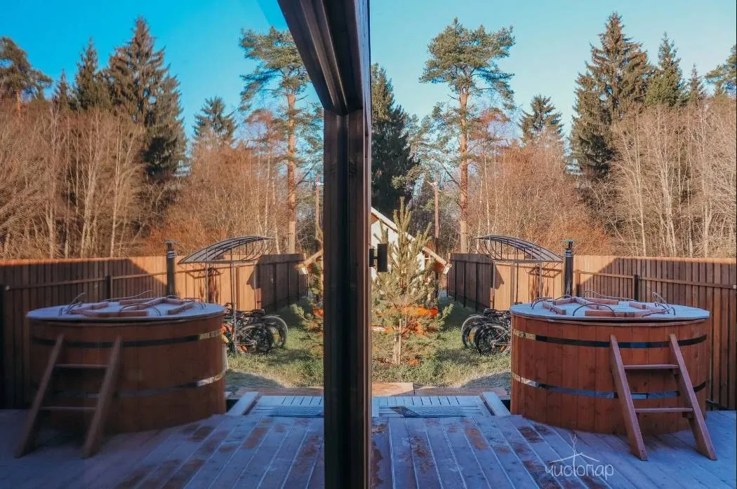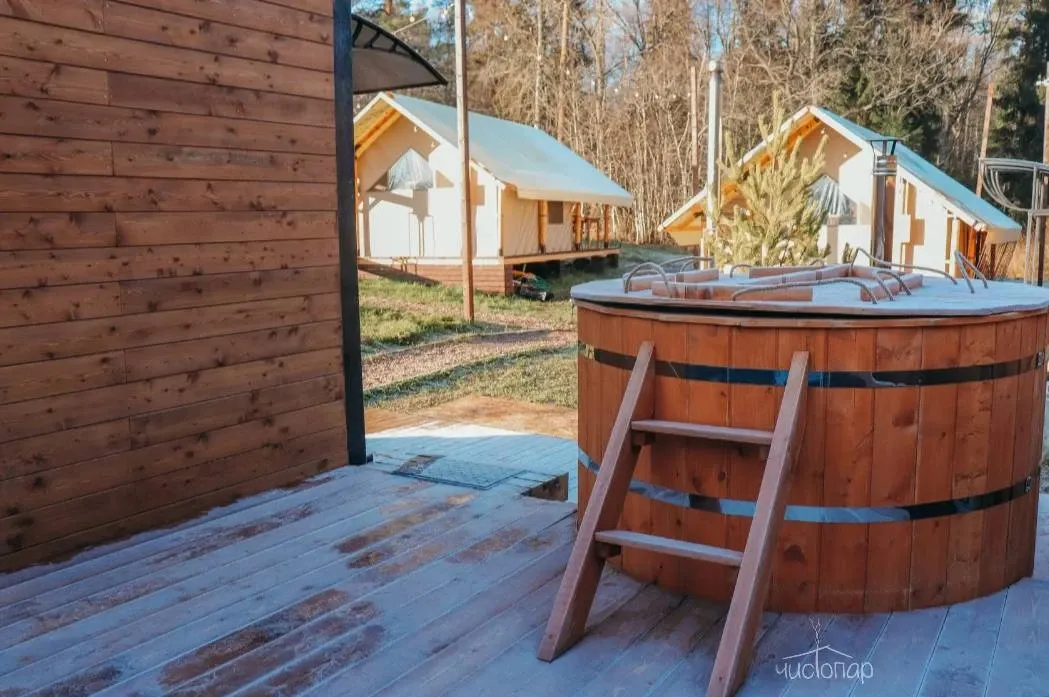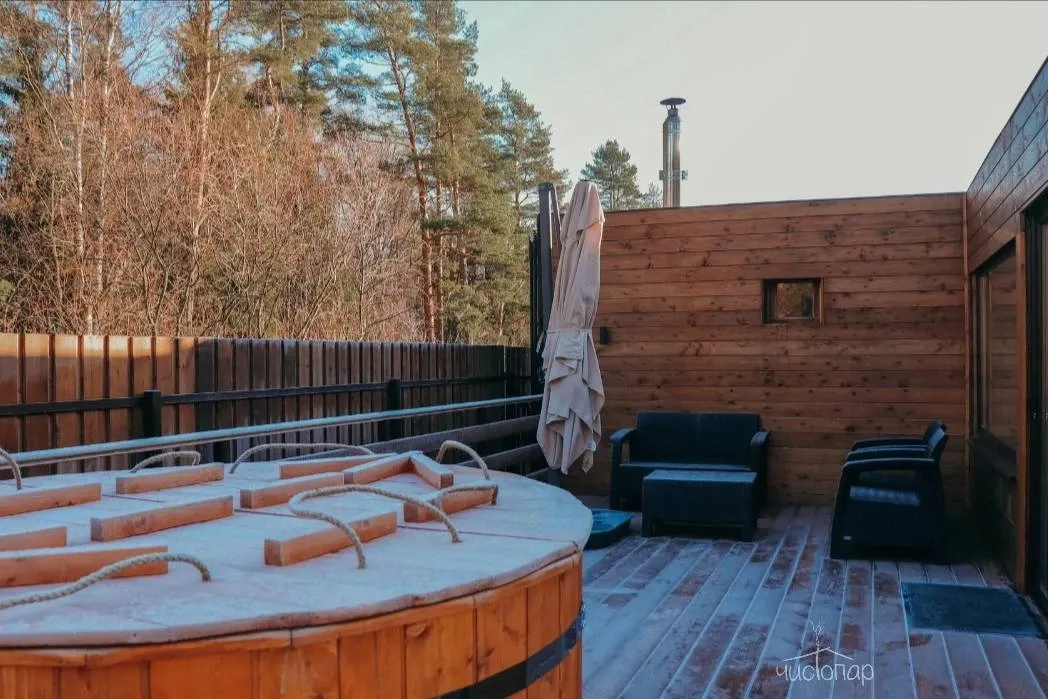 Традиционная парная на дровах и классическая теплая японская купель на свежем воздухе.