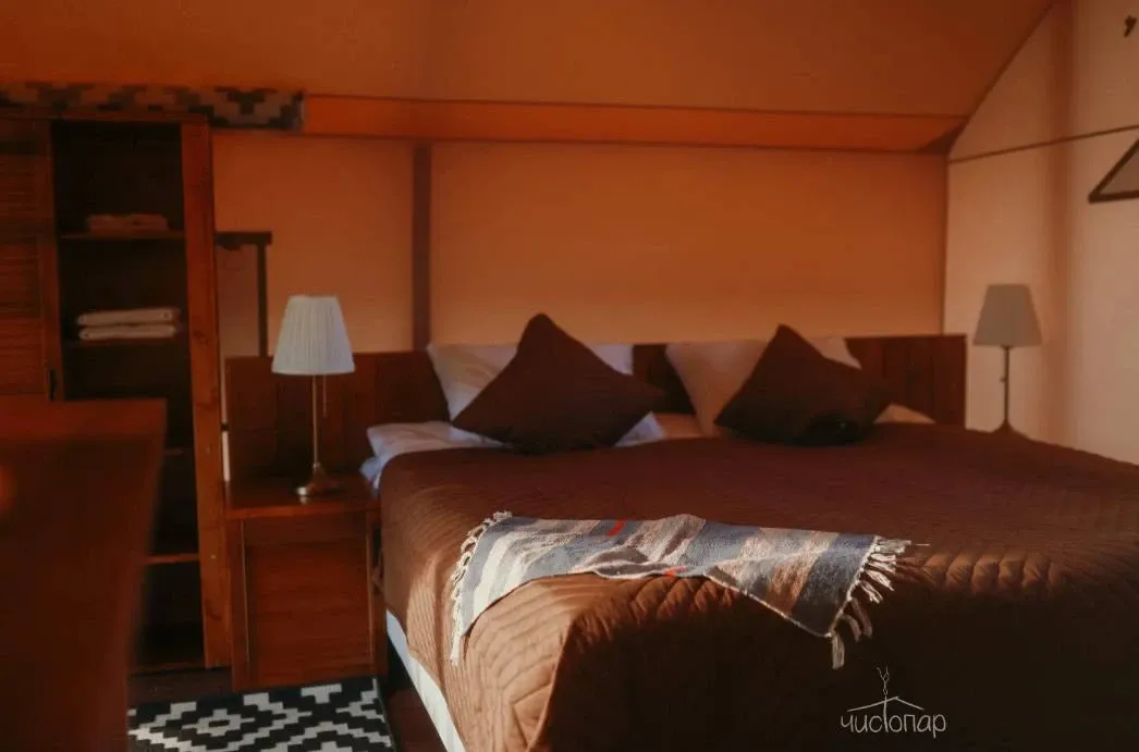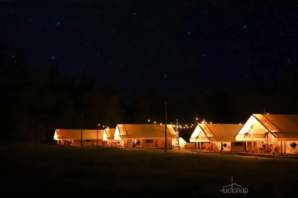 На территории расположено 9 шатров для единовременного комфортного размещения до 22 гостей. Каждый шатёр оборудован всем необходимым для комфортного проживания.