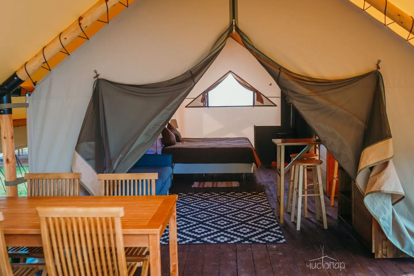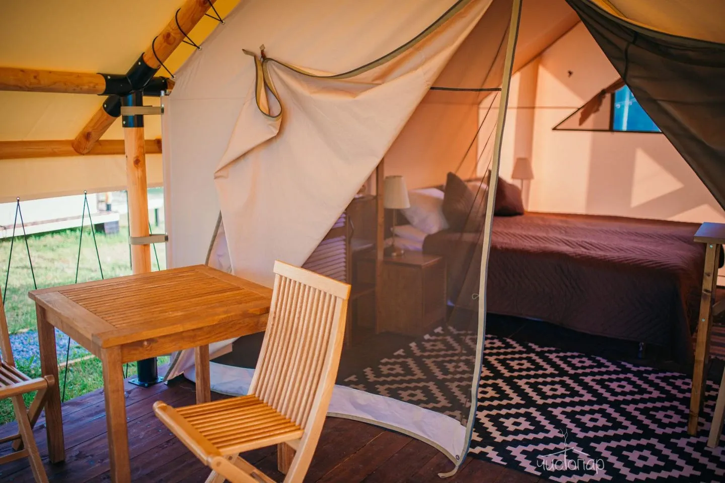 Стильный и теплый шатёр с террасой, рассчитанный на комфортное проживание 2 человек. Возможно бесплатное размещение ребенка до 6 лет без дополнительного места