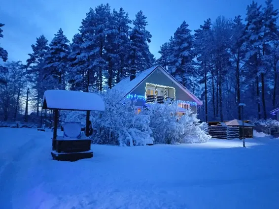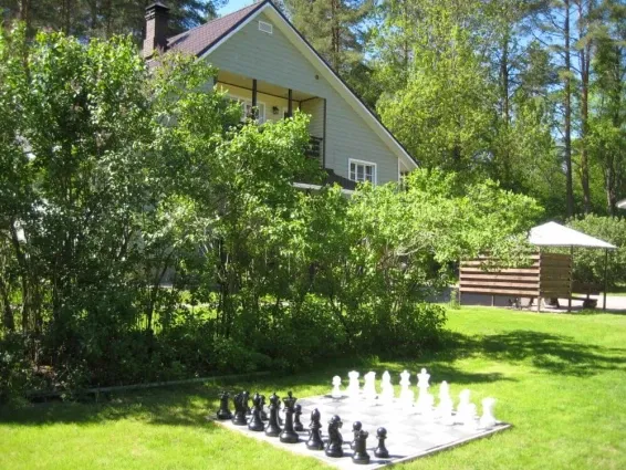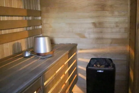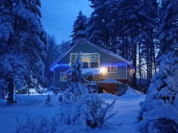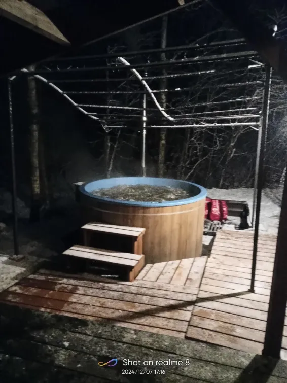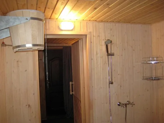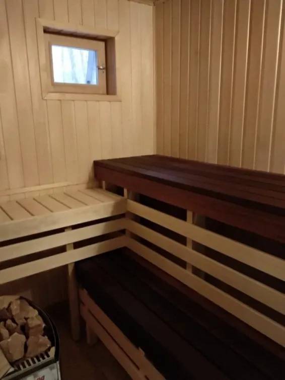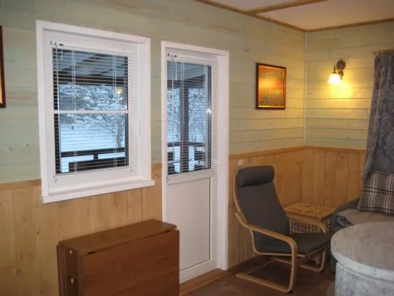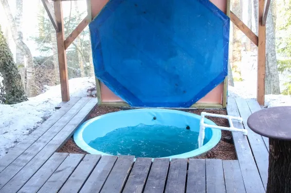 На территории, в непосредственной близости от озера с пирсом, расположена уютная баня, купель с озерной водой, комната отдыха с DVD, горячая подогреваемая купель с гидромассажем на улице с видом на озеро.