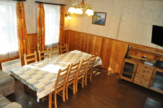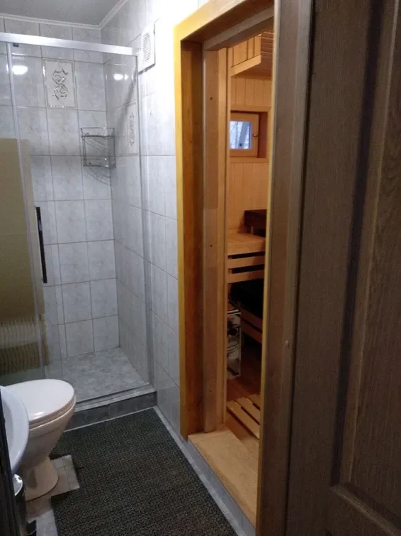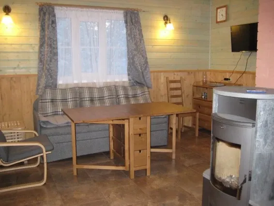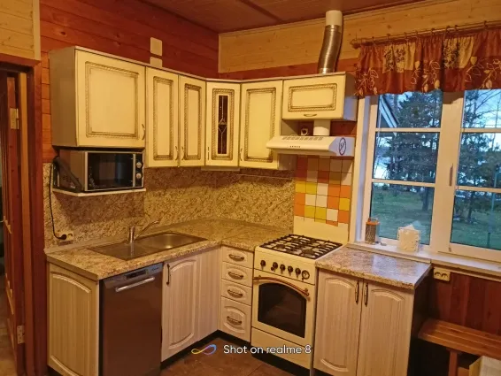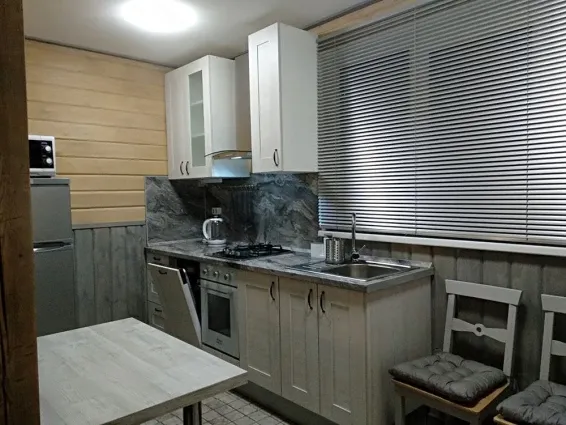 На первом этаже гостиная с теплосберегающим немецким камином, оборудованная кухня: электроплита, микроволновая печь, электрочайник, холодильник, посудомоечная машина, вся посуда на 6 персон. Ж/к телевизор ( 37 дюймов ), антенна Триколор – 200 каналов, большой стол, угловой мягкий диван, теплый пол на всей площади, санузел с душем и сауной.