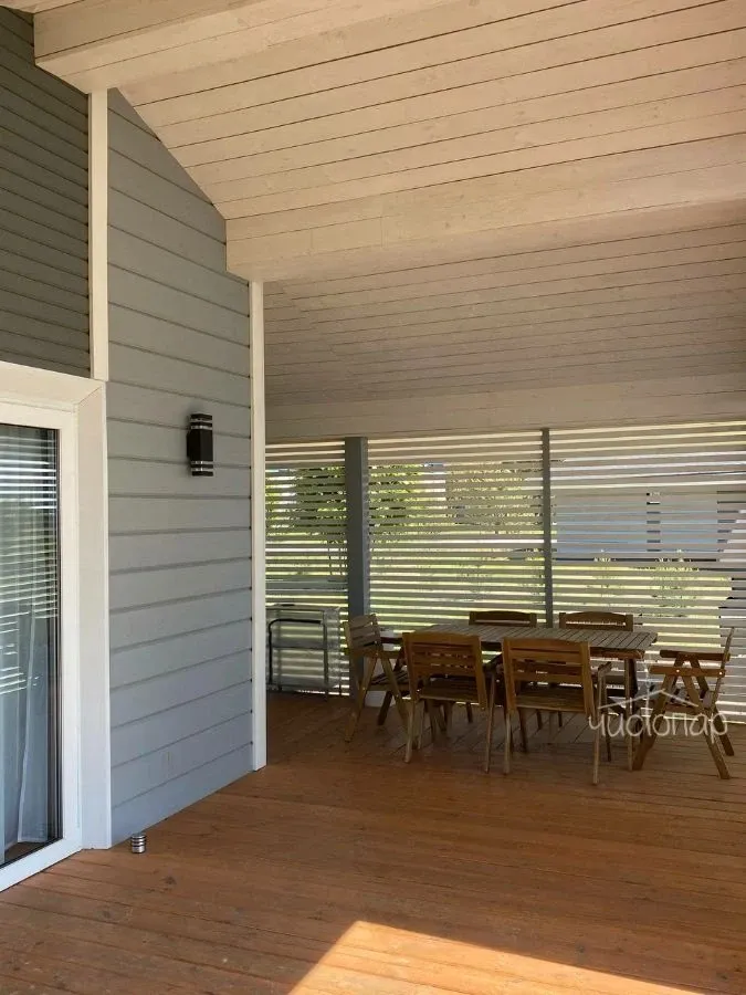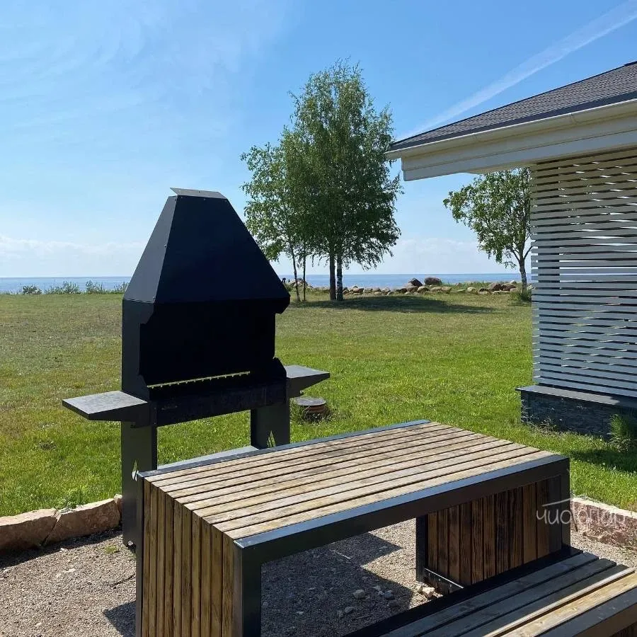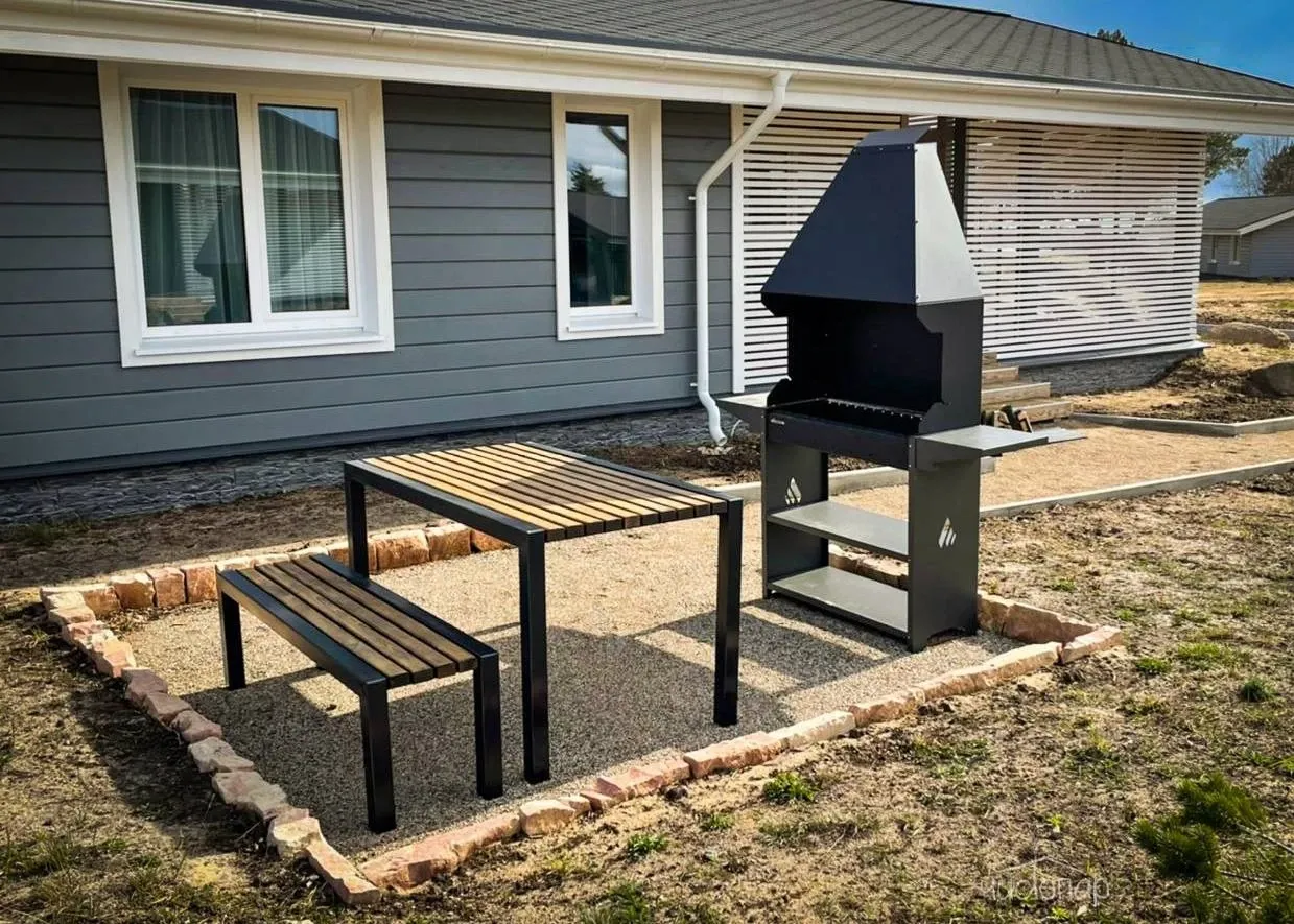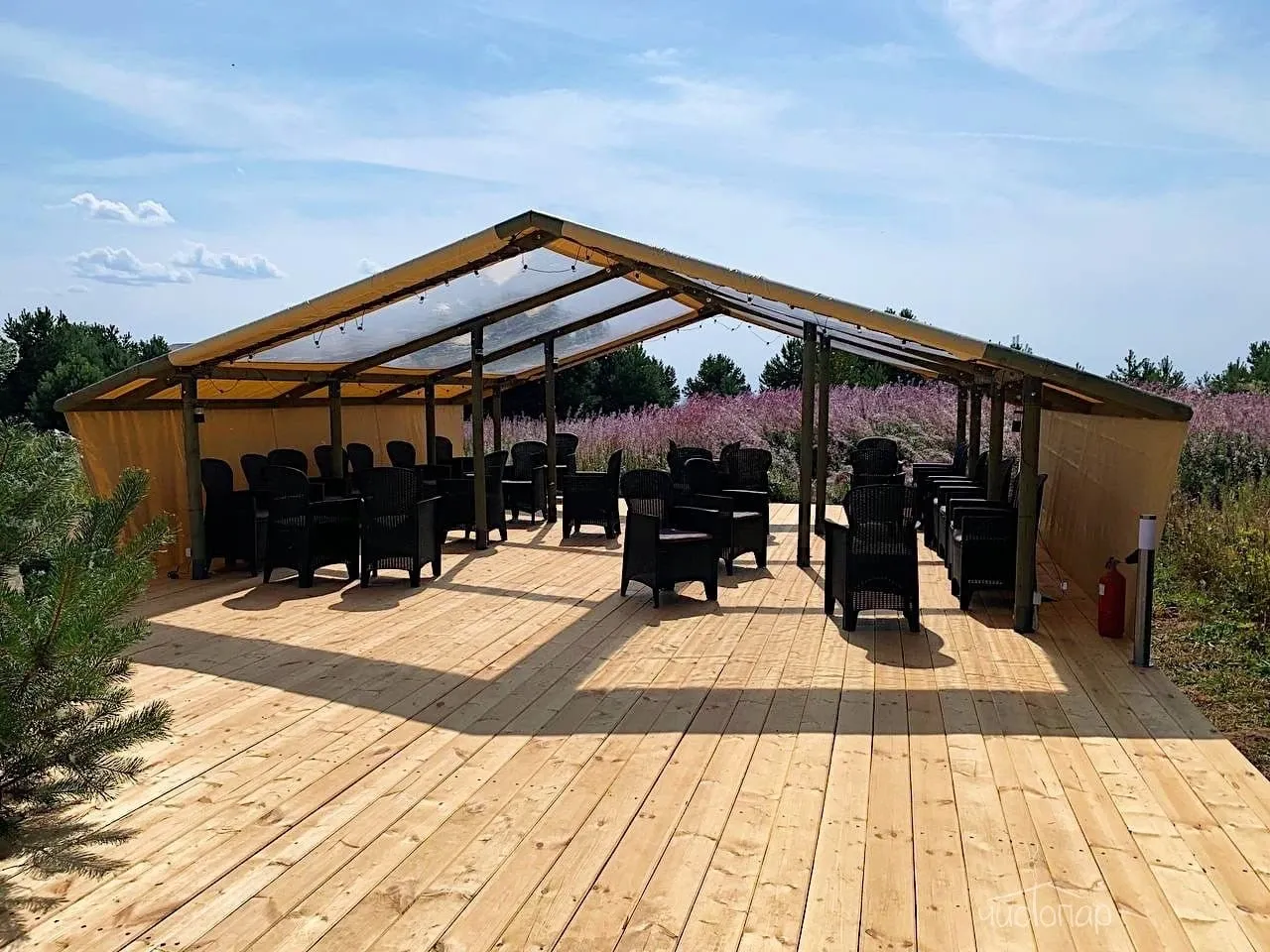 Рядом в глэмпом располагается фурако-купель и крытая зона со столом, барными стойками, качелями и мангальной зоной.