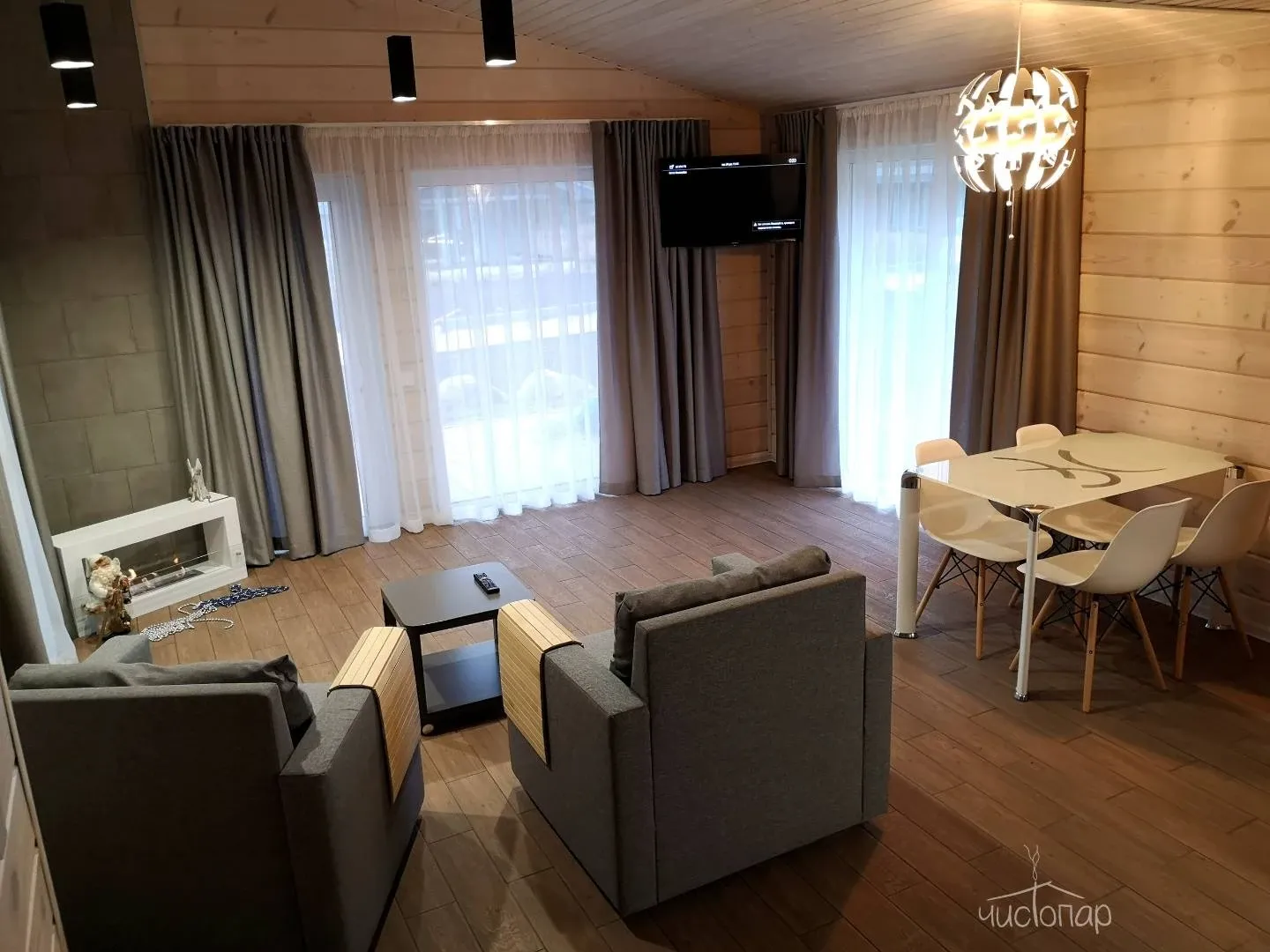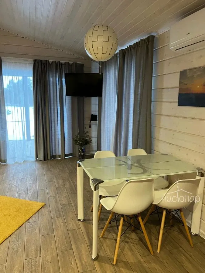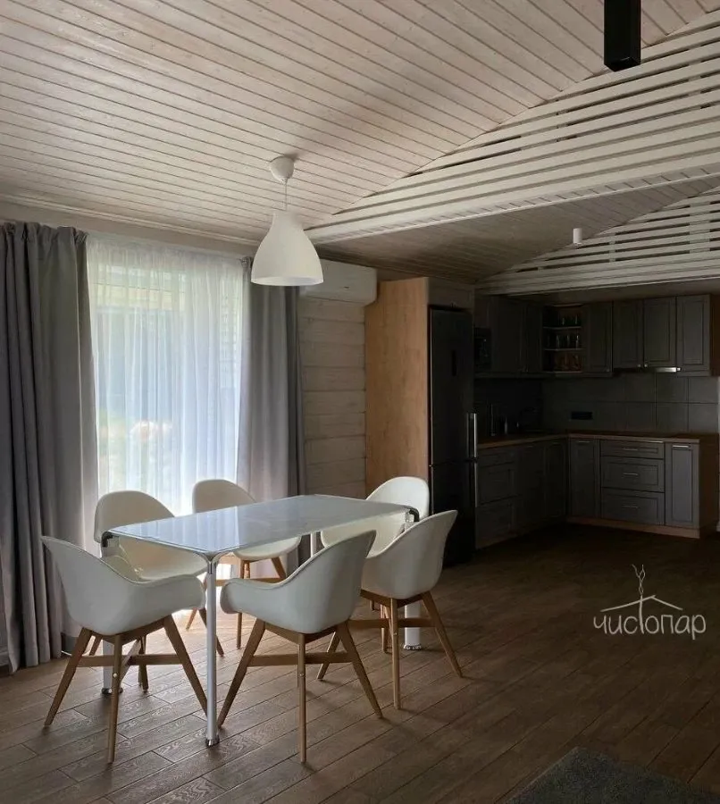 Внутри — просторная гостиная с обеденным столом, кухня, две уютные спальни, санузлы на каждом этаже.