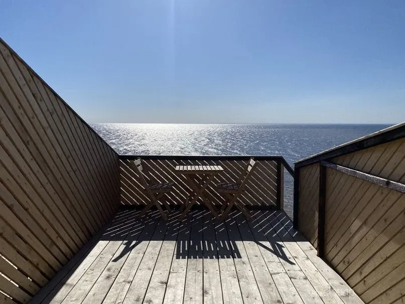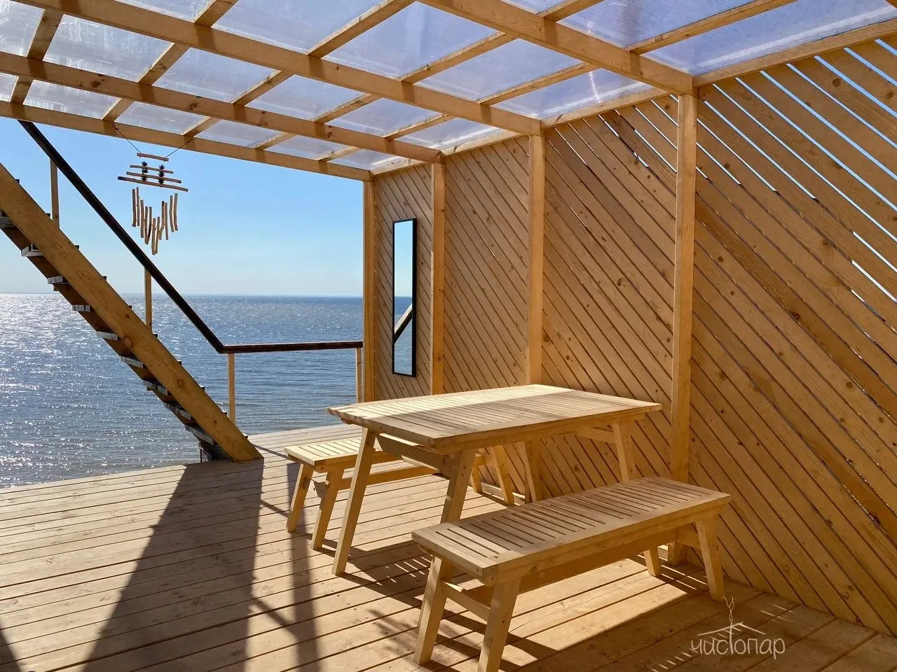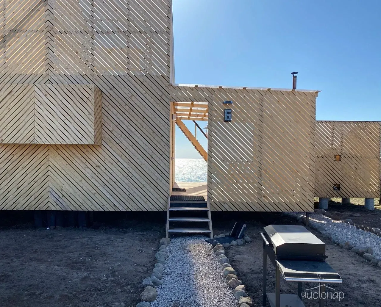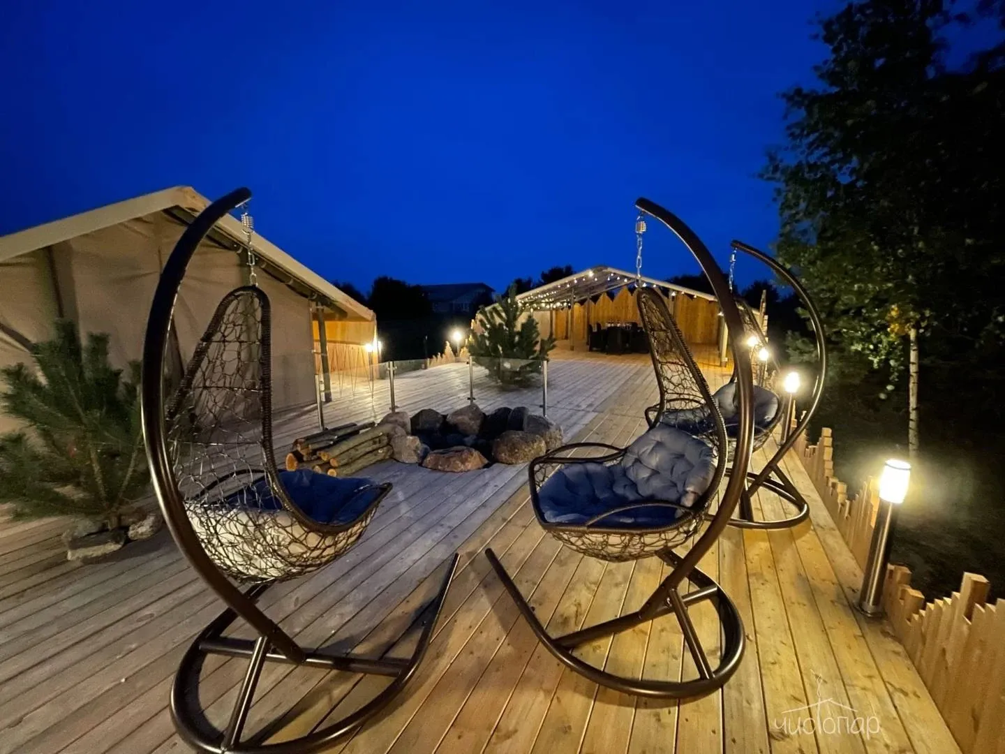 Глэмп с 1 спальнейУ каждого глэмпа предусмотрены 2 террасы: на верхней — качель с видом на озеро, на нижней — обеденный стол и фурако-купель.