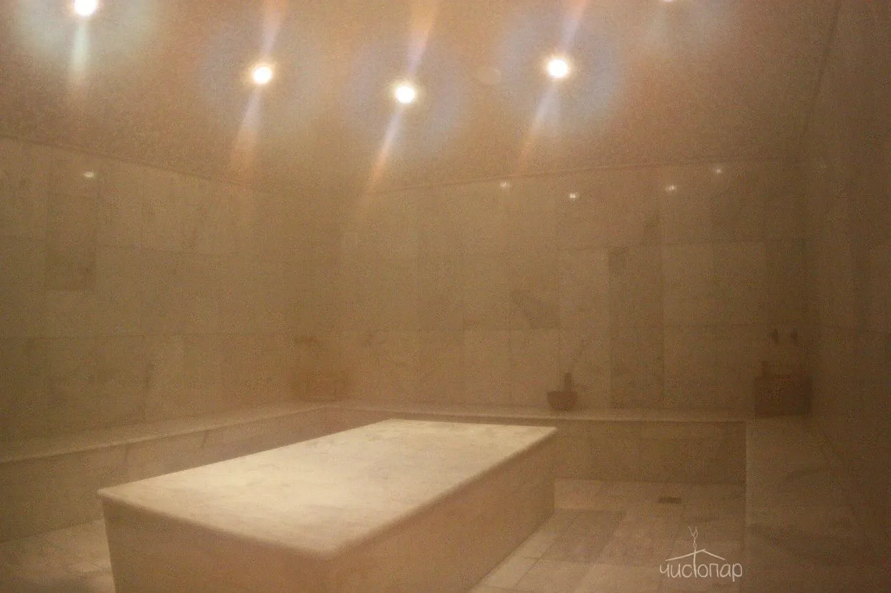Турецкая баня расположена на территории отеля и предназначена она только для мужчин. Придется по душе тем, кто предпочитает комфортную температуру и высокую влажность в парной.