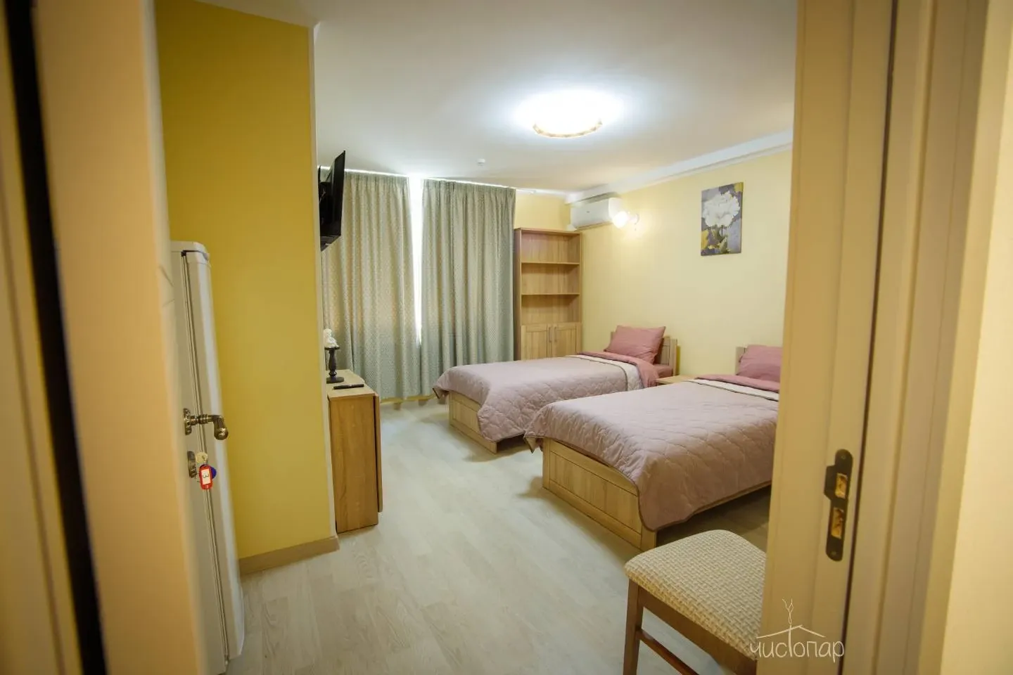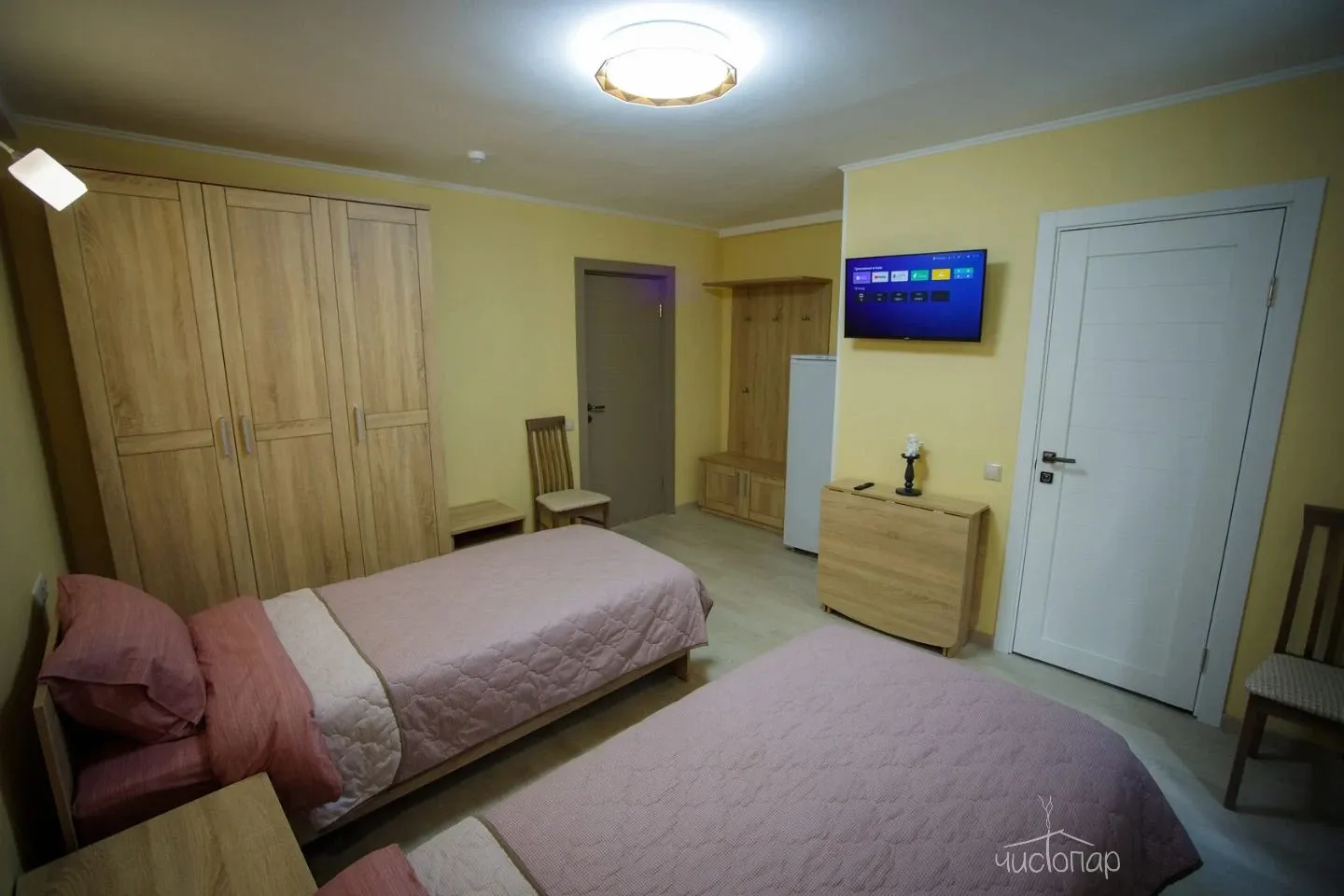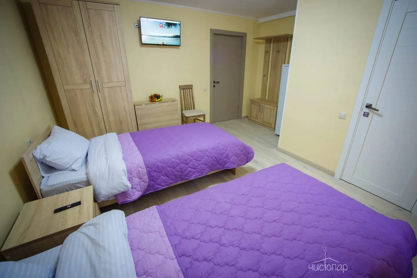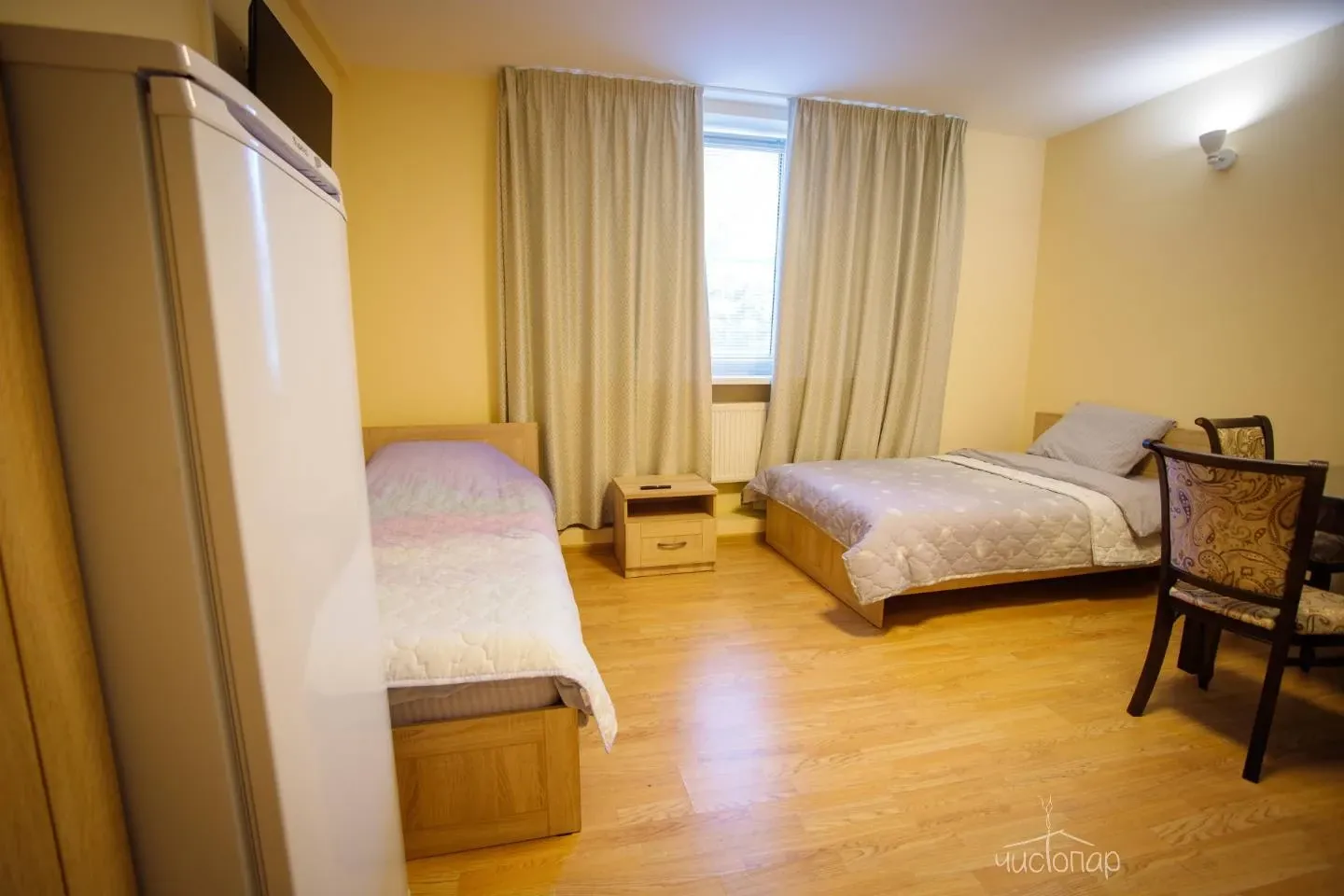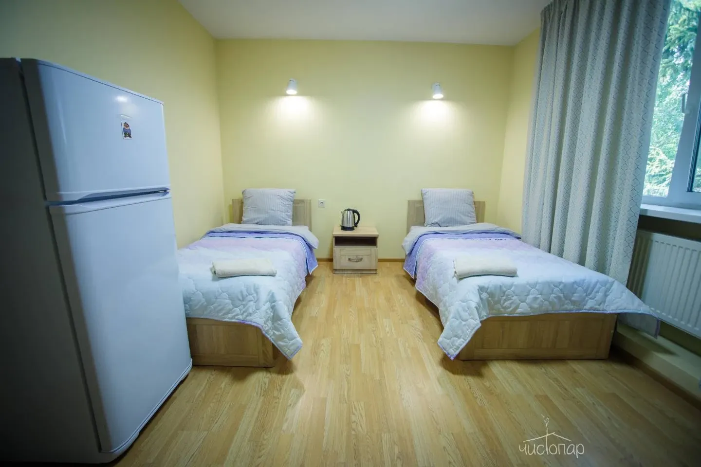 Трехместный номер с двумя кроватями и санузлом. Кухня на этаже.