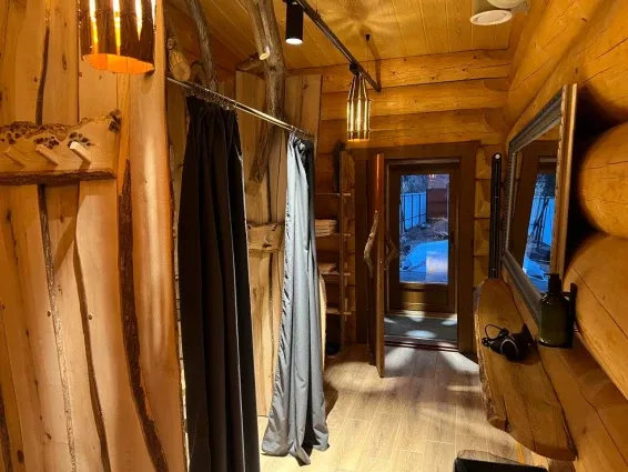 Сердце бани - печь "Шаман", благодаря облицовке тальк хлорита, печь равномерно отдает тепло, "Шаман" имеет три отверстия для полива водой на камни, благодаря этому, можно услышать в парной трехголосье звука зимней вьюги. Состоит из комнаты отдыха, душевой, парной, крытой уличной террасы с ледяной купелью и сеновалом.