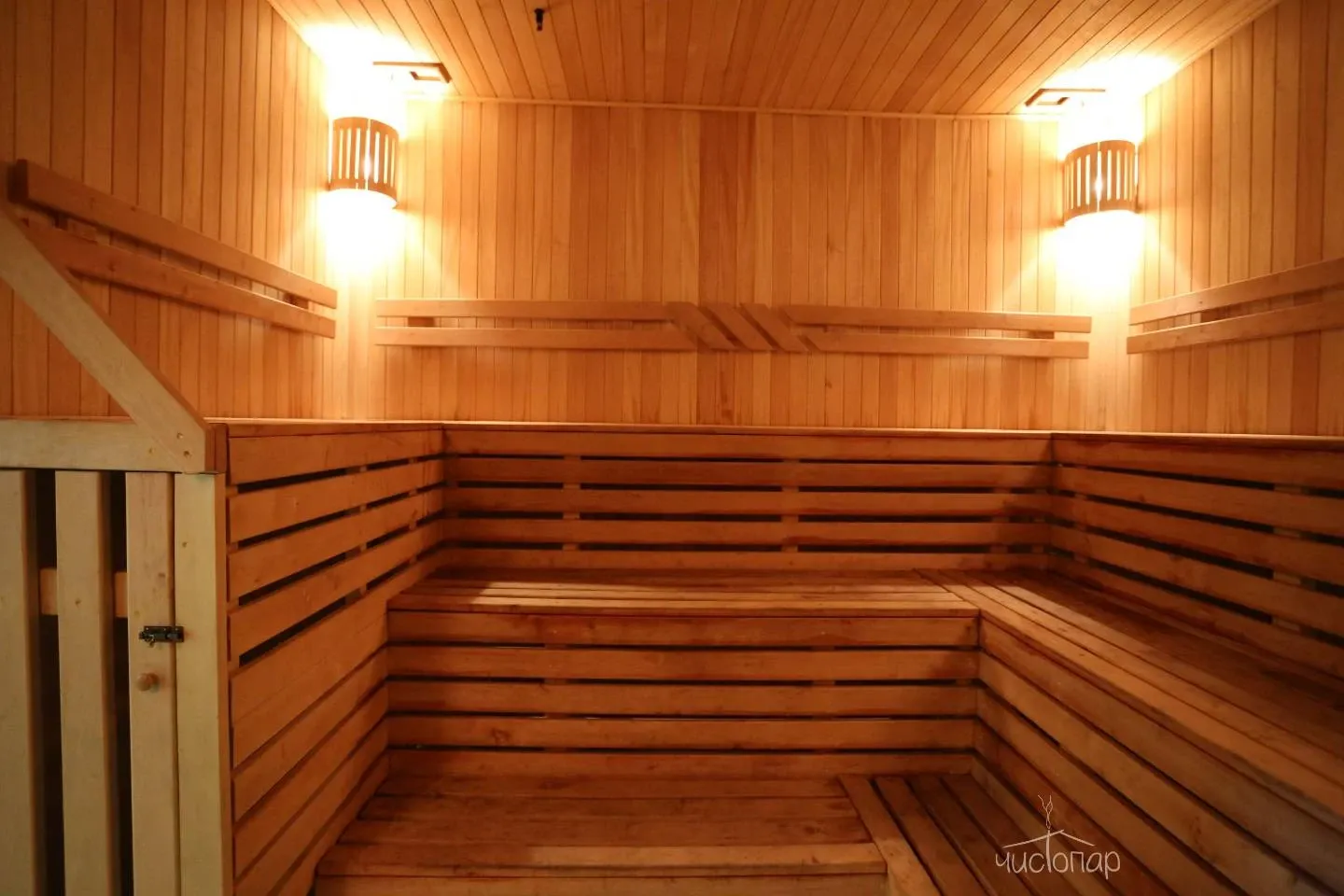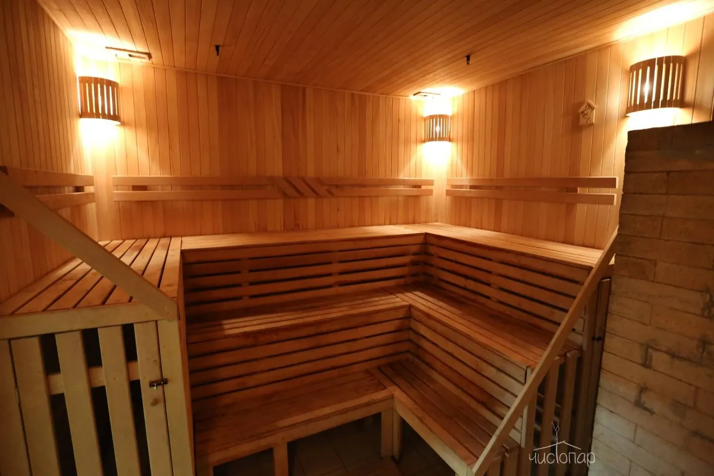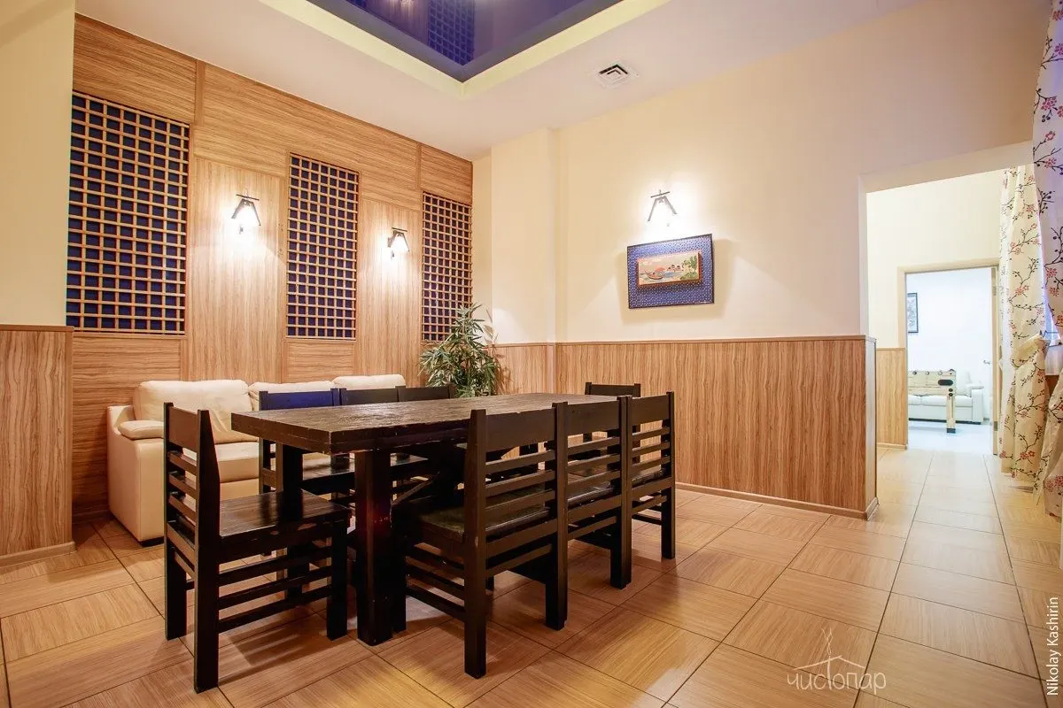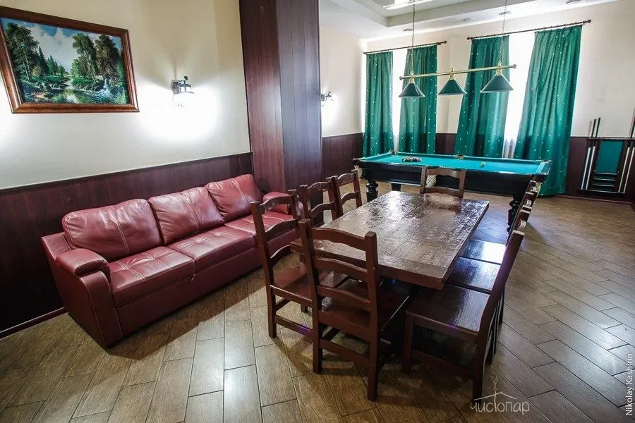 Две сухих финских сауны с панно из гималайской соли. Две деревянные купели с терморегуляцией. Три просторных зала для отдыха. Профессиональное караоке с системой супер-саунд. Аэрохоккей. Американский бильярд. Массажные кресла. Спутниковое TV и Wi-Fi.