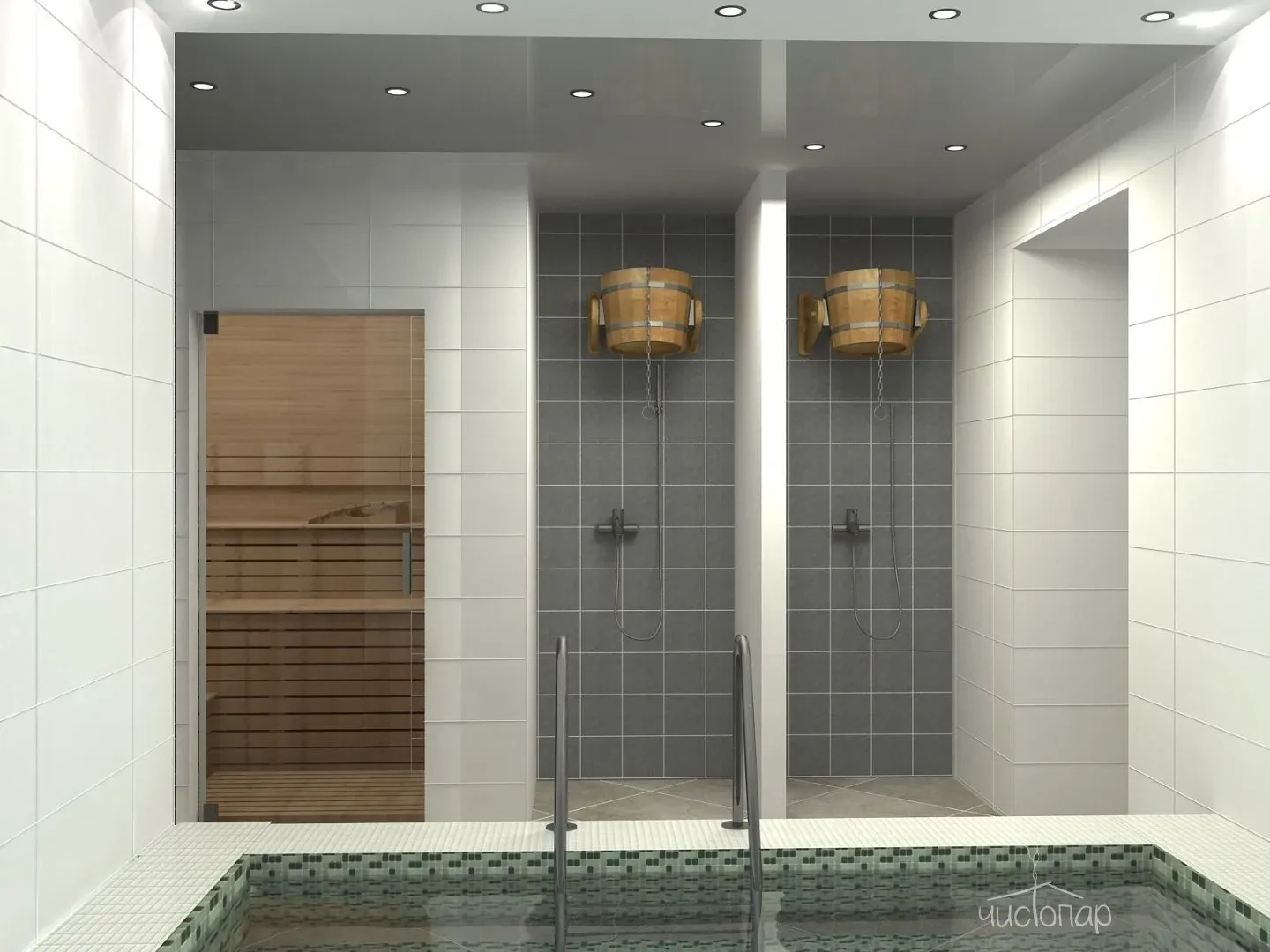 В сауне «Геракл» 2 парилки: финская сауна с LCD телевизором, хаммам с ароматерапевтическим эффектом*, бассейн (3.5 х 3 м, глубиной 150 см) с подсветкой и гидромассажем, 2 обливных ведра и 2 душа, гостевая комната с LCD телевизором, DVD, караоке, телефоном, мини-баром, обеденным столом, диванами и журнальным столиком, комната отдыха. Максимальная вместимость сауны «Геракл» 10 человек.