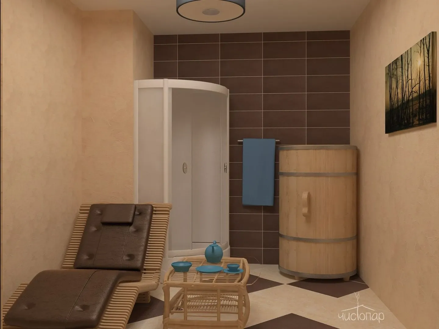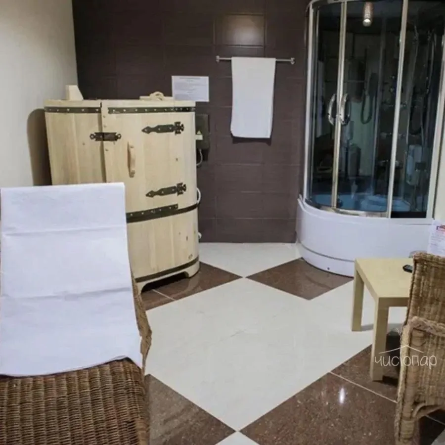 В кедровых бочках «Клеопатра» и «Афродита»*, помимо самой кедровой бочки, находится душевая кабина с гидромассажем, ротанговый шезлонг для отдыха, ротанговое кресло, журнальный столик, LCD телевизор, телефон, фен.