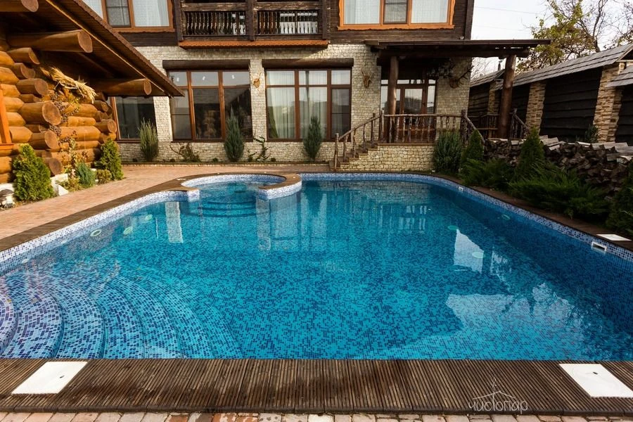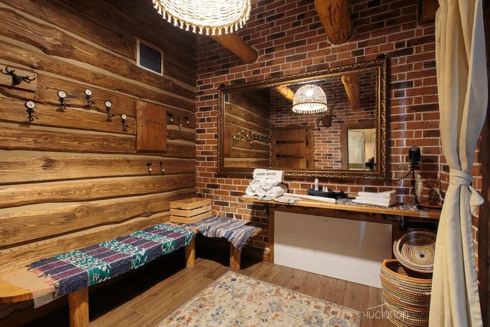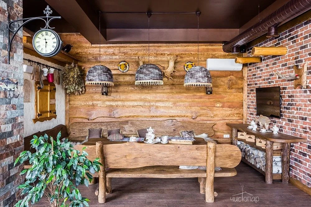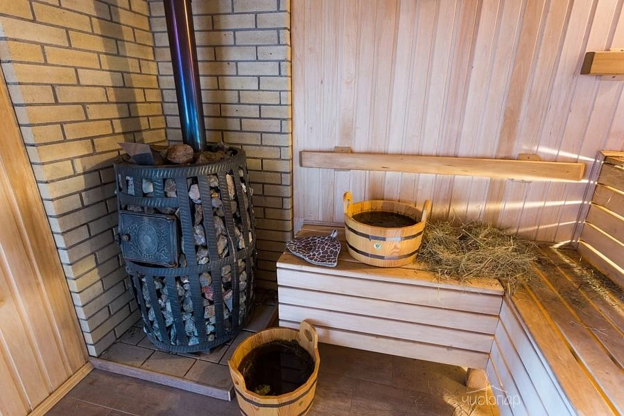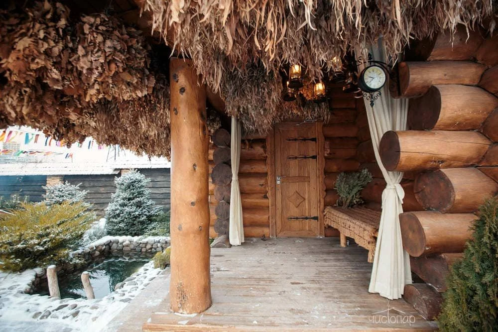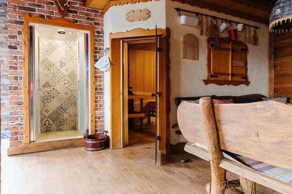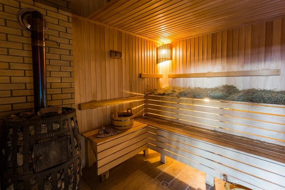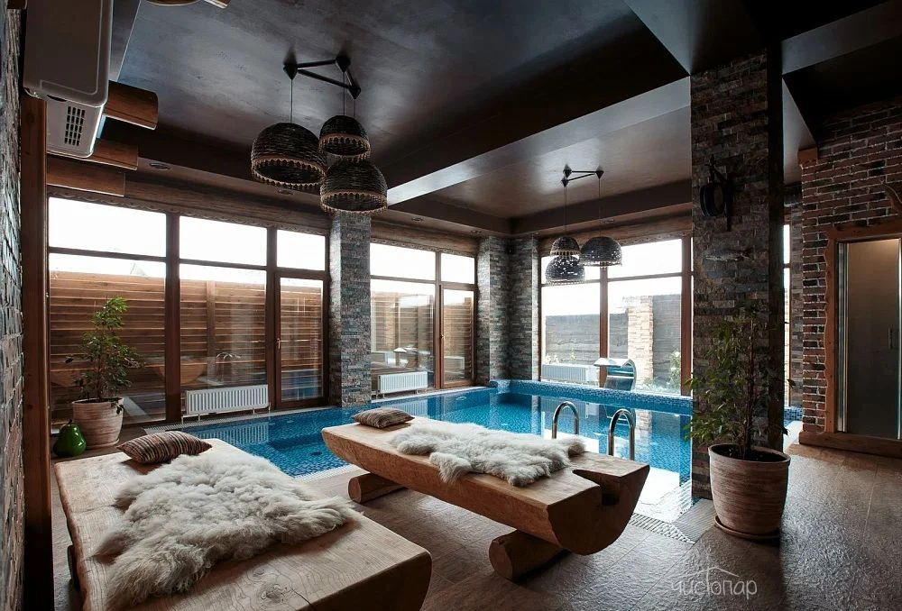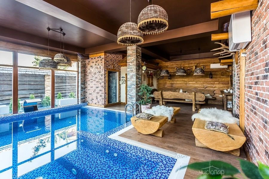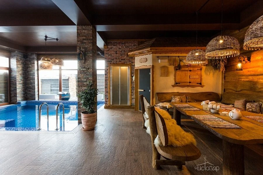 Это русская парная на дровах, крытый бассейн, джакузи и просторное помещение для отдыха.