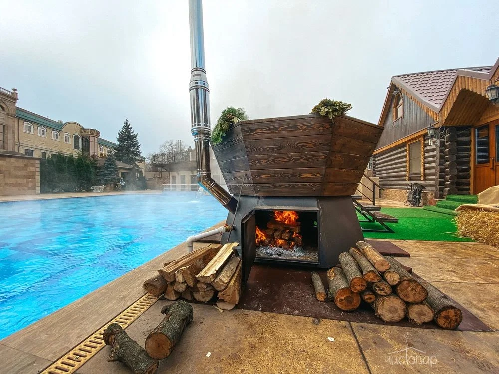 Отличительной чертой бань "Bellagio", помимо русской печи на дровах, служит наличие открытого плавательного бассейна с подогревом до +22 круглый год и молодильного чана, температура воды в котором 40-42 градуса. Окунуться в теплый бассейн после пропарки - истинное наслаждение.