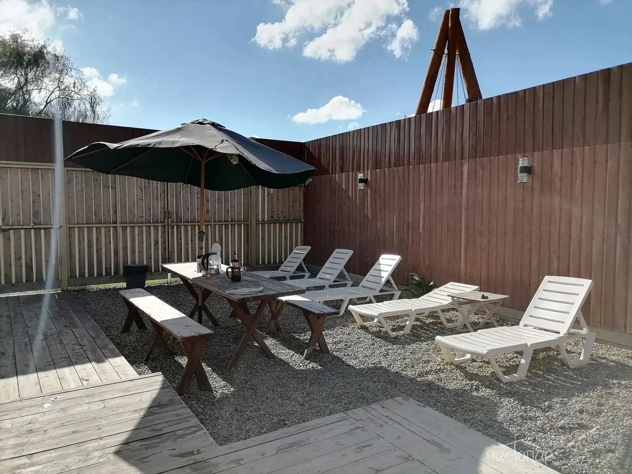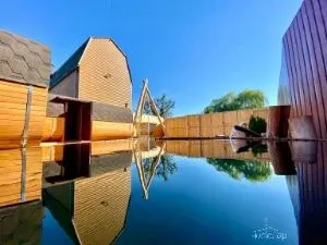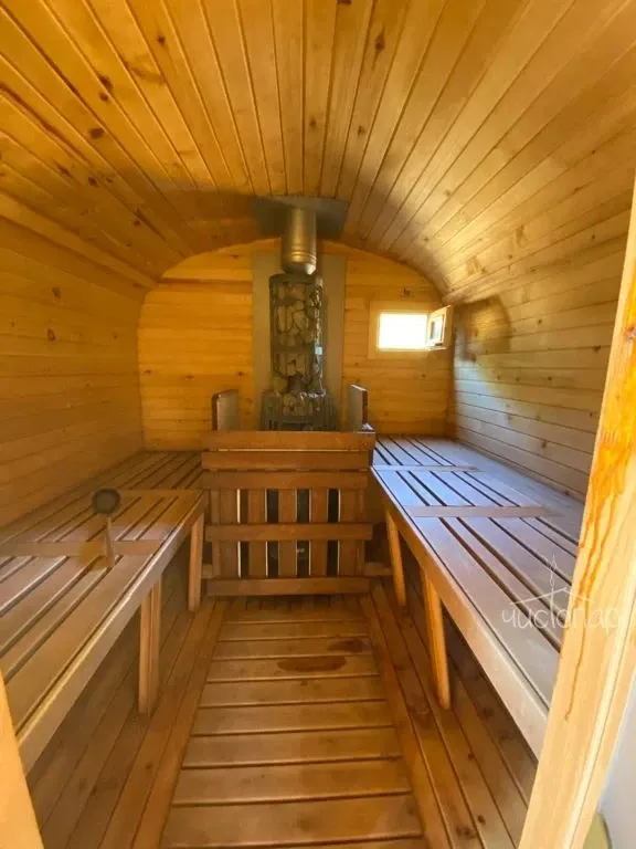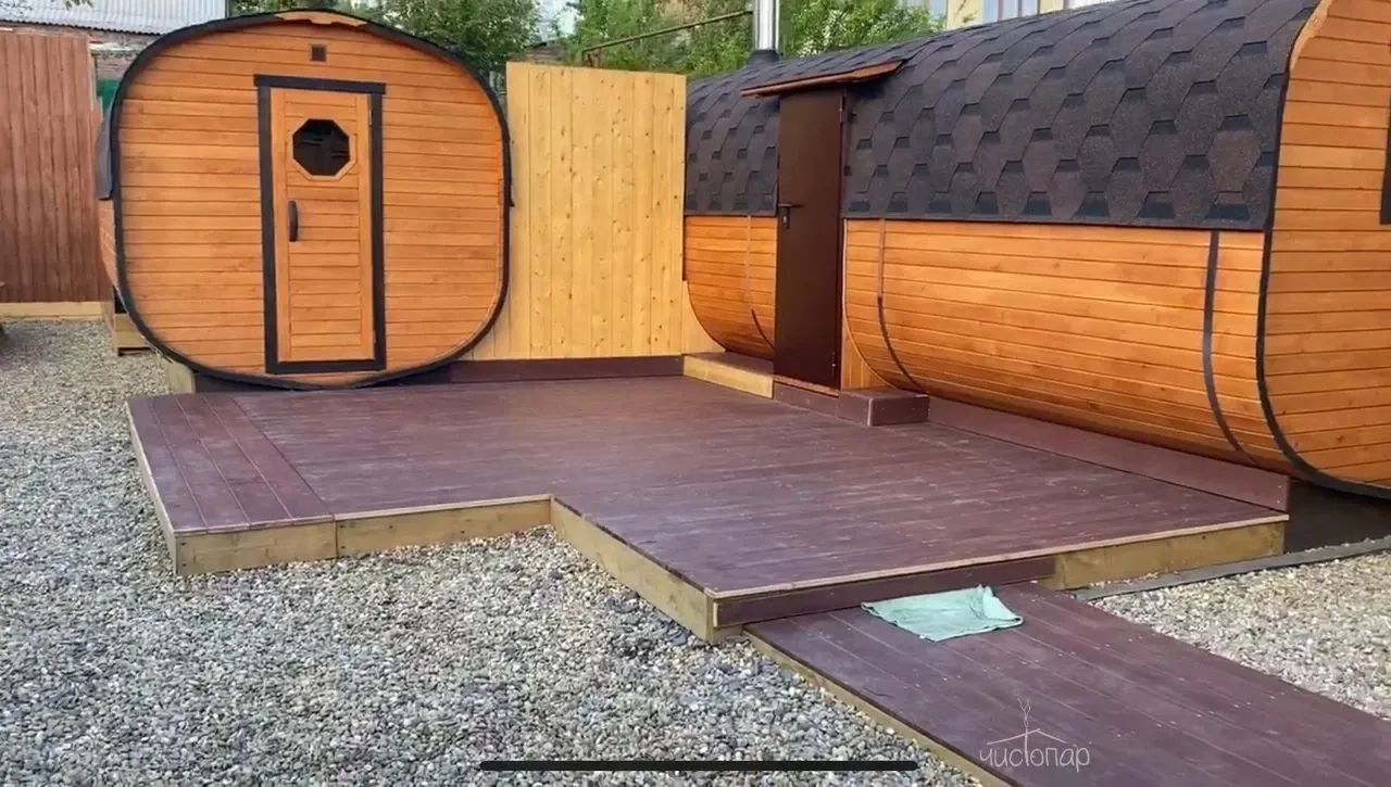 Баня №1Баня № 1 - во дворе два домика. Оба домика для компании. Один домик — это раздевалка, душ, санузел. Второй домик буквально в метре – это сама Баня. В бане: предбанник, душ и тазик для запарки веников. Парная. Комната для чая. Во дворе находится Купель из лиственницы круглая глубиной 1.40 м, диаметр 2.40 м с ледяной проточной чистейшей водой.