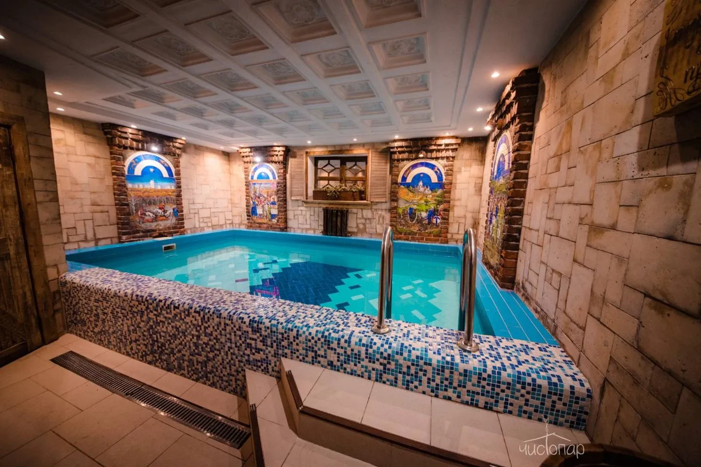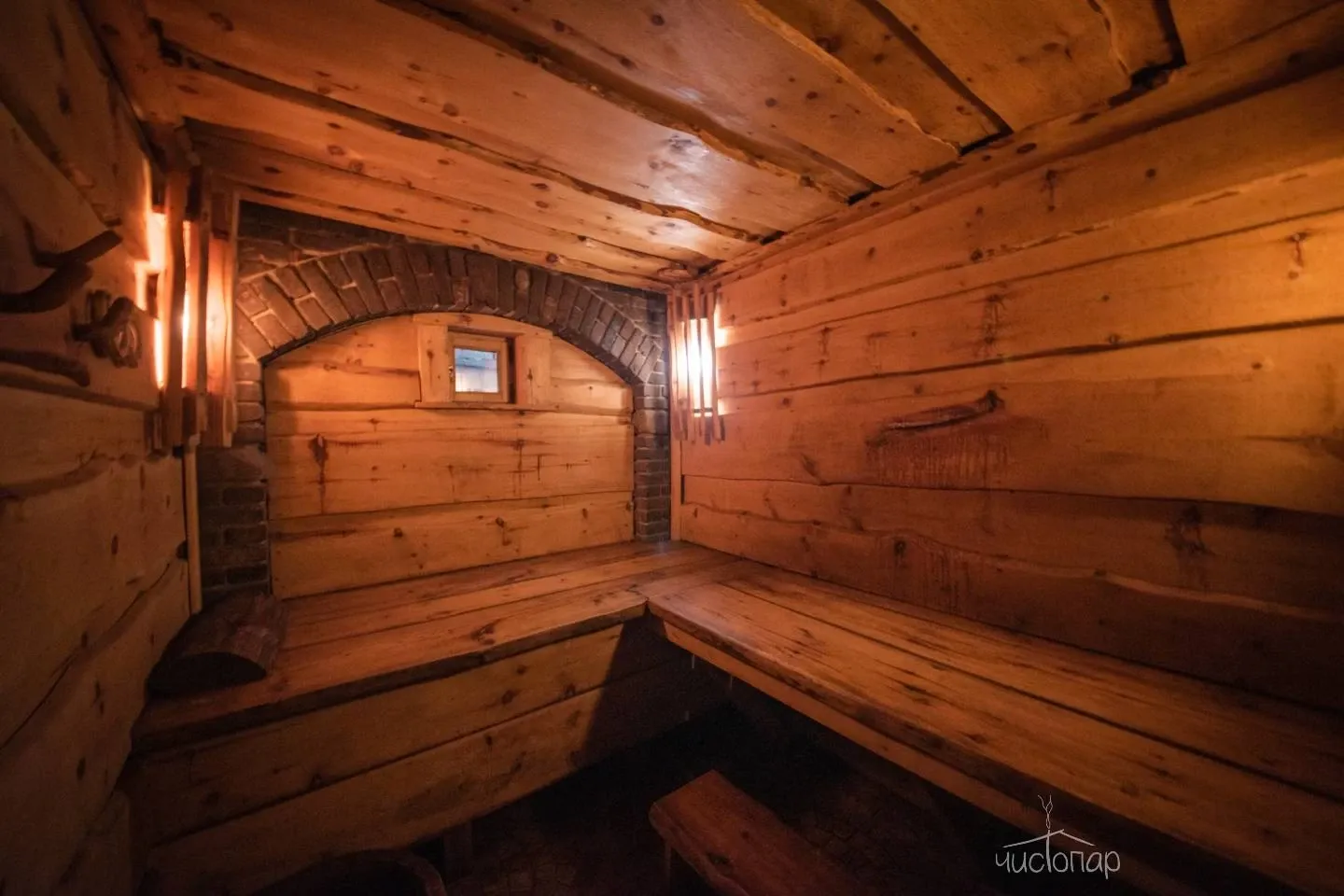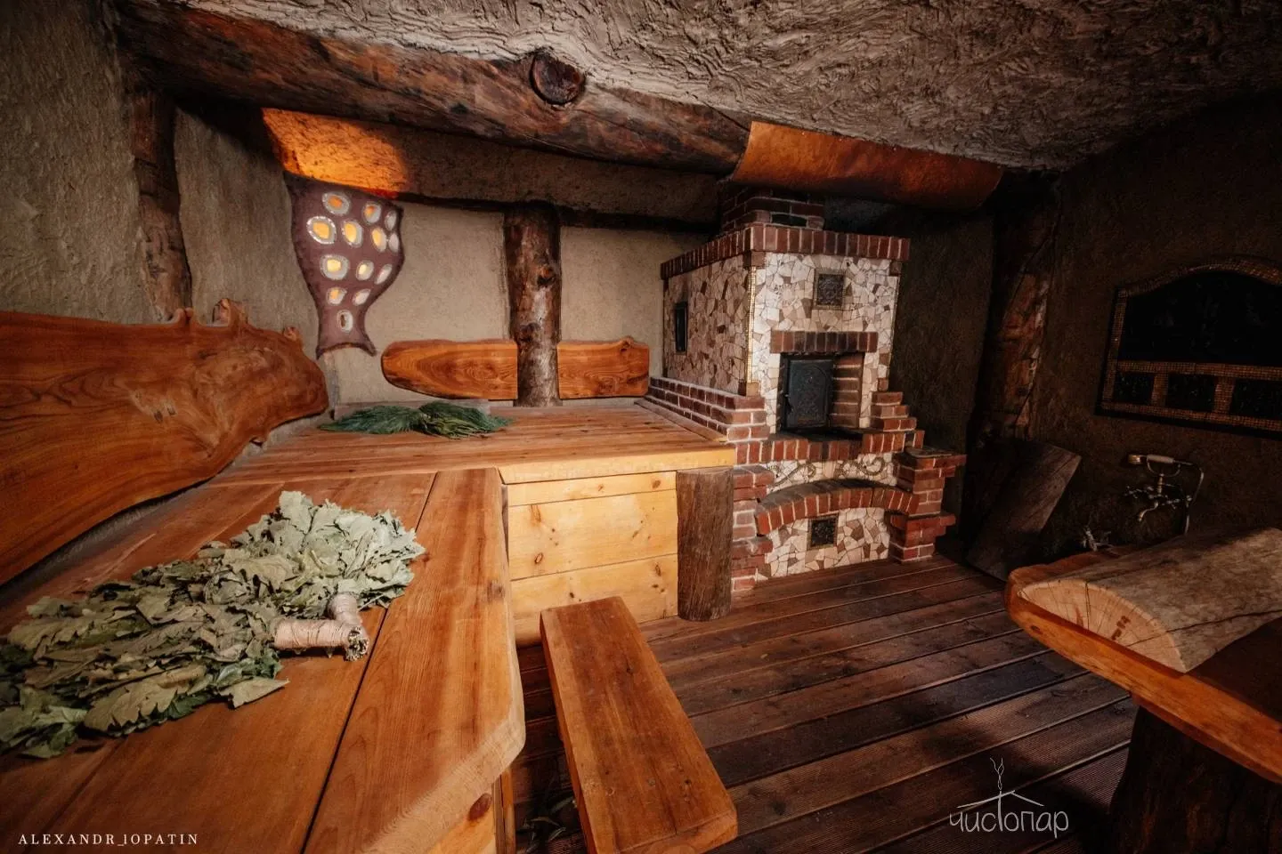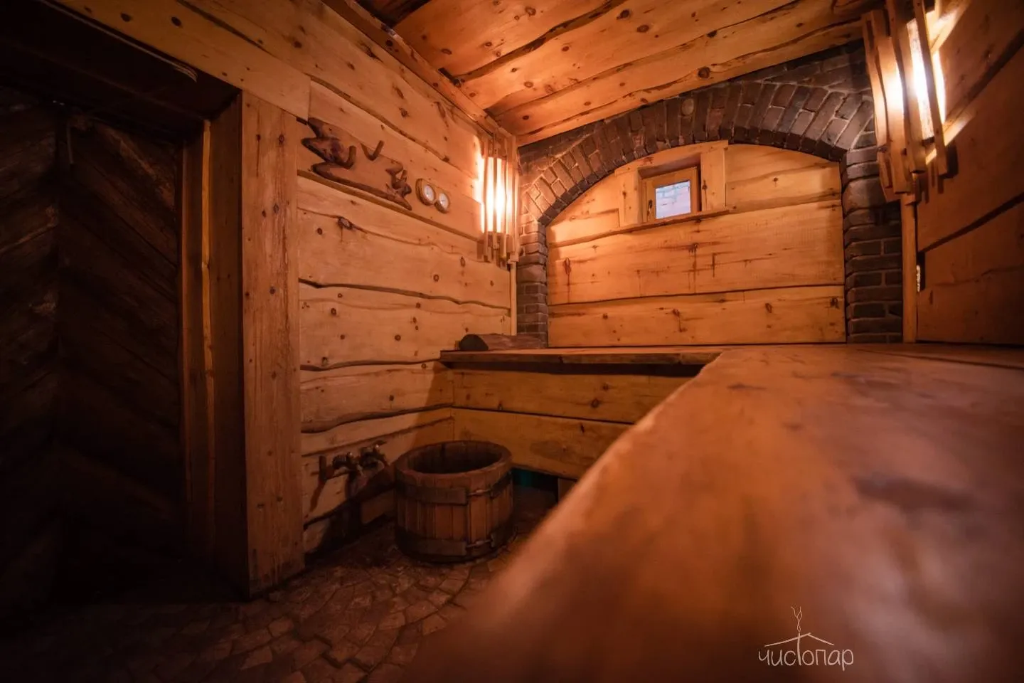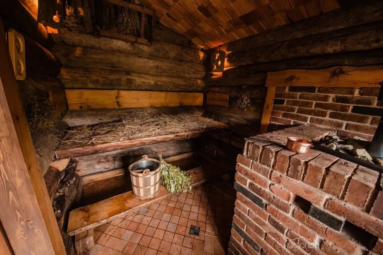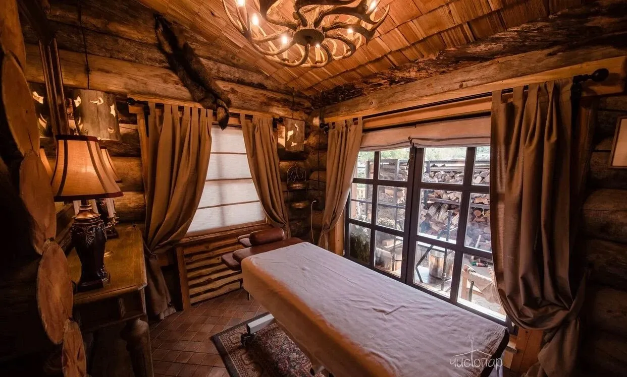 В доме березовая русская парная по-белому и прохладным бассейном на первом этаже. Просторная зона отдыха и чайный стол на втором этаже. Массажный кабинет на третьем этаже (массажный кабинет открывается при предварительном заказе массажа). На Комплексе доступны так же процедуры по уходу за телом – чистки, мойки, обертывания.