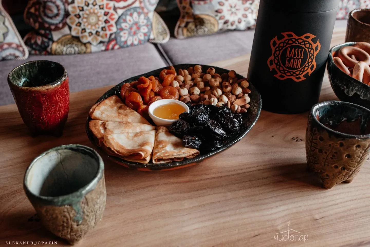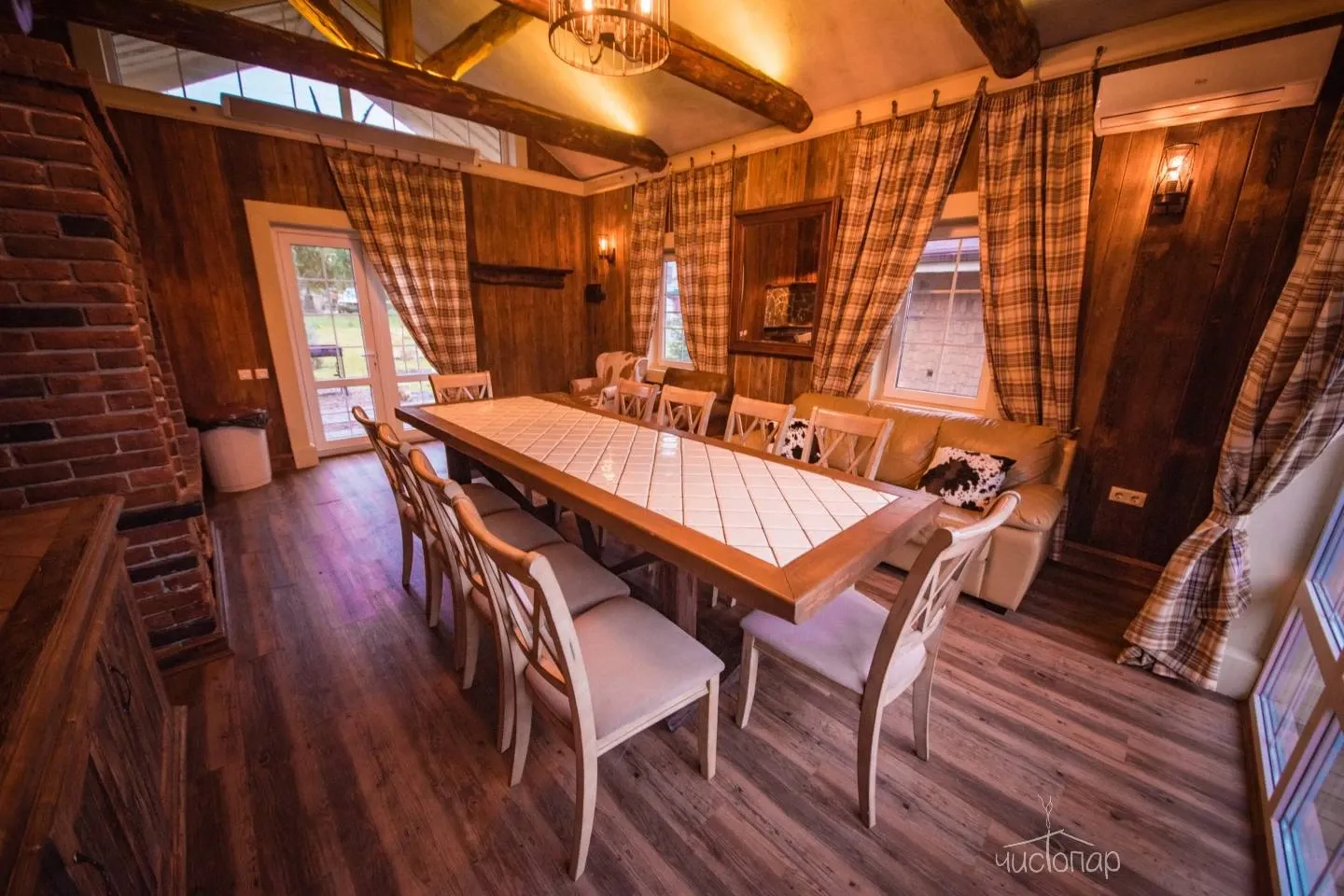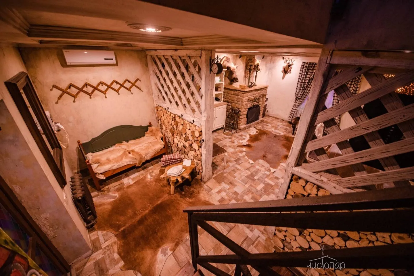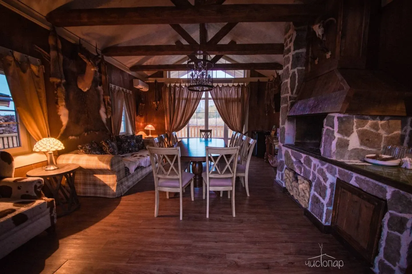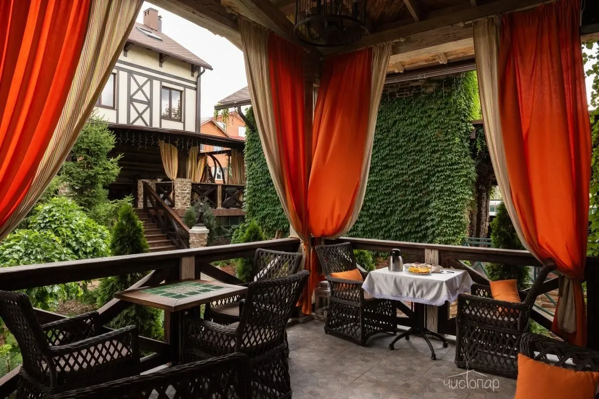 В доме березовая русская парная по-белому и прохладным бассейном на первом этаже. Просторная зона отдыха и чайный стол на втором этаже. Массажный кабинет на третьем этаже (массажный кабинет открывается при предварительном заказе массажа). На Комплексе доступны так же процедуры по уходу за телом – чистки, мойки, обертывания.