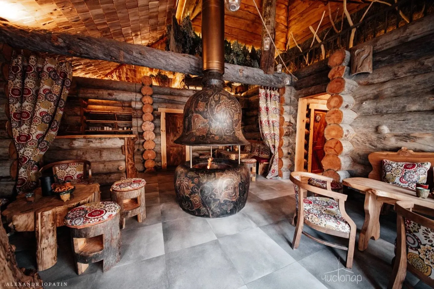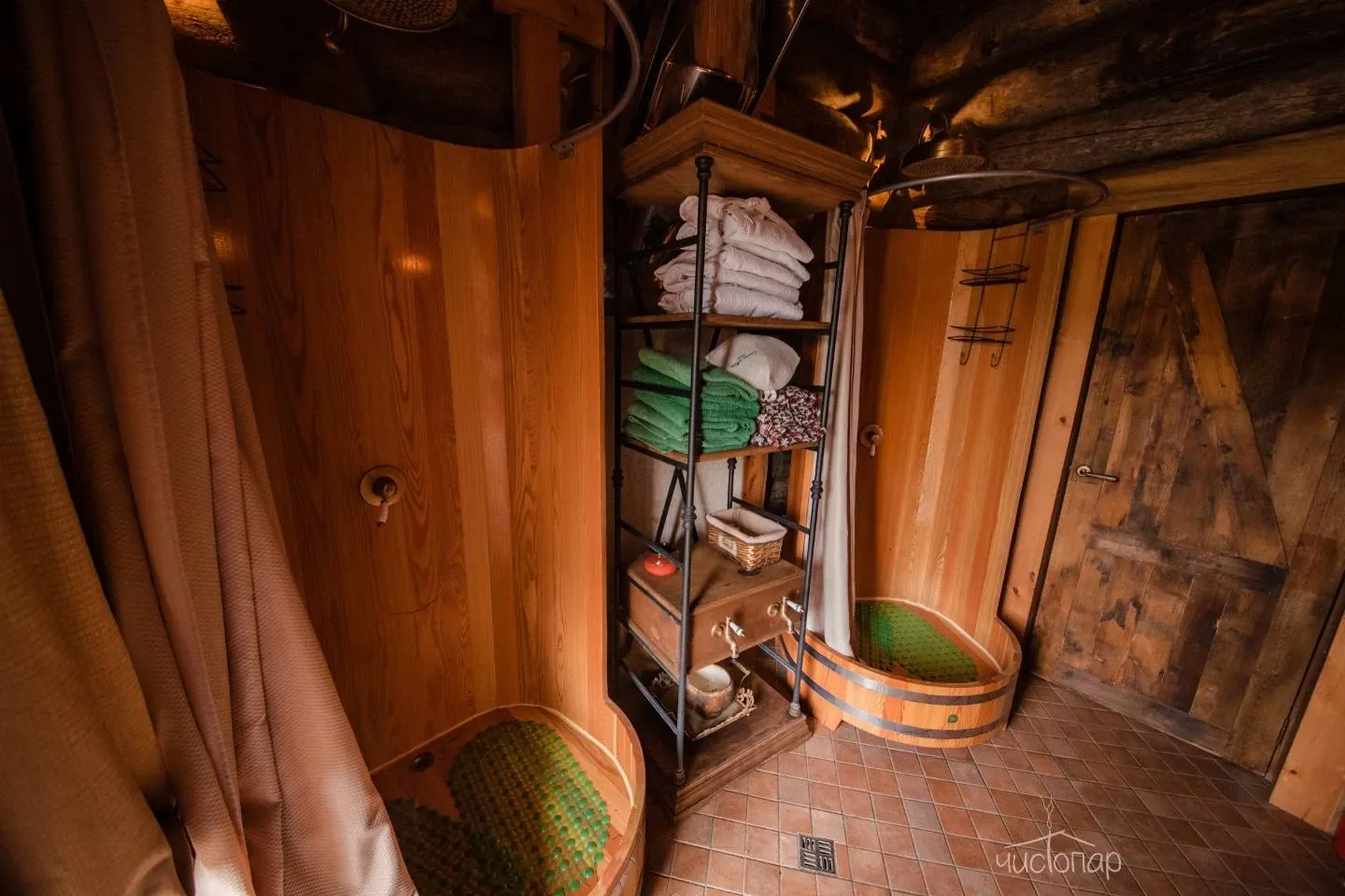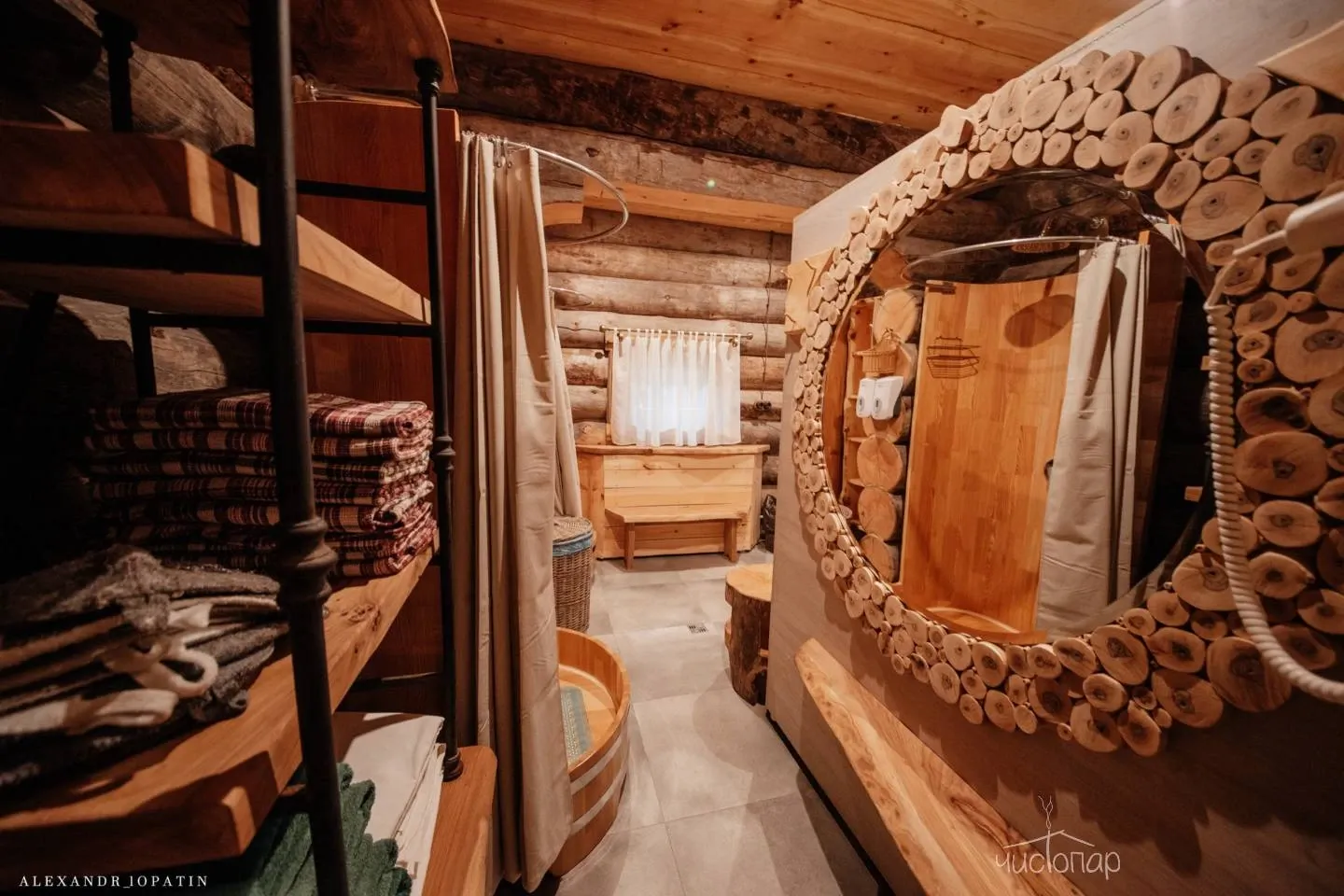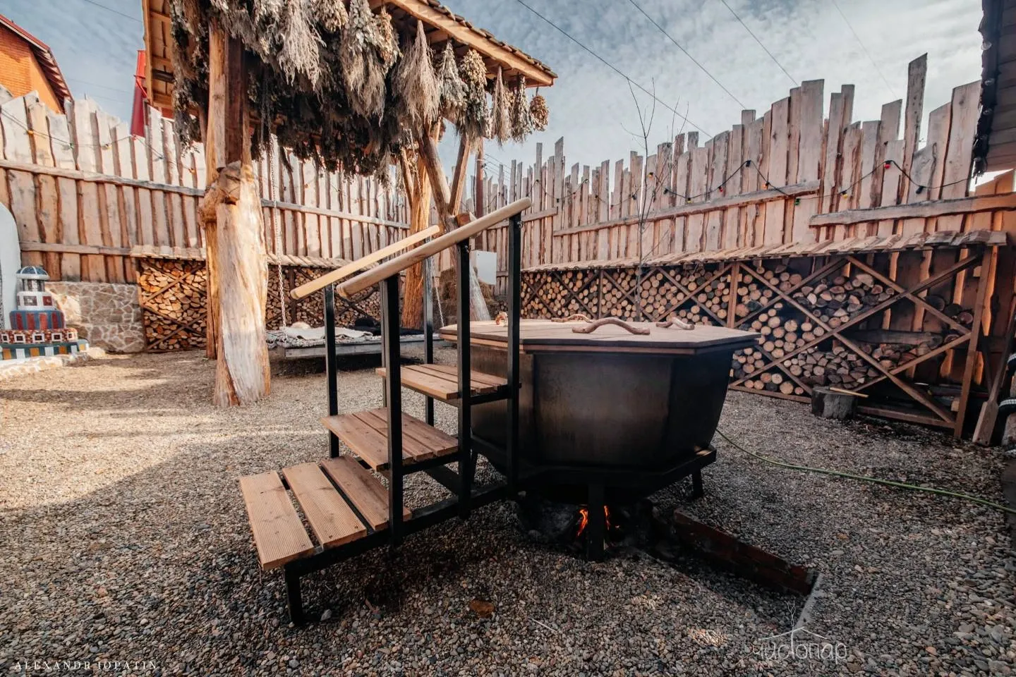 1. Баня «Трофейная». Парная расположена внутри здания и представляет собой русскую парную, относящуюся к разновидности паровых бань, в печи камень жадеит (полудрагоценный камень, привезен из Хакасии). Это баня «по-белому». После парения на просторной террасе с видом имеется купель с холодной родниковой водой и большая бочка о-фуро с горячей водой, которая топится дровами. Так же комплекс располагает массажным кабинетом.