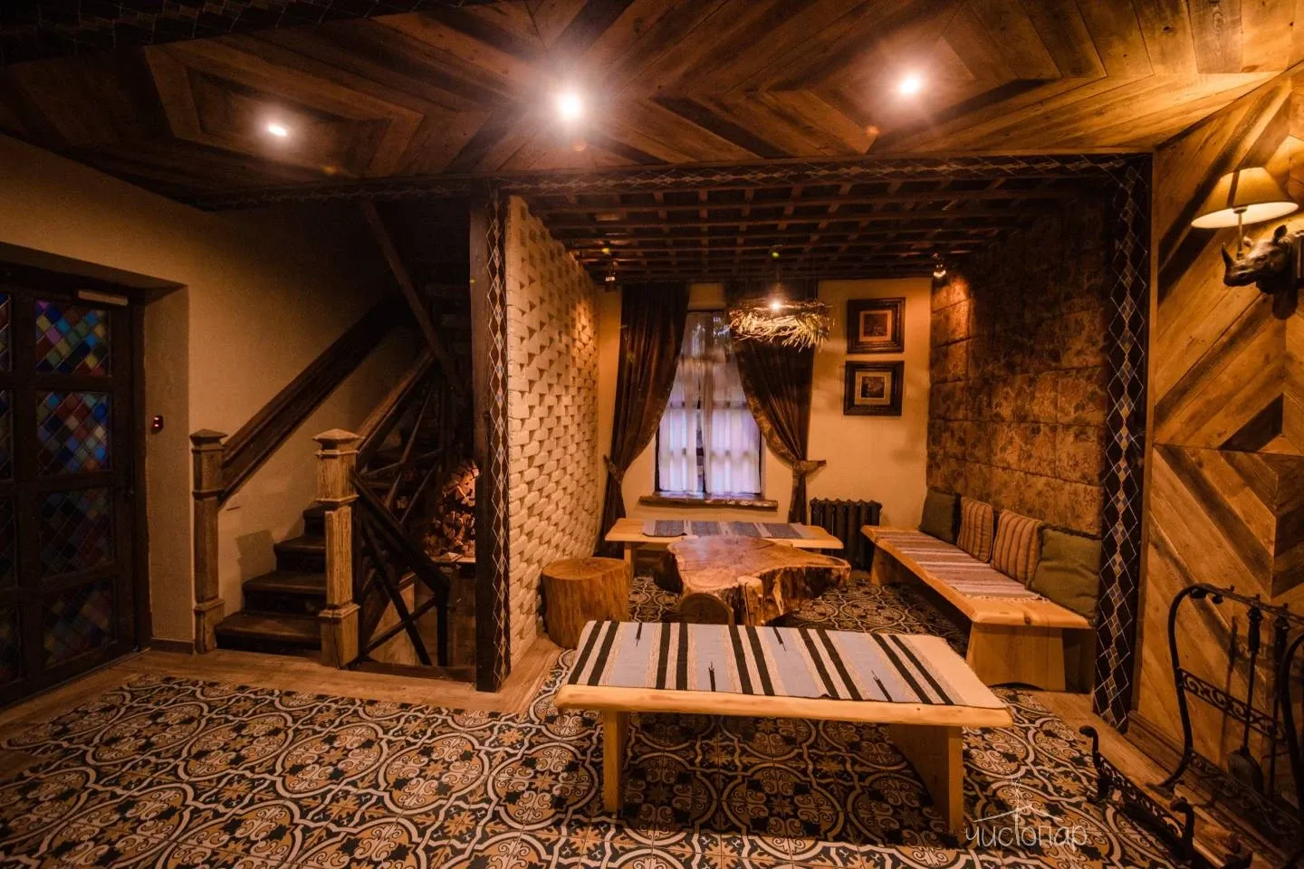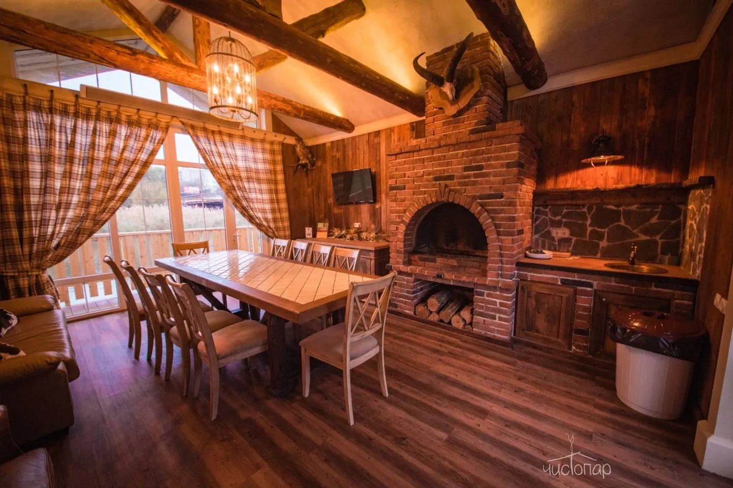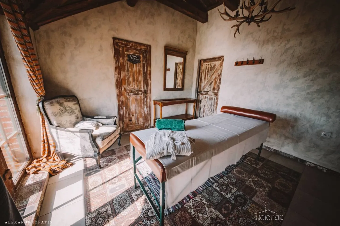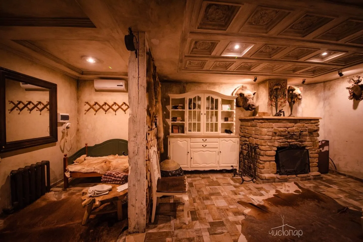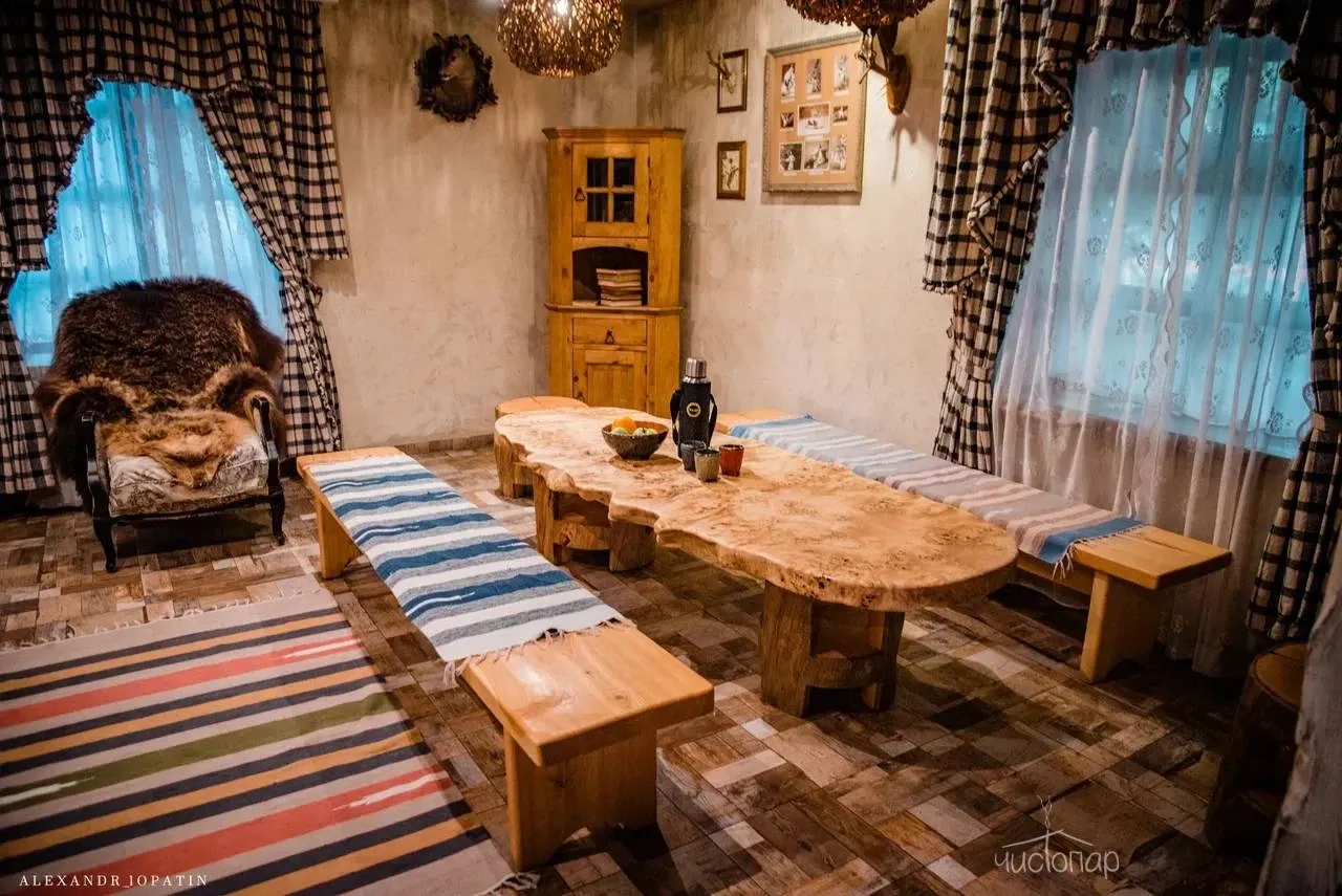 1. Баня «Трофейная». Парная расположена внутри здания и представляет собой русскую парную, относящуюся к разновидности паровых бань, в печи камень жадеит (полудрагоценный камень, привезен из Хакасии). Это баня «по-белому». После парения на просторной террасе с видом имеется купель с холодной родниковой водой и большая бочка о-фуро с горячей водой, которая топится дровами. Так же комплекс располагает массажным кабинетом.