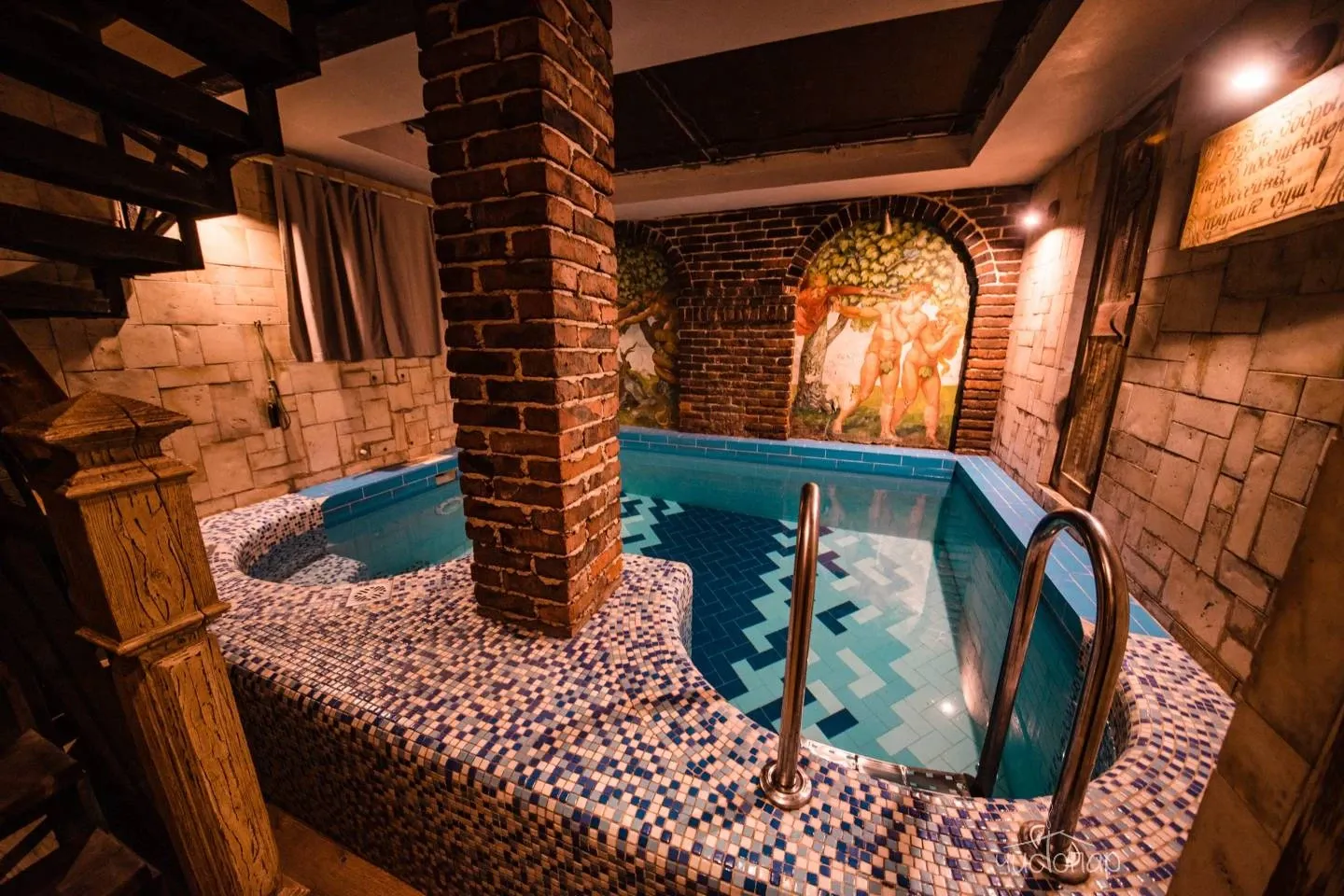 Парения, процедуры по уходу за телом, мойки, скрабы и обертывания здесь проводятся на первом этаже. На втором этаже уютная зона отдыха с большим столом. Чашка чая у растопленного камина, приготовленная по фирменному рецепту, создадут атмосферу полного покоя и расслабления. Третий этаж комплекса представлен массажным кабинетом. Особое наслаждение – после жаркой парной с вениками окунуться в прохладные воды бассейн.