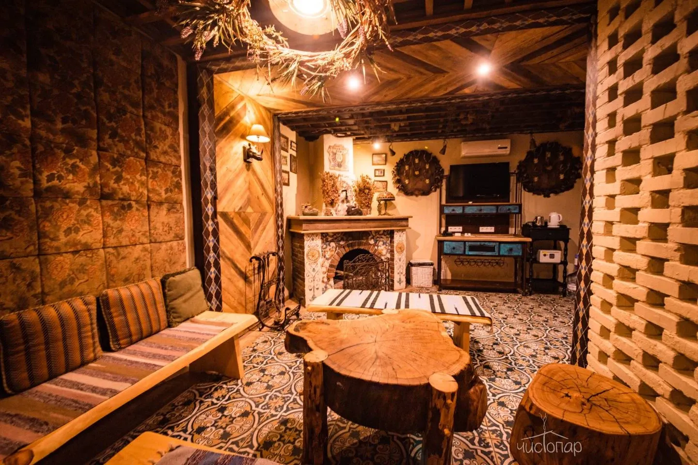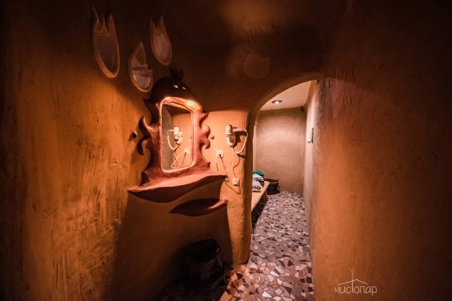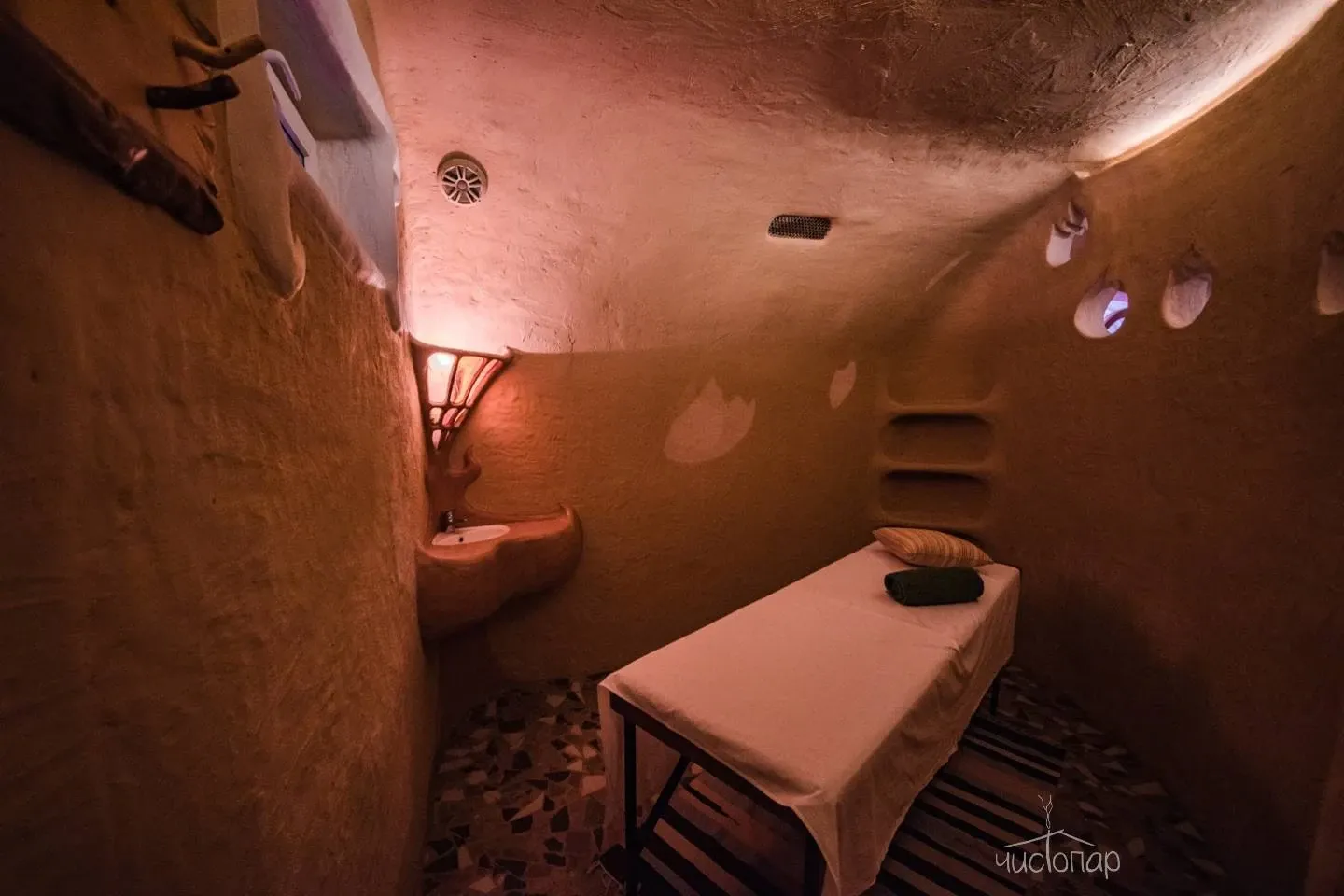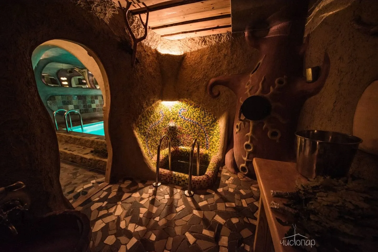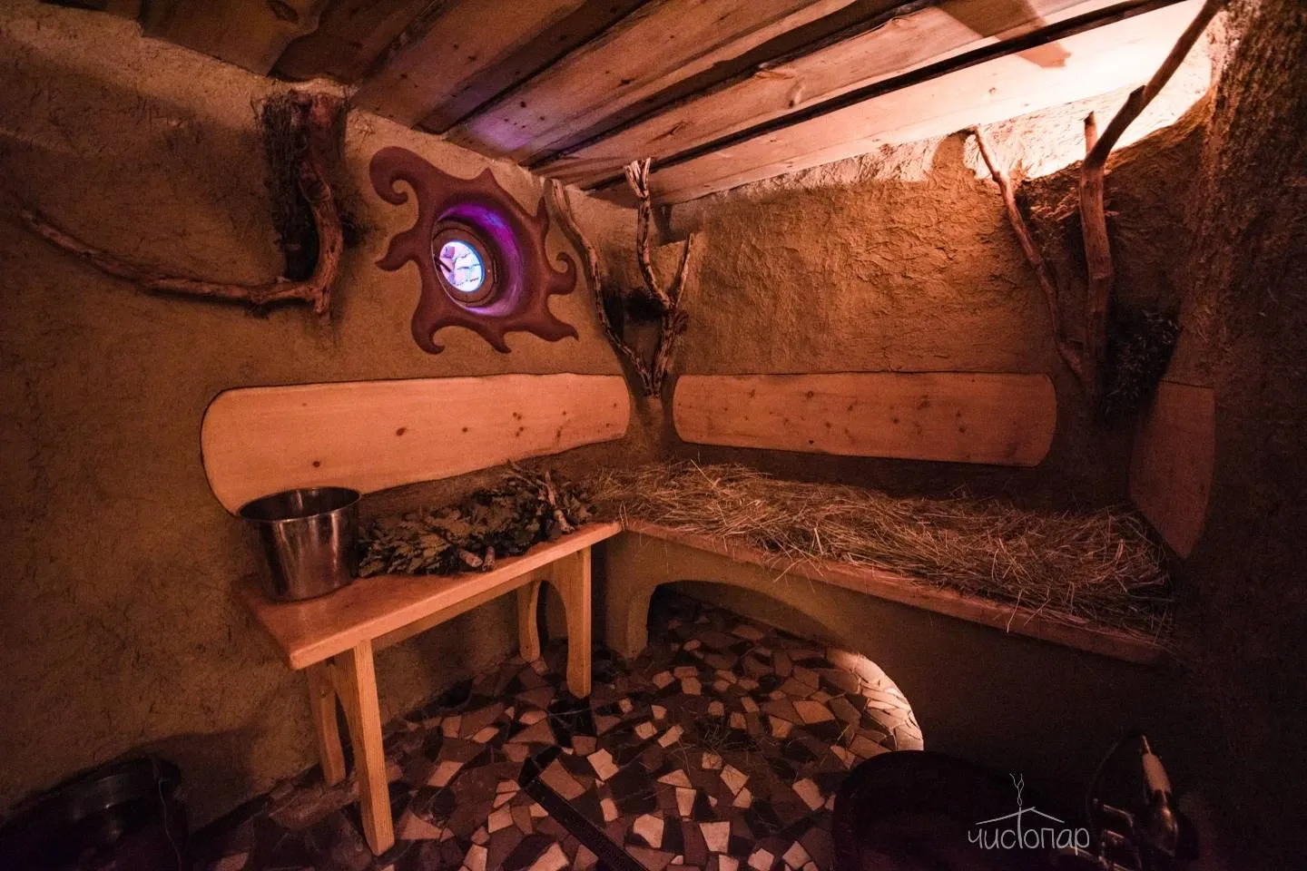 Стены пространства выполнены из глины. Отличительной особенностью парной является то, что в бане находится холодная купель с родниковой водой (температура воды не превышает 7 градусов).Баня НеГолландия подразумевает парения, нежели принятие пищи, поэтому в ней отсутствует холодильник и телевизор.