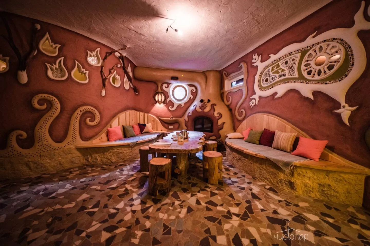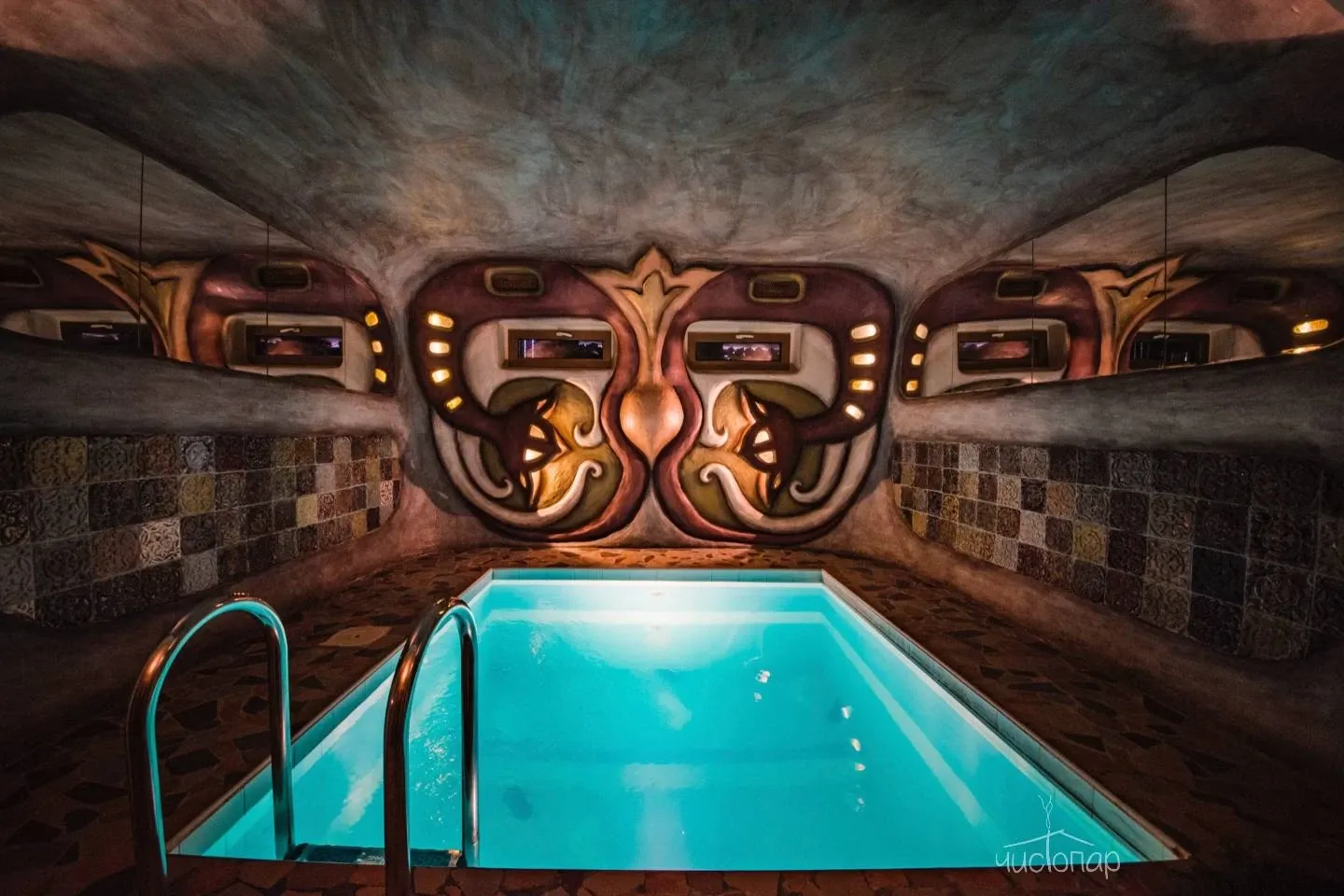 3. Баня «НеГолландия» занимает весь цокольный этаж Семейного корпуса Отеля, площадь бани 90м2. Баня отличается обилием ярких красок, что создает ощущение сказочности.