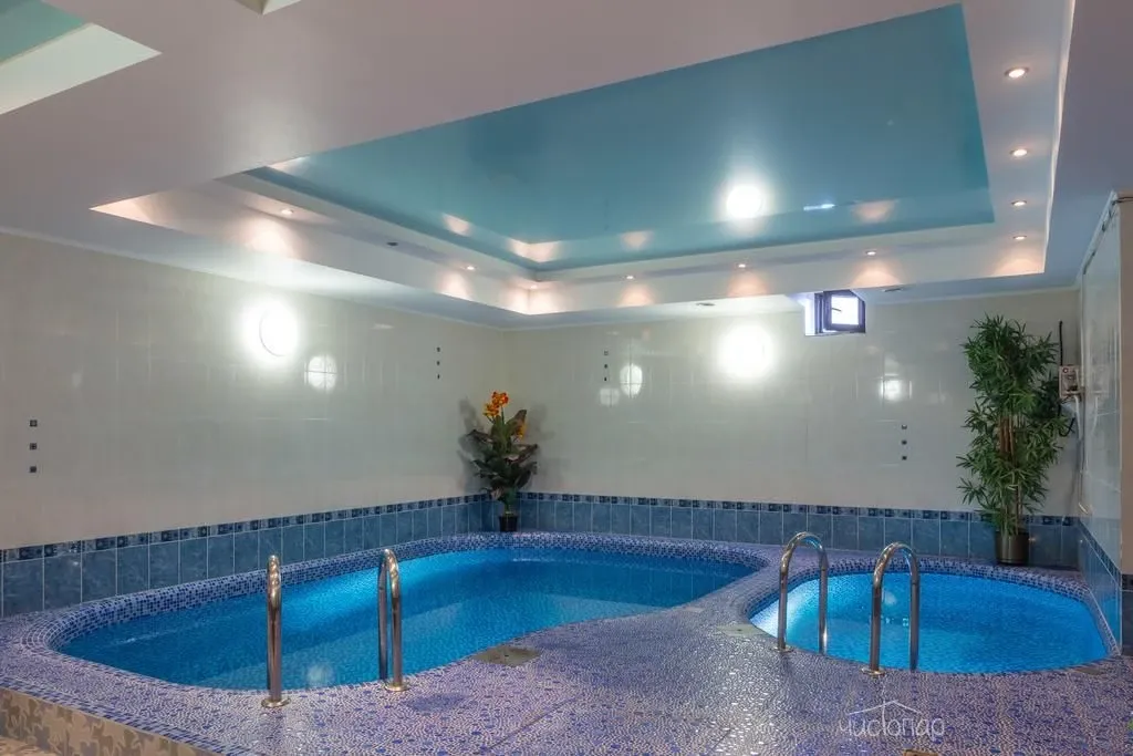 Также 2 бассейна с теплой и холодной водой, раздевалки, сейфом для ценных вещей, комнатами отдыха с кондиционерами, телевизорами.