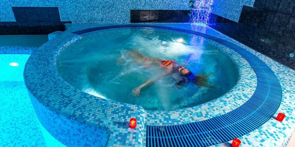 Комплекс поделен на несколько зон, где можно отдыхать, никого не беспокоя. В бассейнах имеются такие интересные опции, как искусственное течение, водопад, гейзер, гидромассаж - своеобразный уютный аквапарк, 5 разных душевых и санузлы на всех этажах.