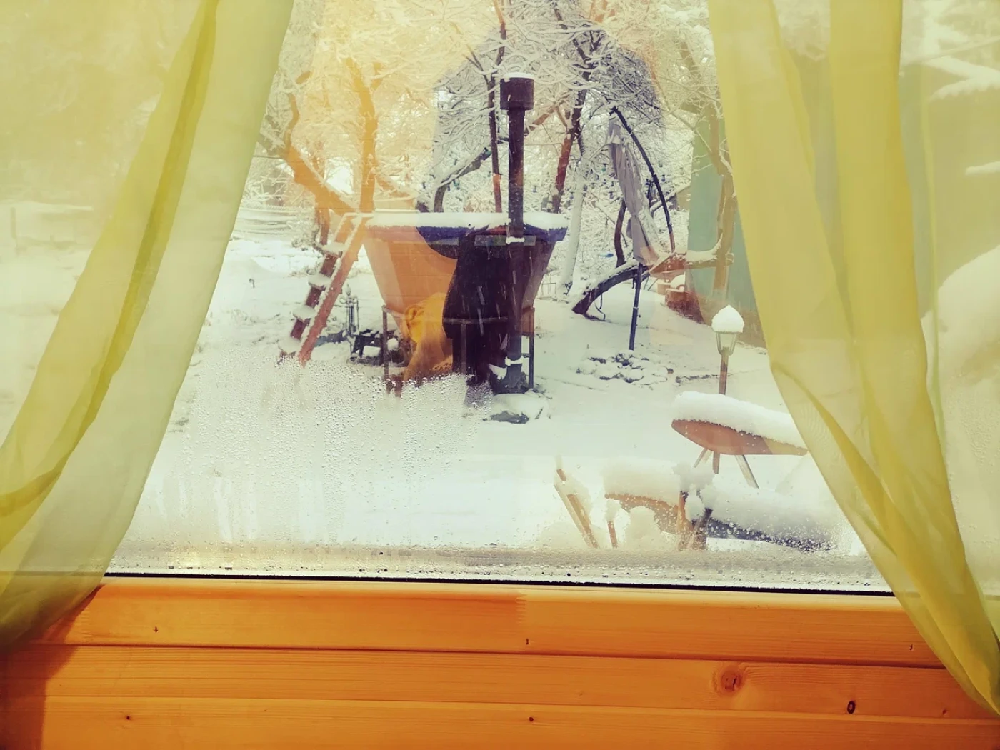 Банный чан на дровах: расположен на свежем воздухе прямо перед вашей террасой. Вода в чане прогревается до комфортных 38–42 градусов.