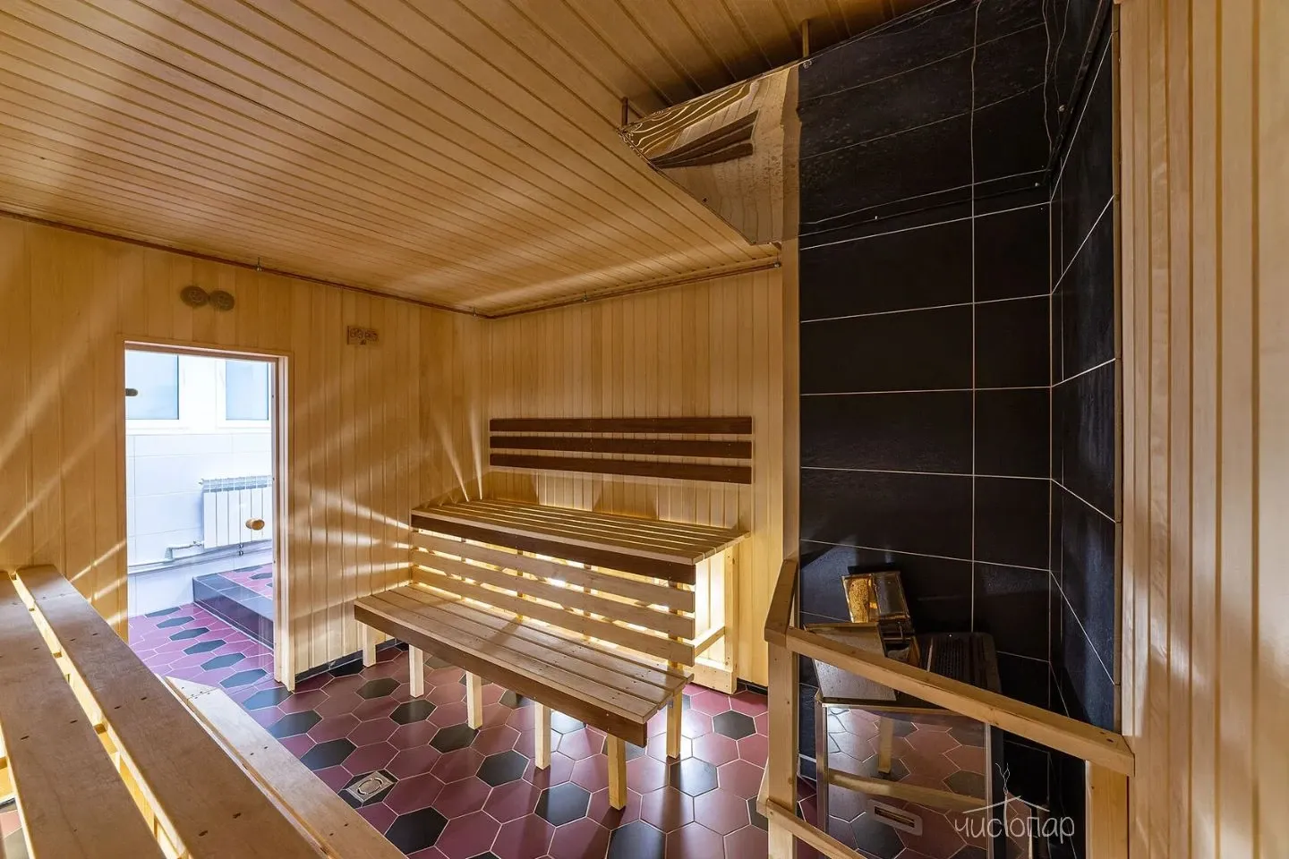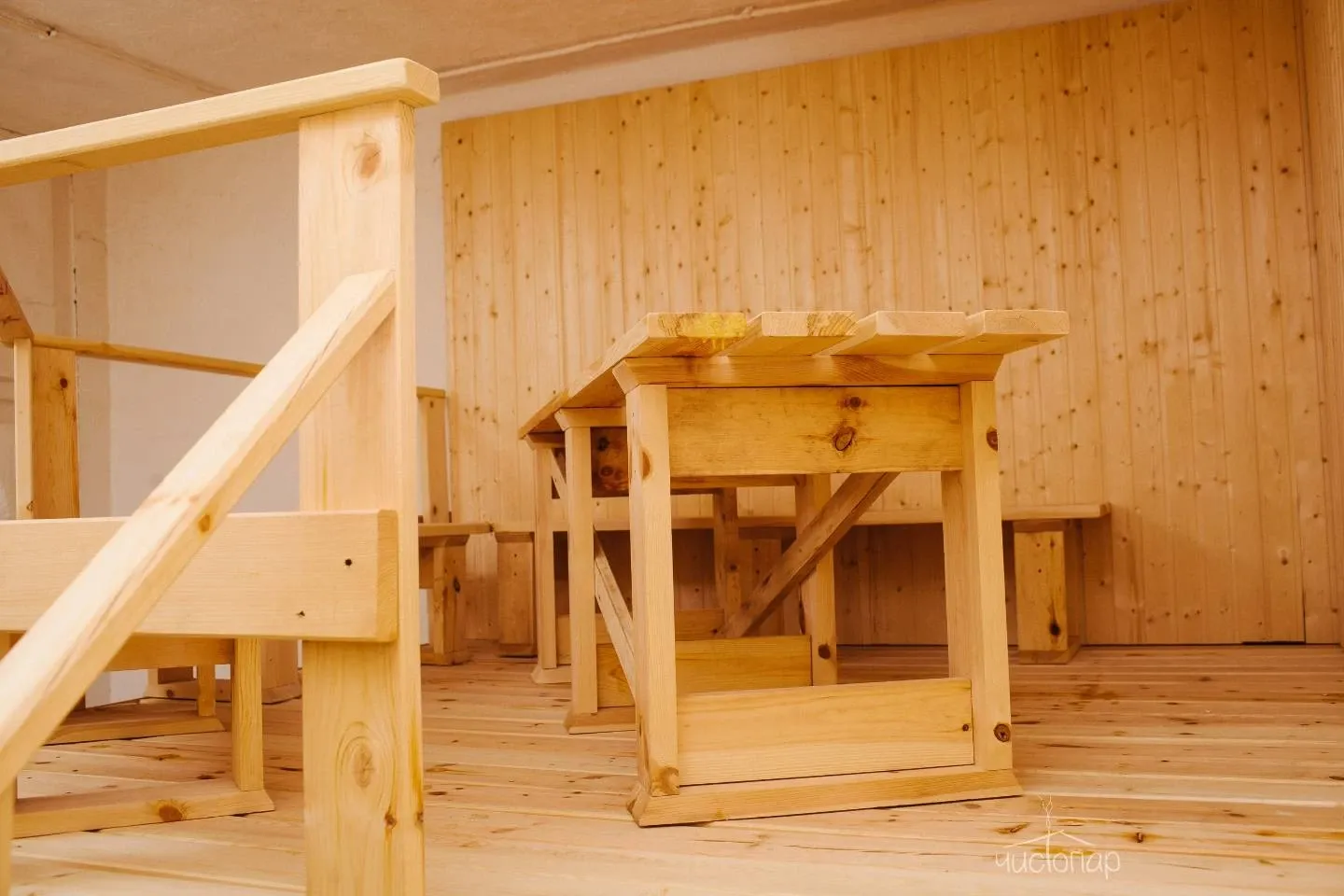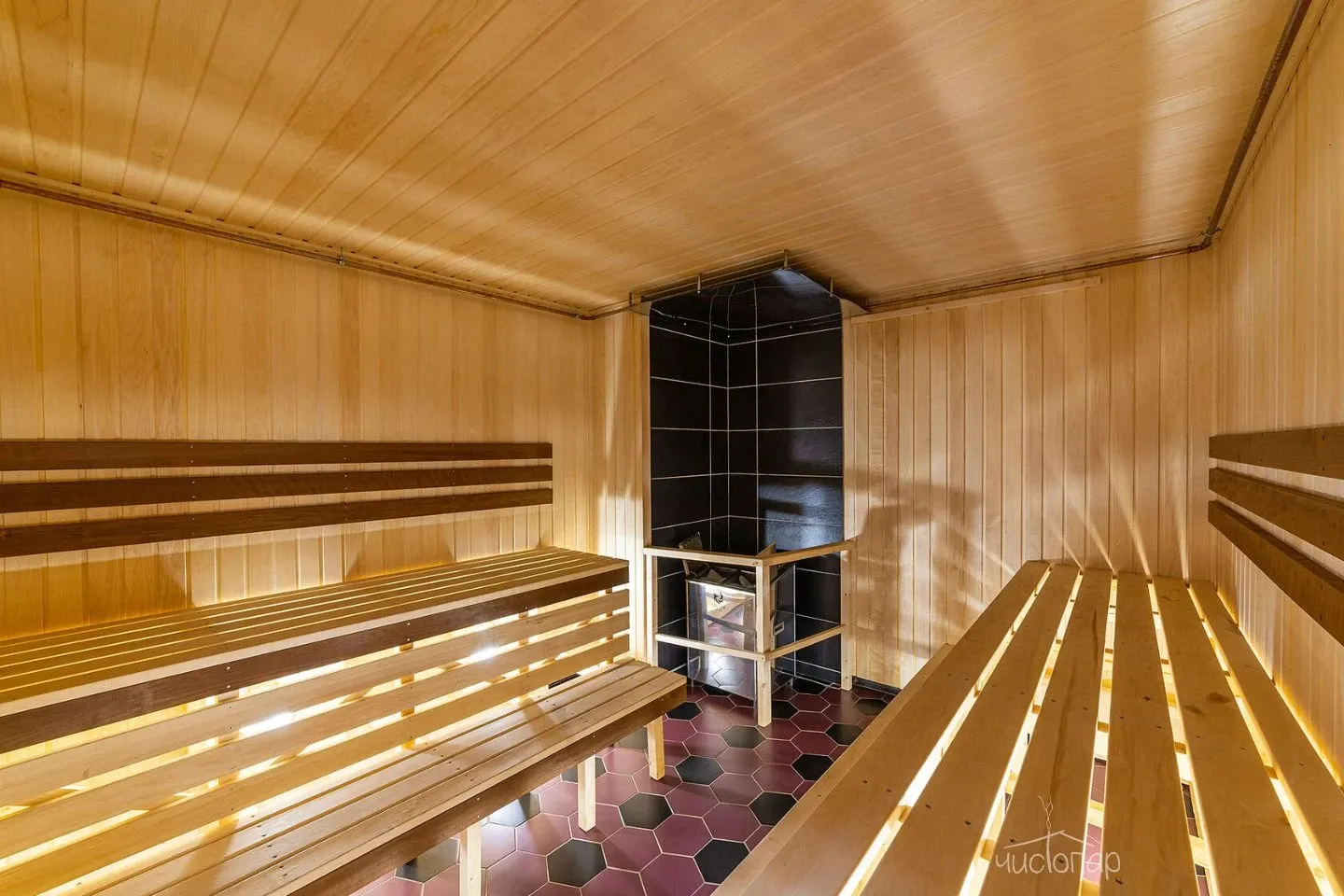 Аутентичное пространство, выполненное в карельском стиле, включает в себя: парную, две купели - теплую и холодную, душевые и туалет, две раздевалки, сенник для отдыха, большую комнату со столом. Возможность заказать услуги и еду из ресторана на 1 этаже, включая специальное карельское меню.