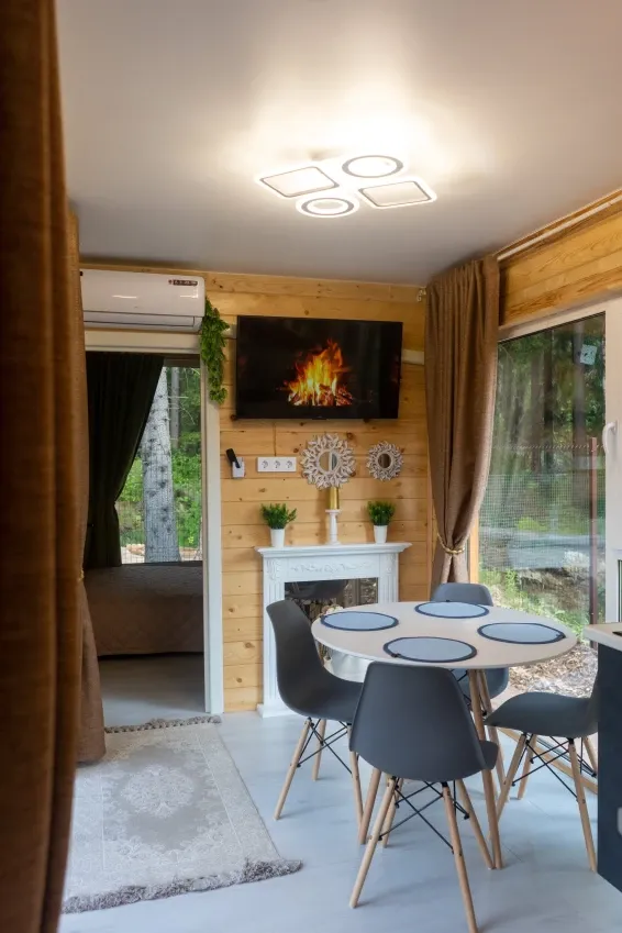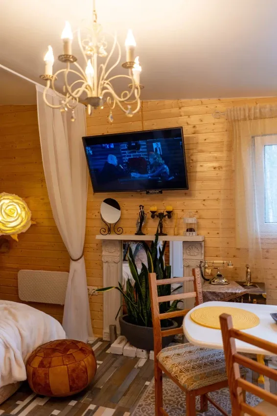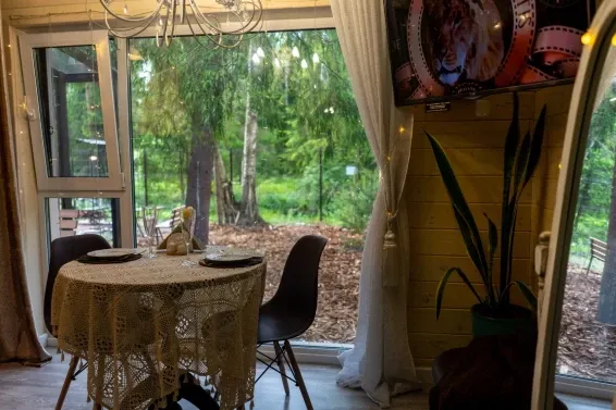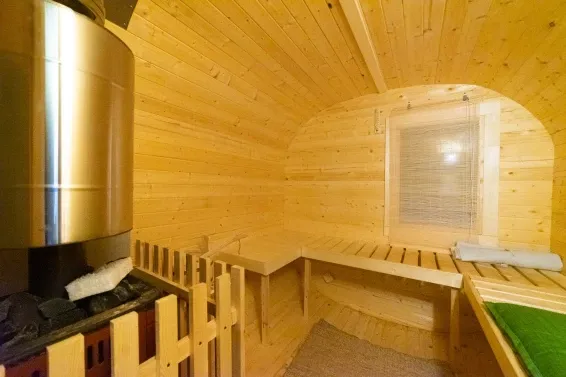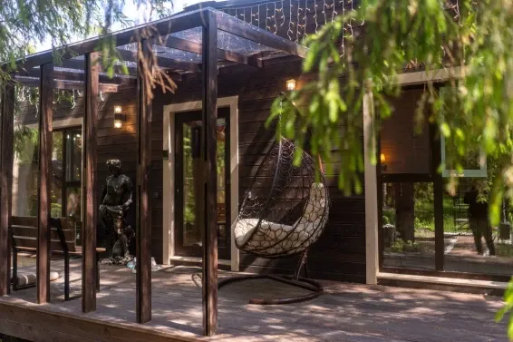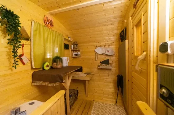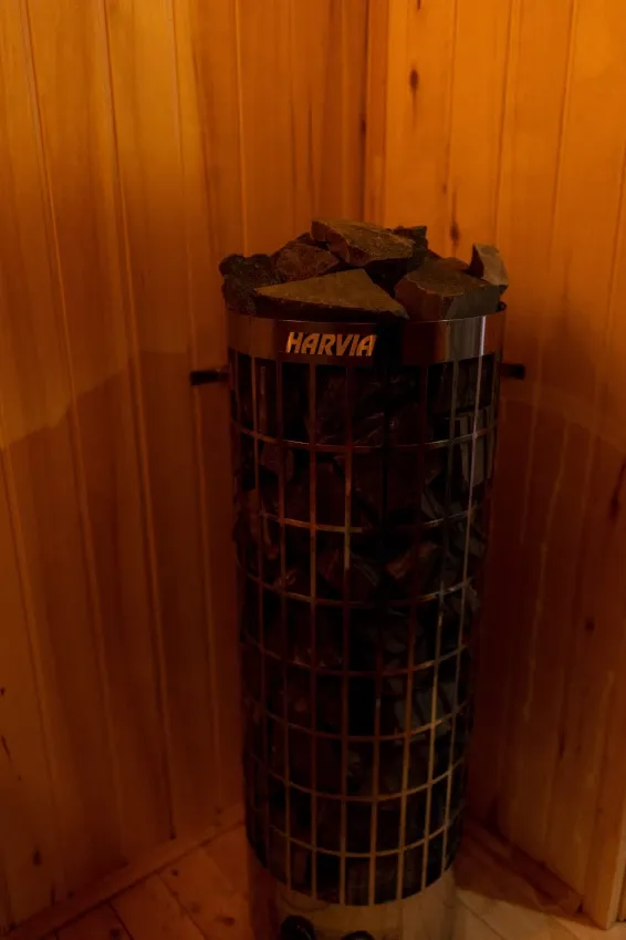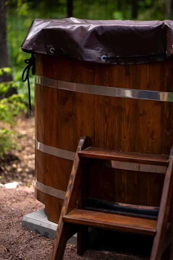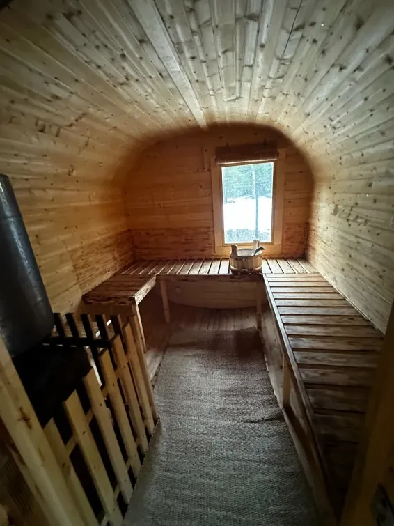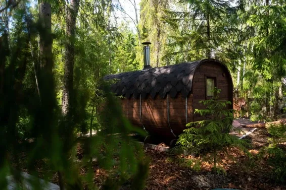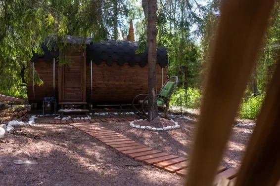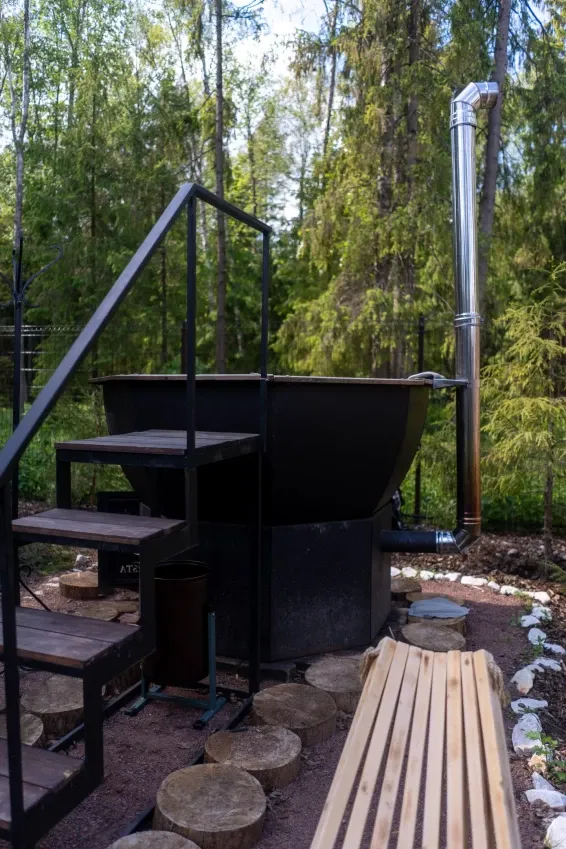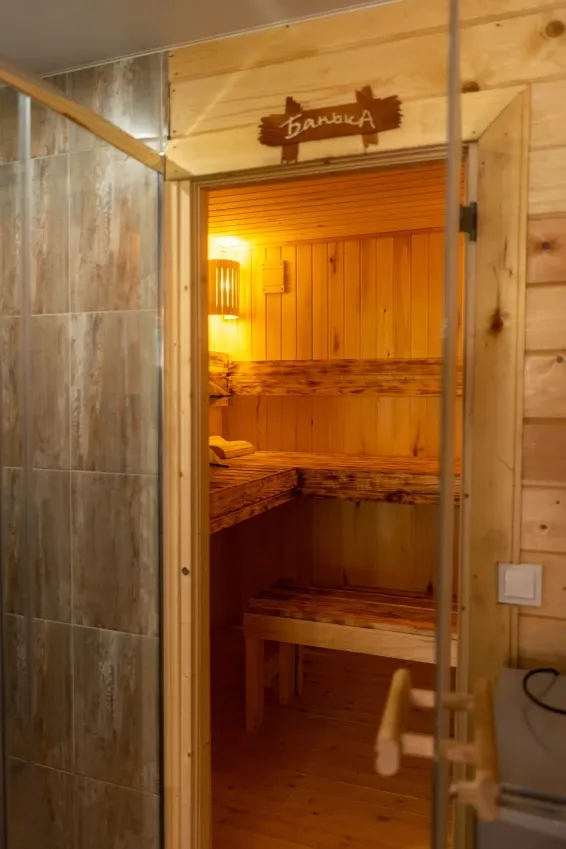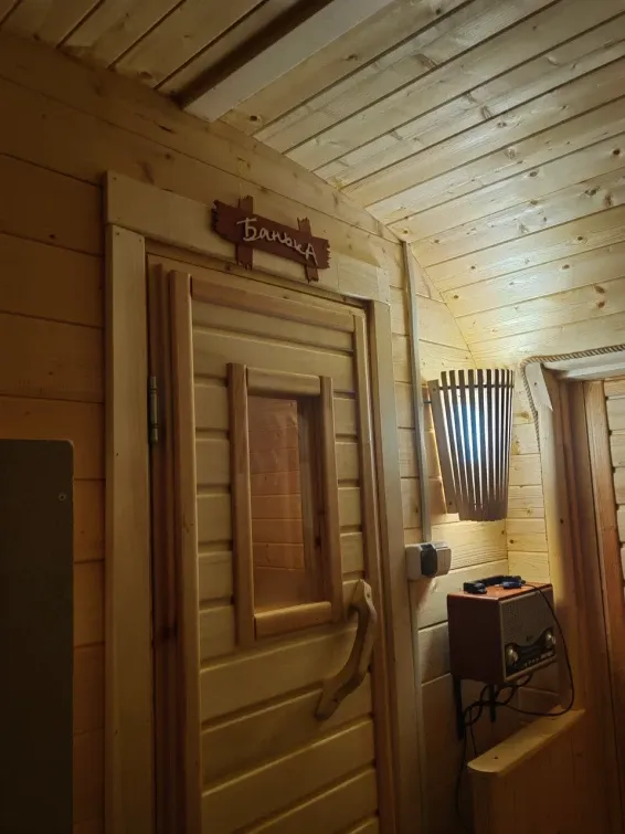 На территории комплекса есть уютная банька (сухое парение), купель, чан с горячей артезианской водой на улице в окружении леса.