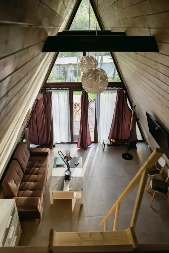 1 этаж: оборудованная кухня с большим обеденным столом, всей необходимой посудой/техникой и лаундж-зона с камином, креслами, кожаным диваном и TV.