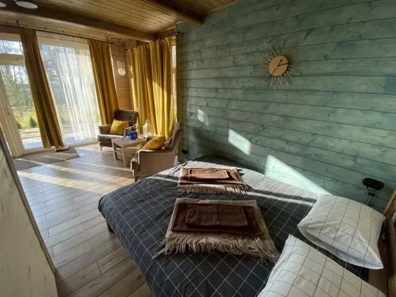 В стоимость включены завтраки в кафе, пользование сауной, дрова для камина, средства для душа, фен, полотенца.