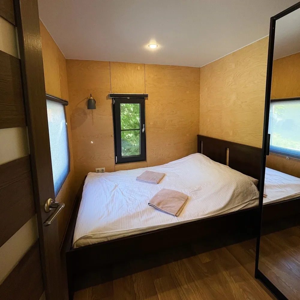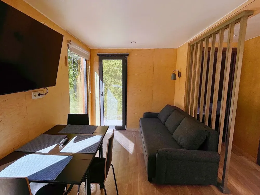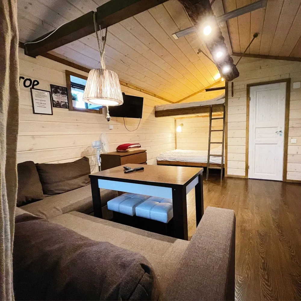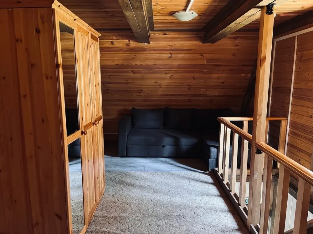 Два двуспальных места расположены друг над другом. Чтобы разместить дополнительного гостя, в шале есть диван-кровать, который можно разложить в спальное место.