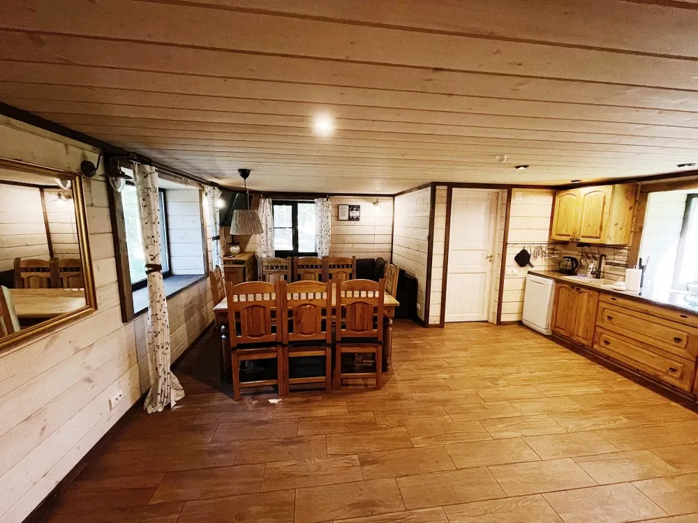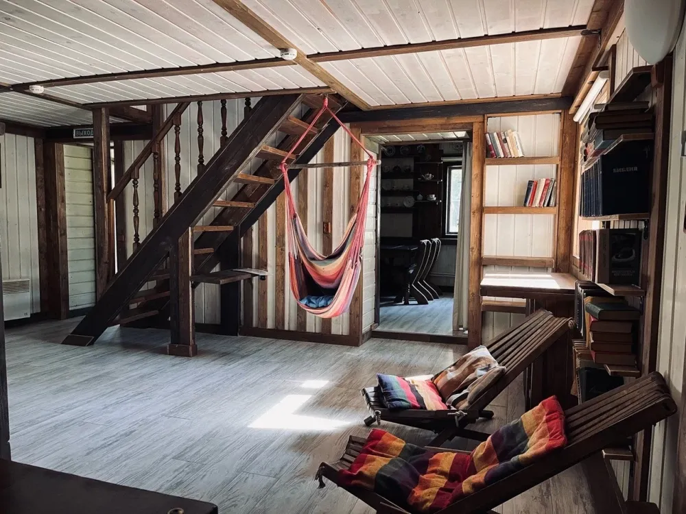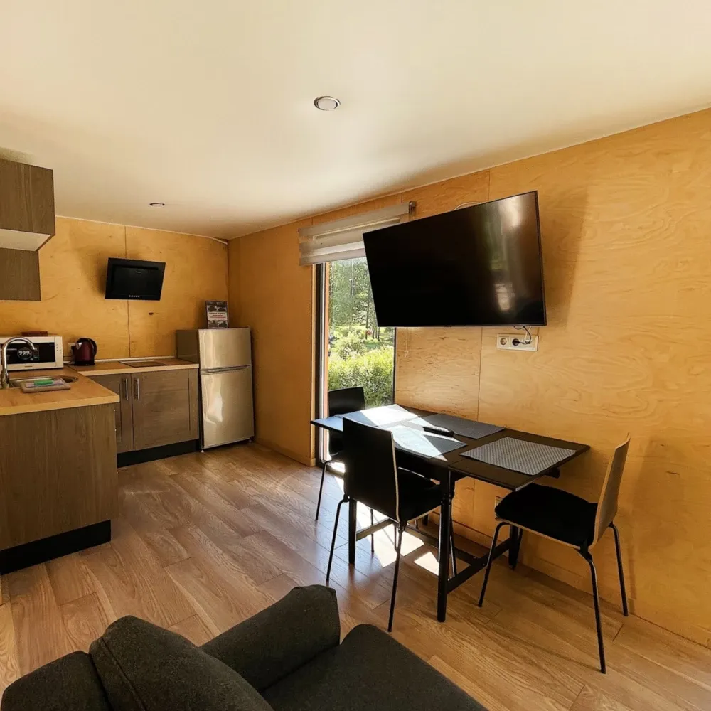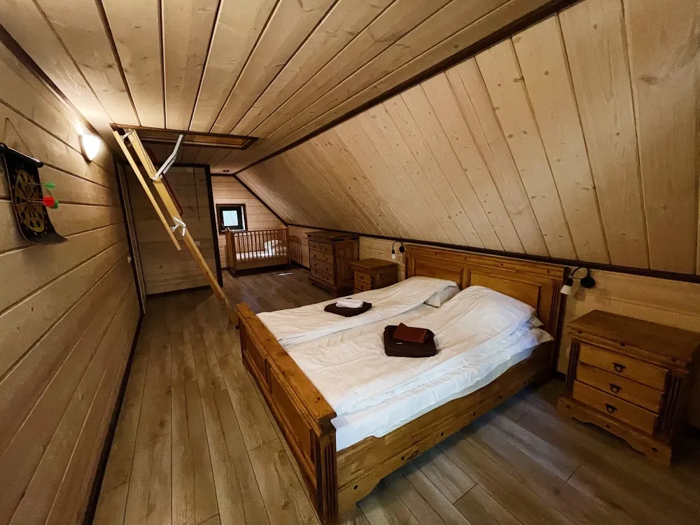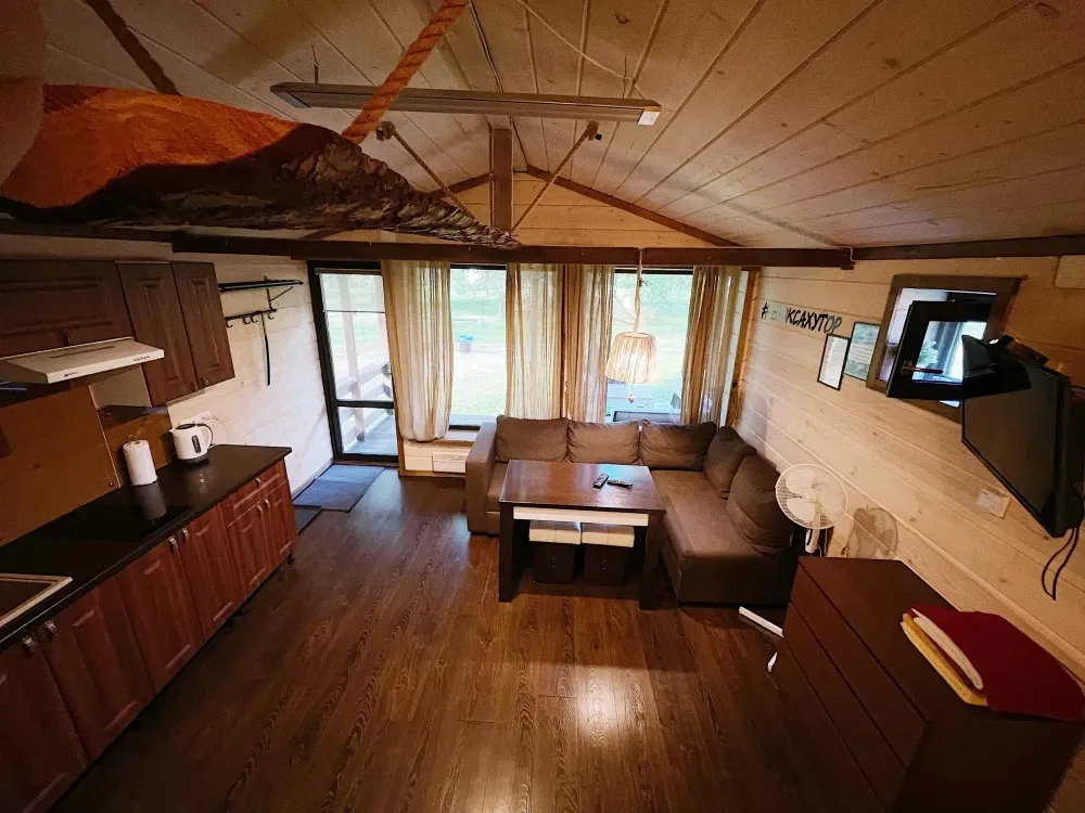 Два двуспальных места расположены друг над другом. Чтобы разместить дополнительного гостя, в шале есть диван-кровать, который можно разложить в спальное место.