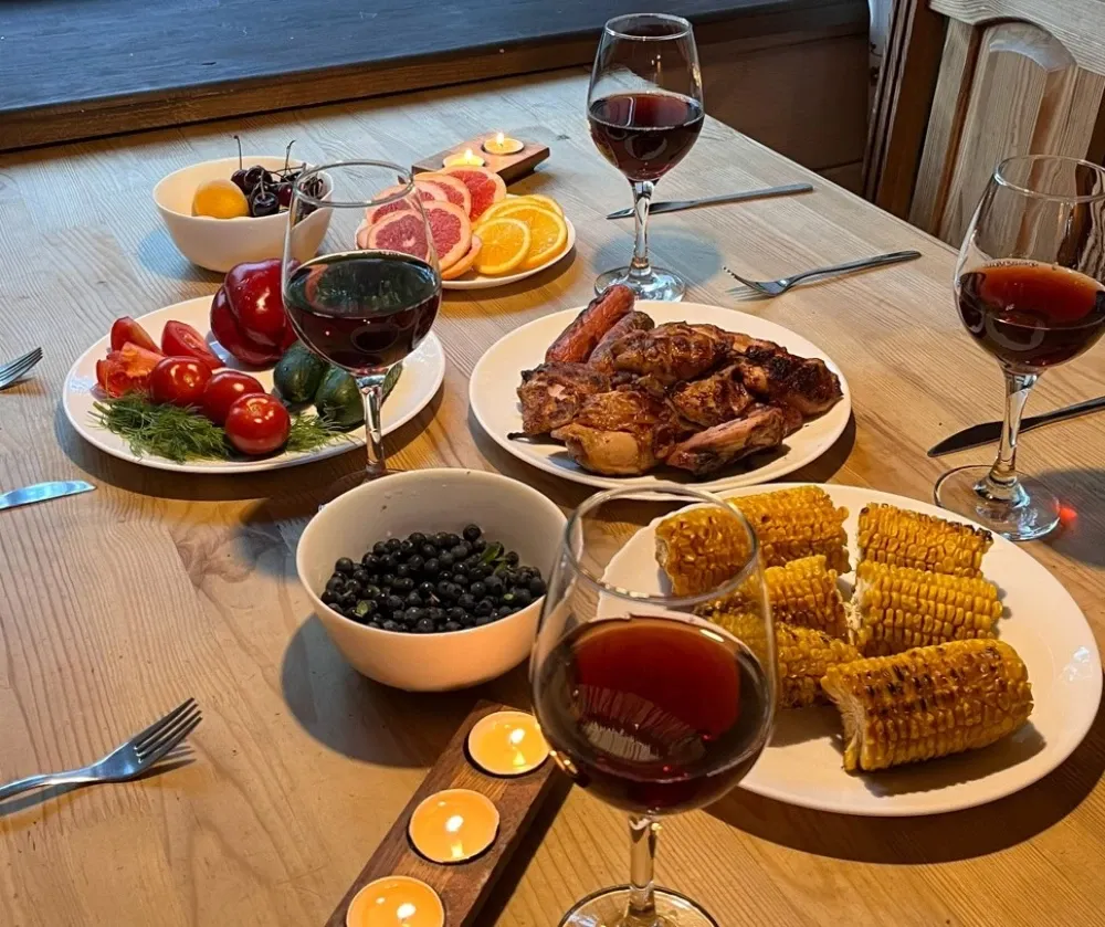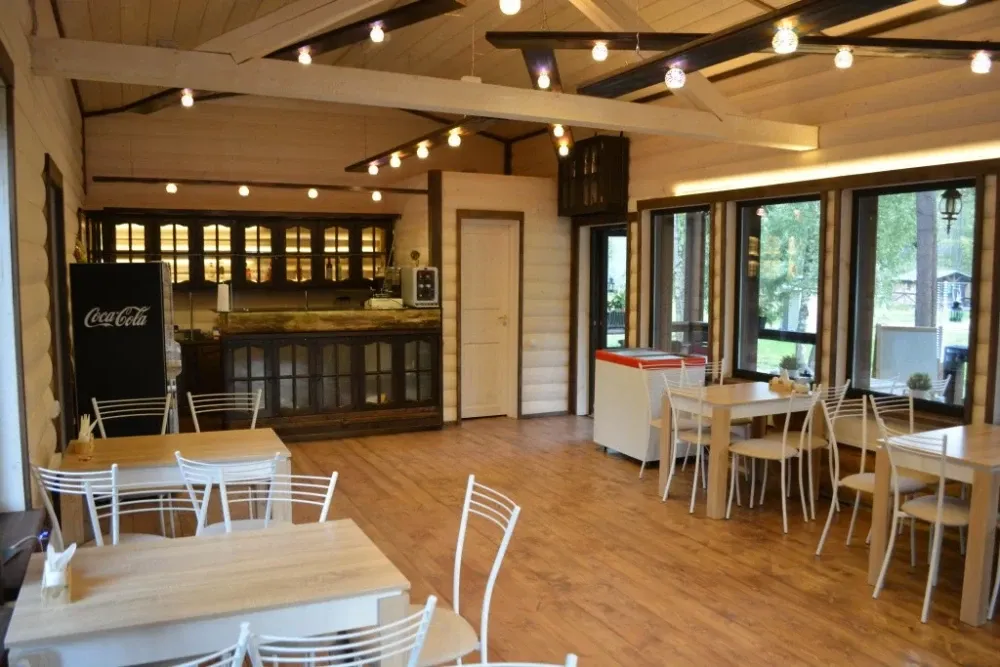 На территории базы работает уютное кафе, где можно насладиться разнообразием блюд русской и европейской кухни. Завтрак включен в стоимость проживания, а особое внимание уделяется выпечке собственного производства. Для тех, кто предпочитает готовить сам, в каждом коттедже есть полностью оборудованная кухня. Также на территории базы расположены беседки с мангалами для приготовления барбекю.
