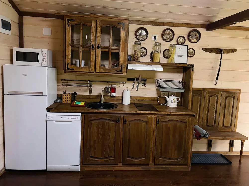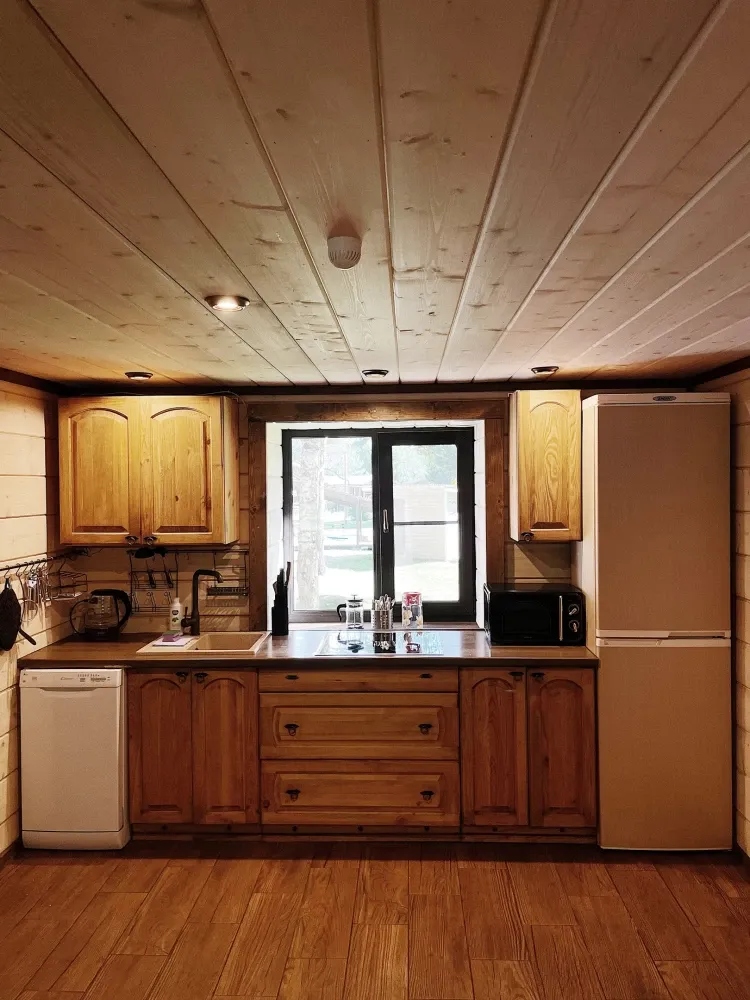 На полностью оборудованной кухне можно приготовить обед для всей семьи. Внутри есть всё необходимое: посудомоечная машина, холодильник, микроволновка, посуда для готовки и сервировки.