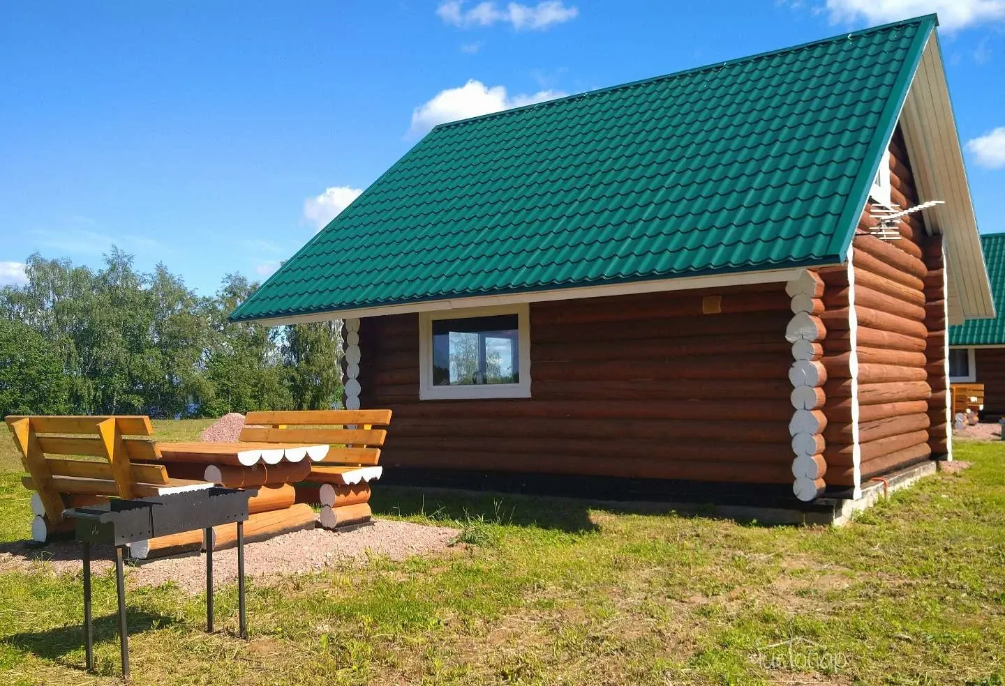 Перед каждым коттеджем оборудовано место для отдыха - стол с удобными скамейками и мангал.