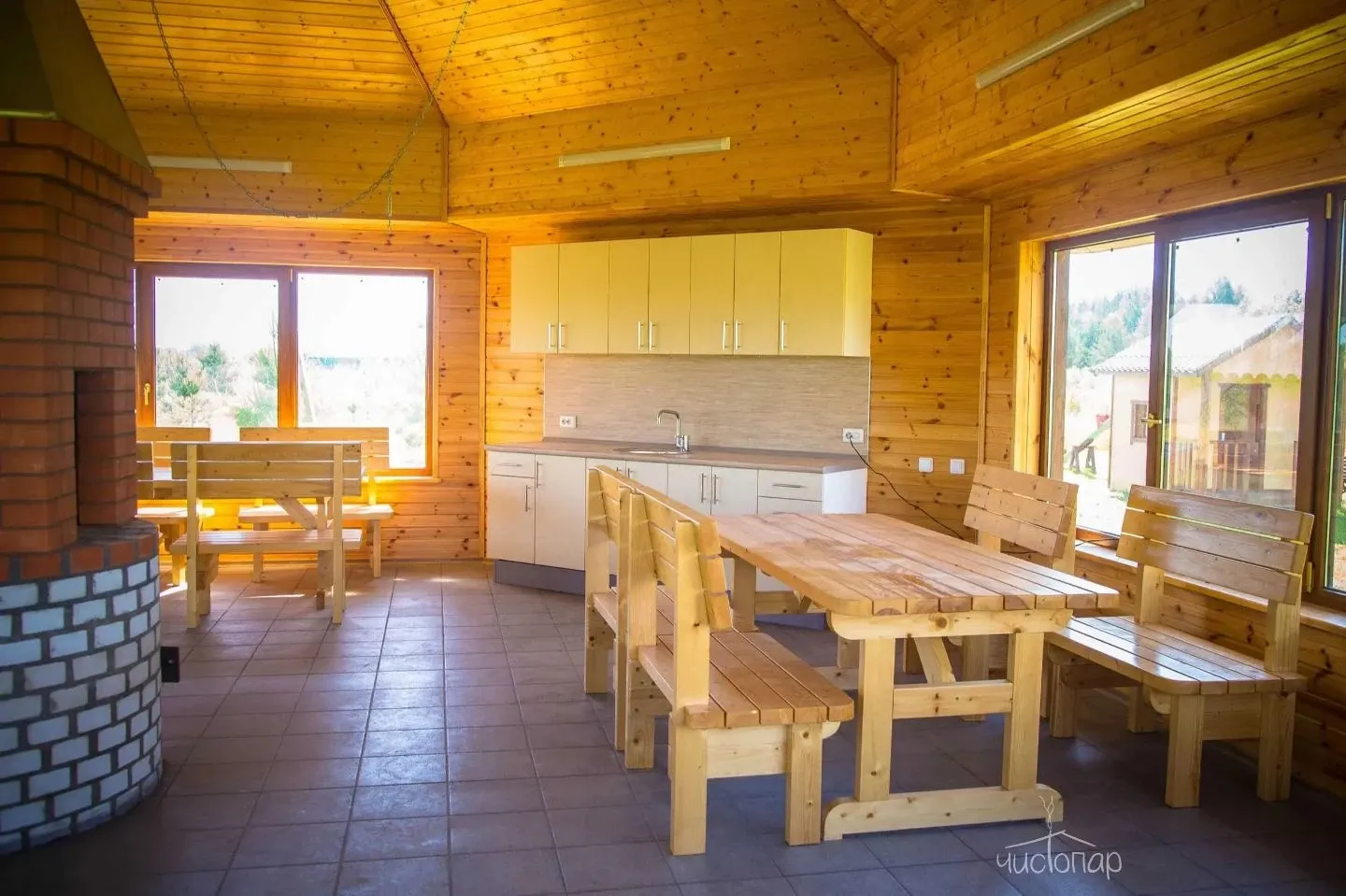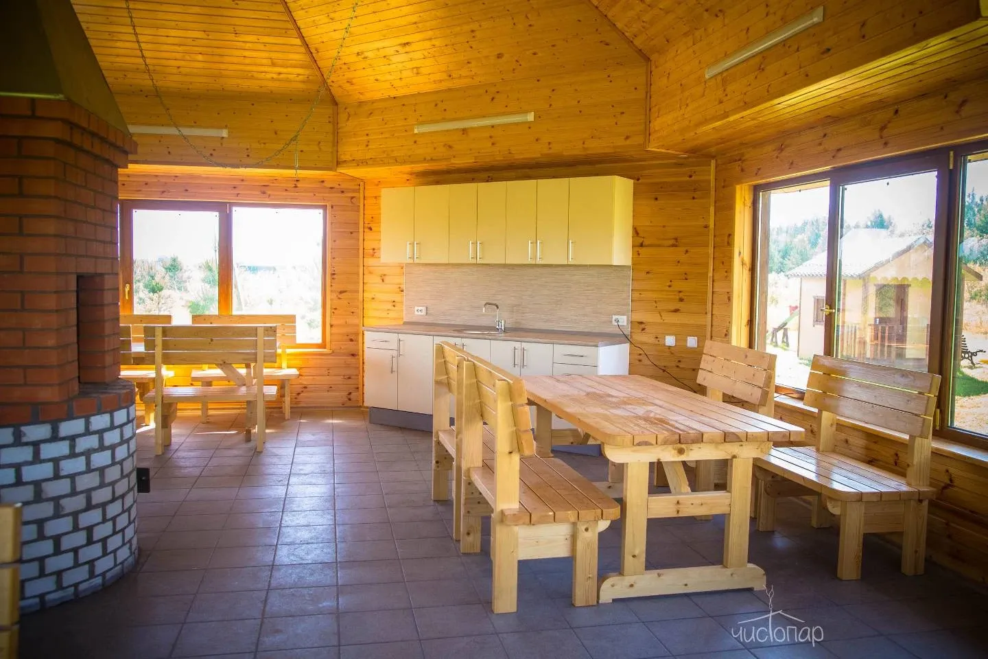 большая кухня-гостиная с обеденной зоной, цифровым ТВ и всей необходимой встроенной техникой и посудой. Рядом с коттеджами зоны отдыха с принадлежностями для барбекю.