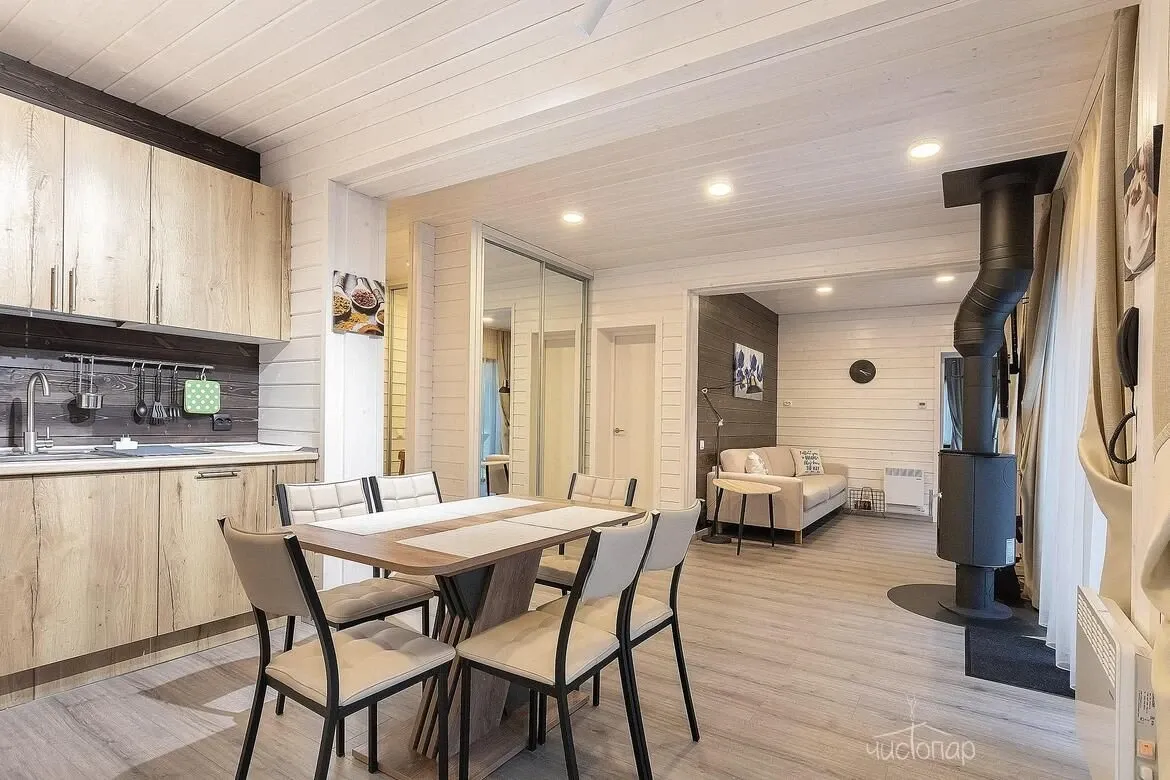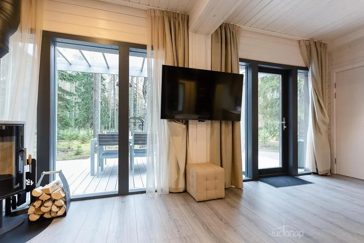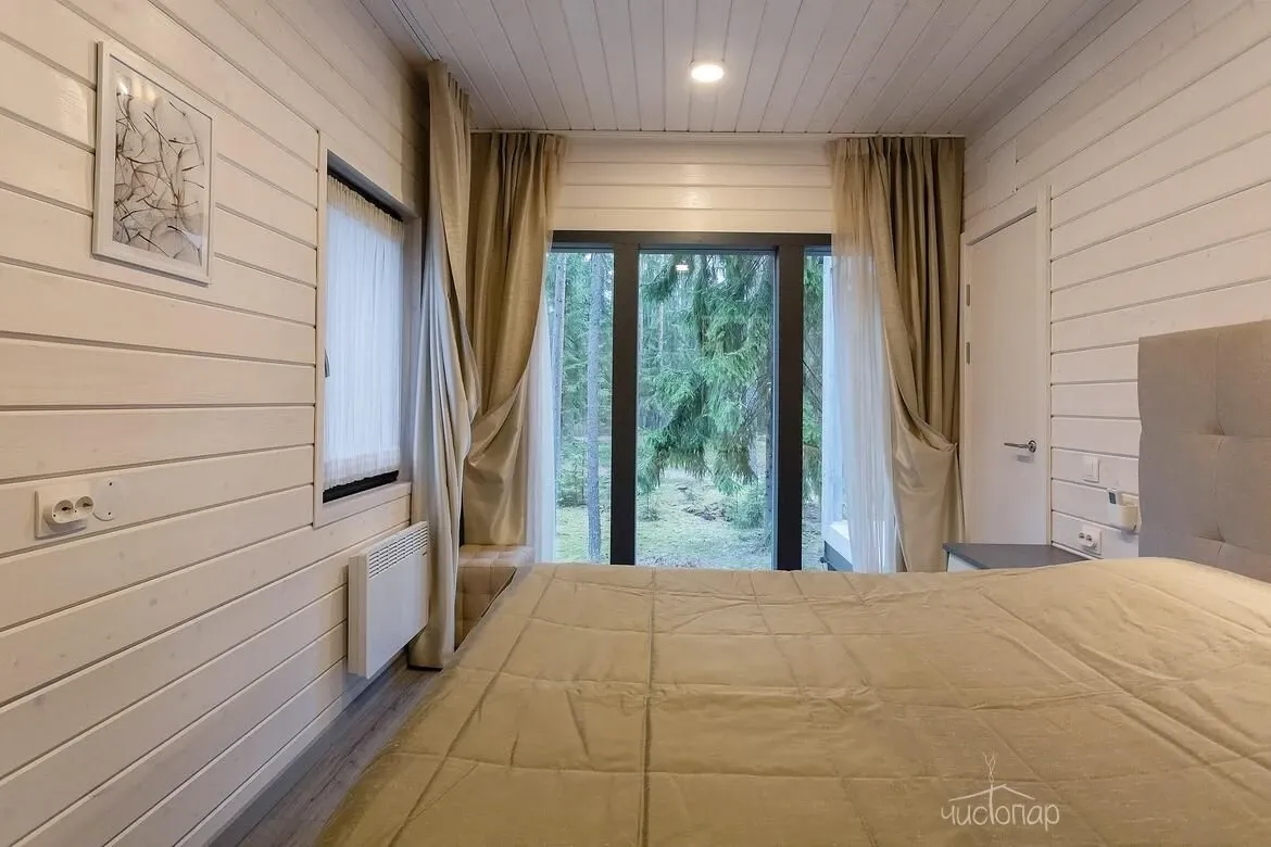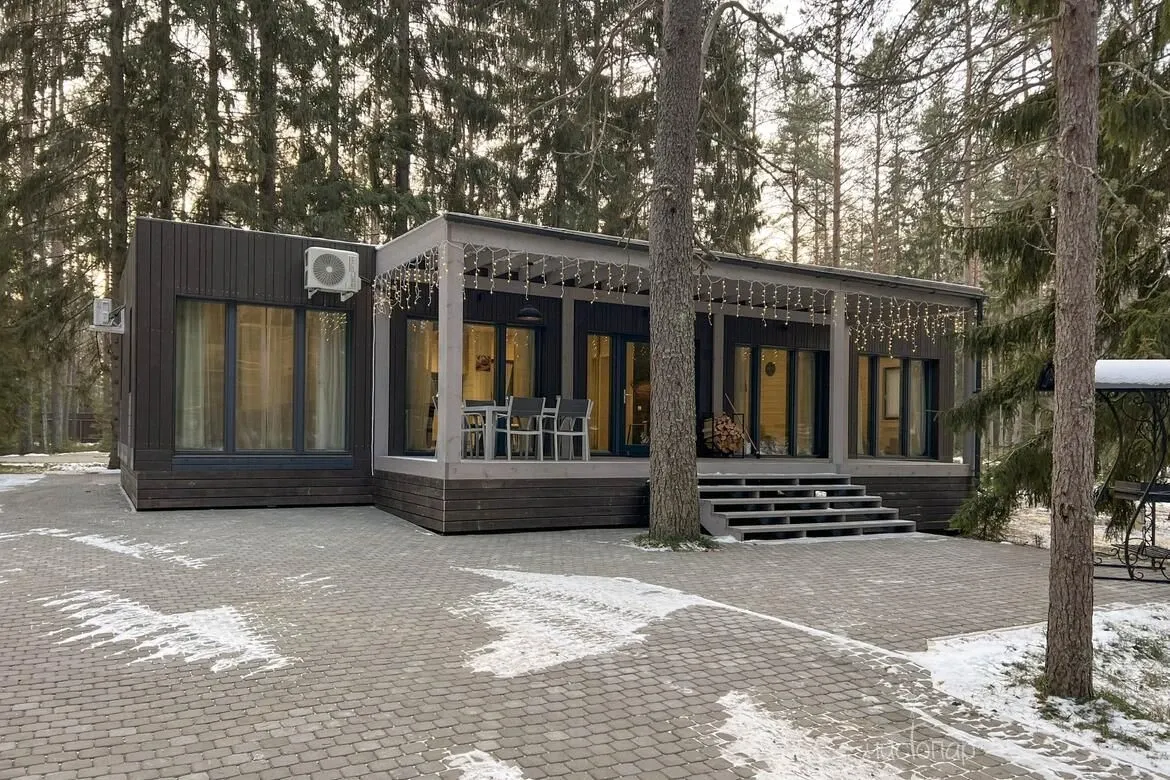 Новый коттедж 80м2 в скандинавском стиле для спокойного загородного отдыха с комфортом разместит семью или компанию до 4 человек. В одноэтажном коттедже просторная кухня-гостиная и две изолированные спальни с большими двуспальными кроватями. Кухня оборудована всей необходимой техникой и посудой для приготовления еды и хранения продуктов — посудомоечной машиной, микроволновкой, плитой, холодильником. В гостиной уютный камин, телевизор, удобный диван. Санузел с душевой кабиной, теплым полом, феном и стиральной машиной. Из панорамных окон открывается великолепный вид на шикарную природу пригорода Санкт-Петербурга. Терраса оборудована летней мебелью, где можно удобно разместиться для совместного досуга.