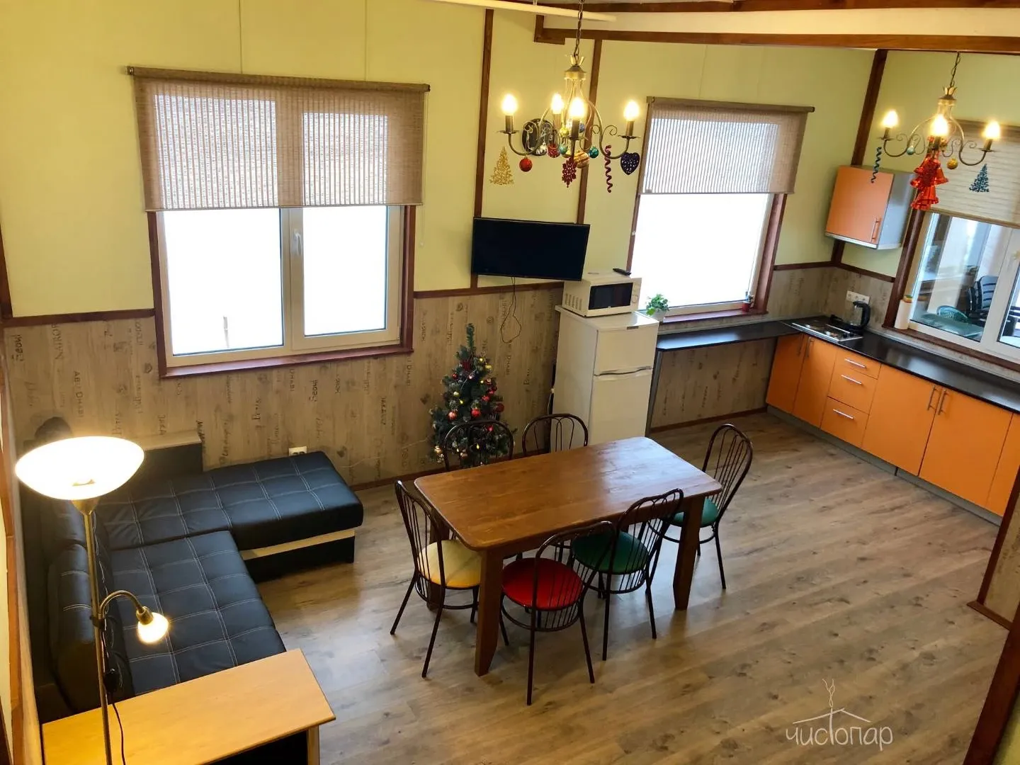 - Мини-кухня, оснащенная техникой и посудой. (Смарт ТВ, холодильник, чайник, микроволновая печь, комплект посуды.)