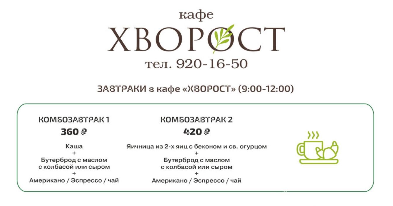 Питание организовано в кафе "Хворост" с вкусной домашней едой. Есть