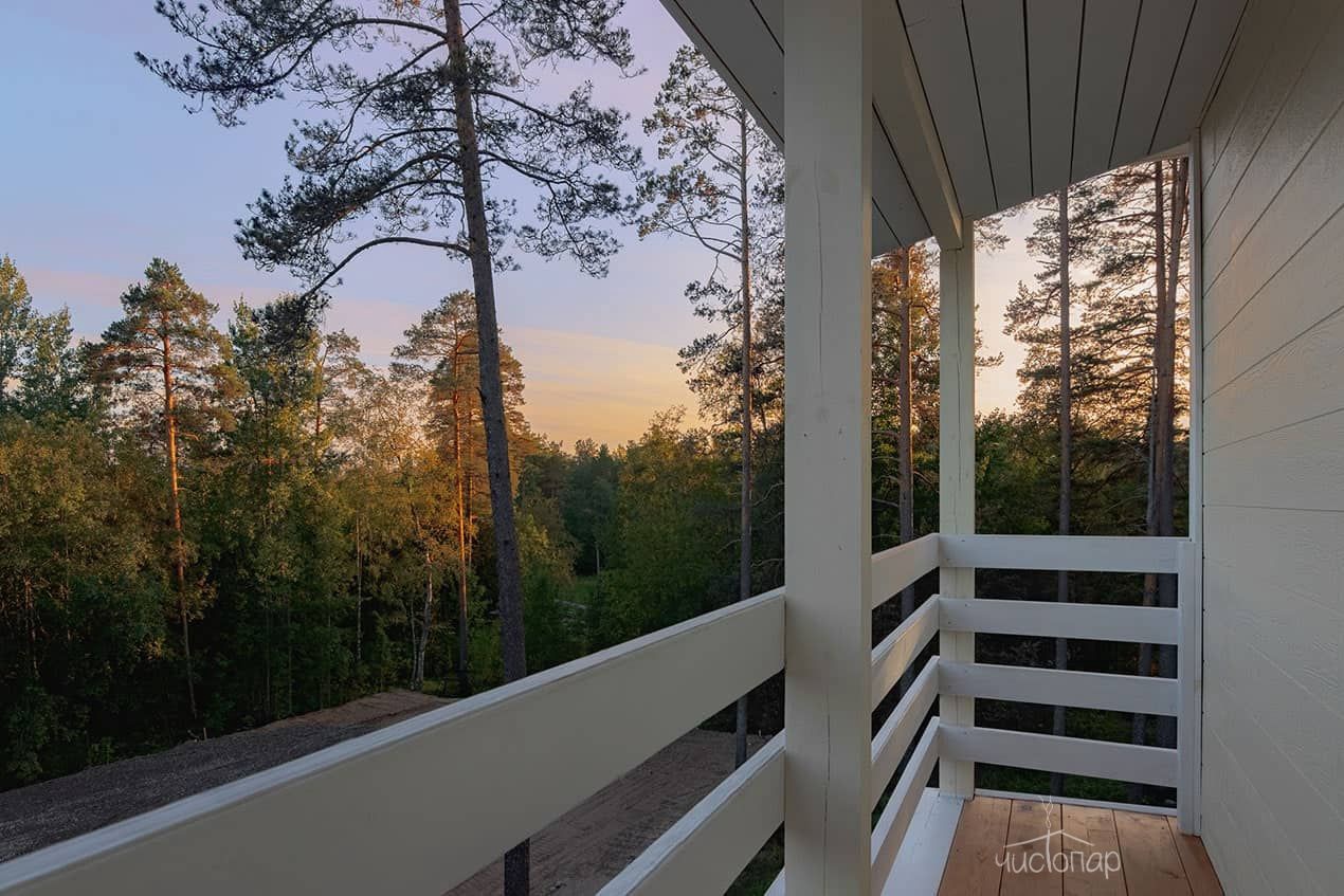 Уличная терраса и балкон на втором этаже с уличной мебелью.