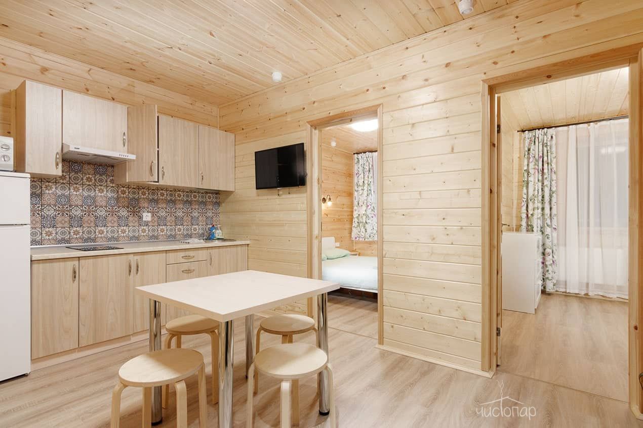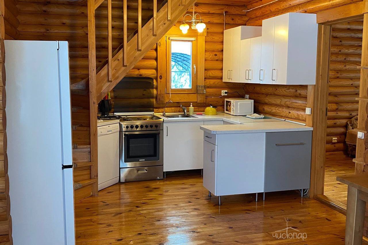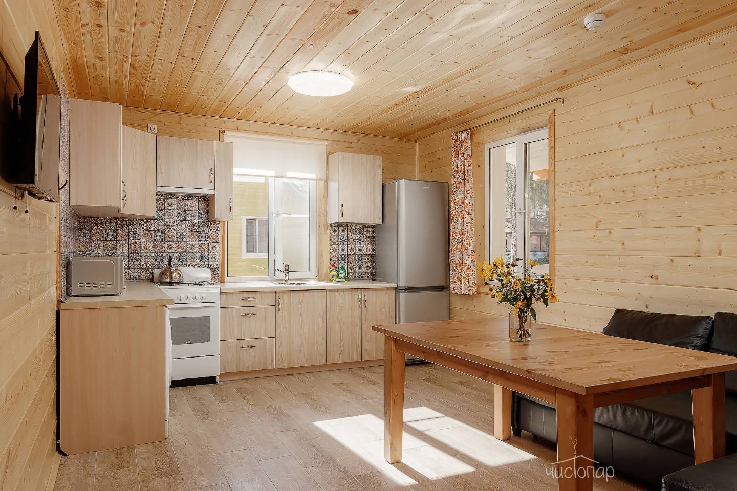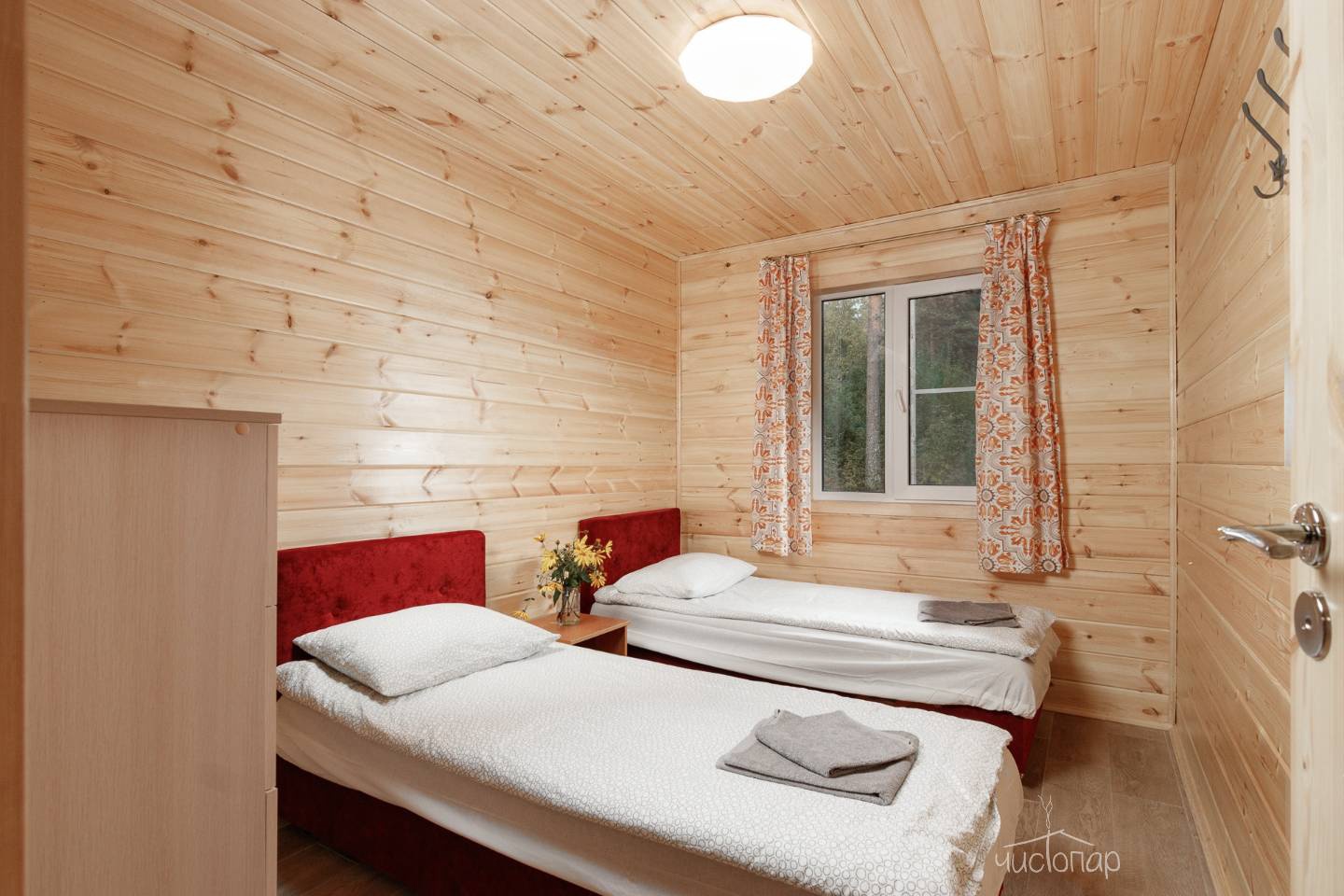 2 изолированные спальни, Гостиная+кухня, 2 СУ (на 1м и 2м этажах), Электрическая сауна внутри домика, ТВ, холодильник с морозилкой, газовая плита с духовкой на 4 конфорки, посудомоечная машина, микроволновая печь, Набор посуды для готовки и для сервировки.