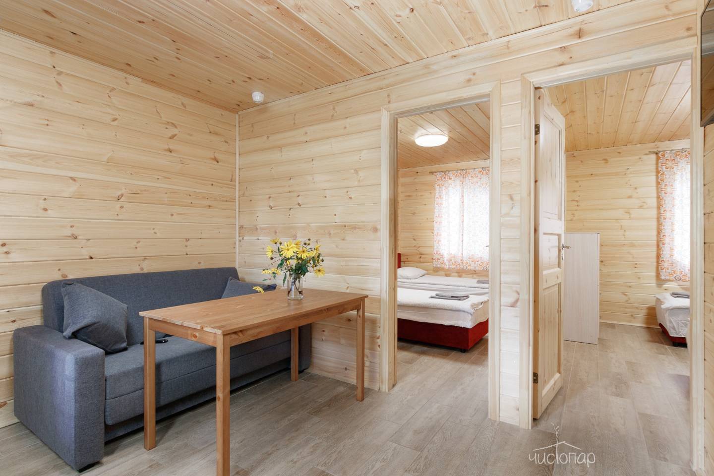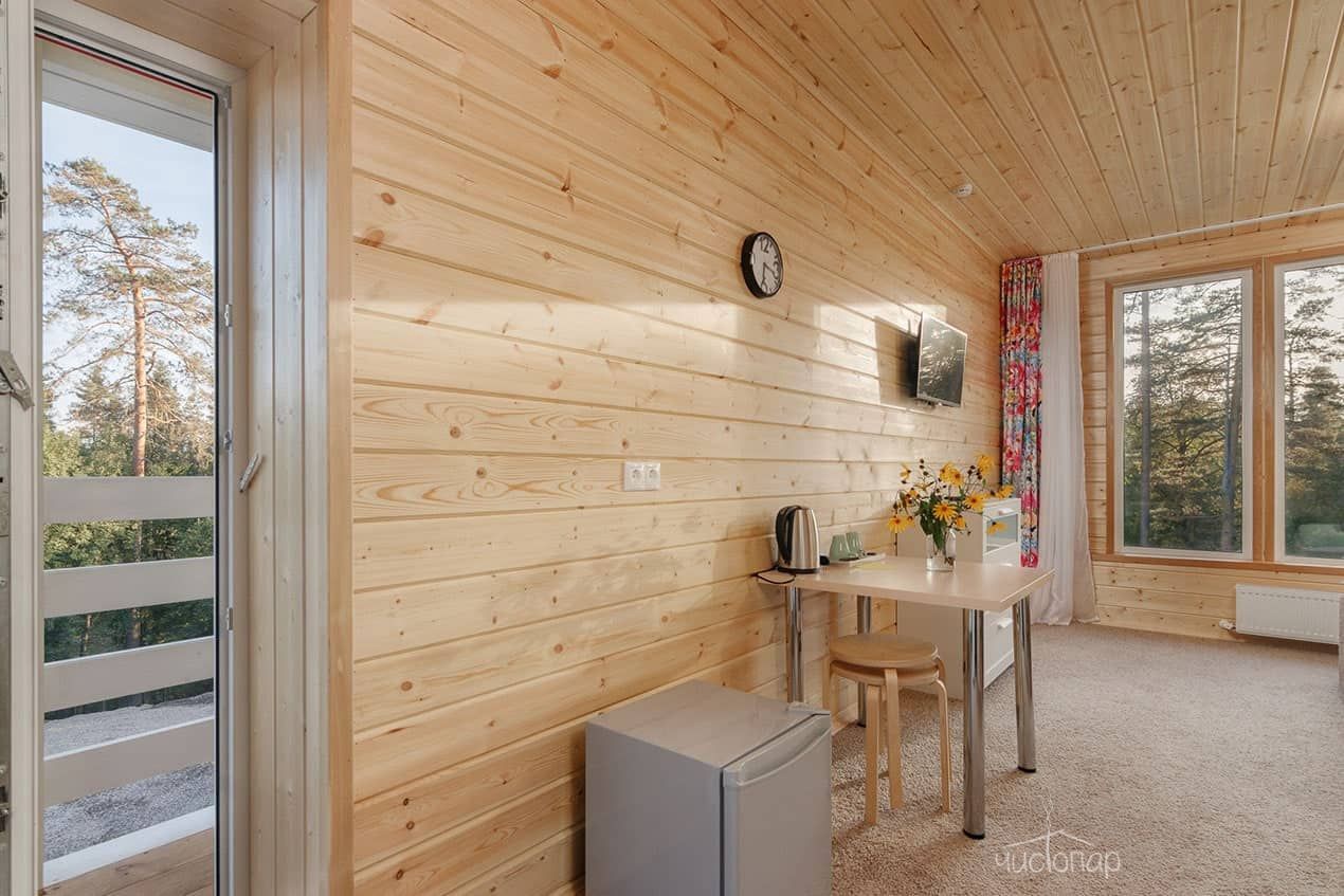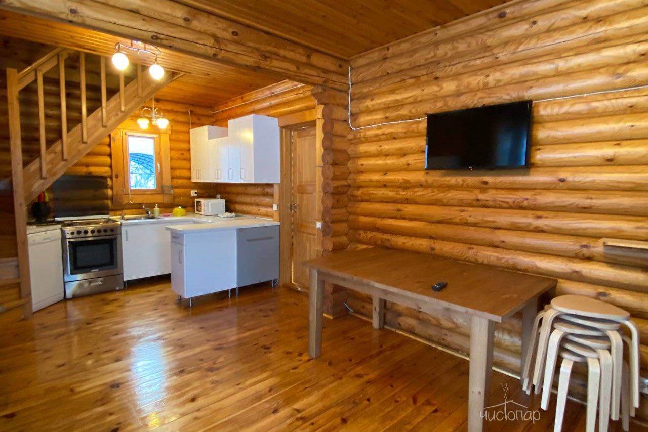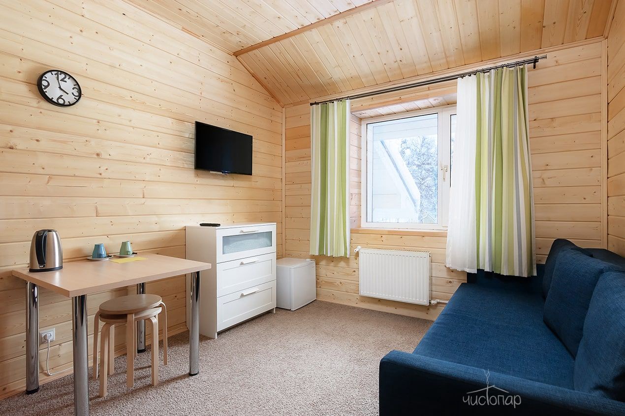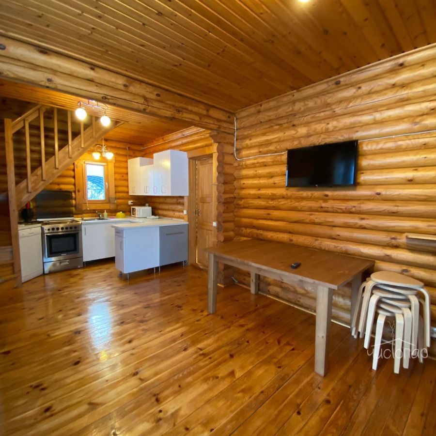 2 изолированные спальни, Гостиная+кухня, 2 СУ (на 1м и 2м этажах), Электрическая сауна внутри домика, ТВ, холодильник с морозилкой, газовая плита с духовкой на 4 конфорки, посудомоечная машина, микроволновая печь, Набор посуды для готовки и для сервировки.