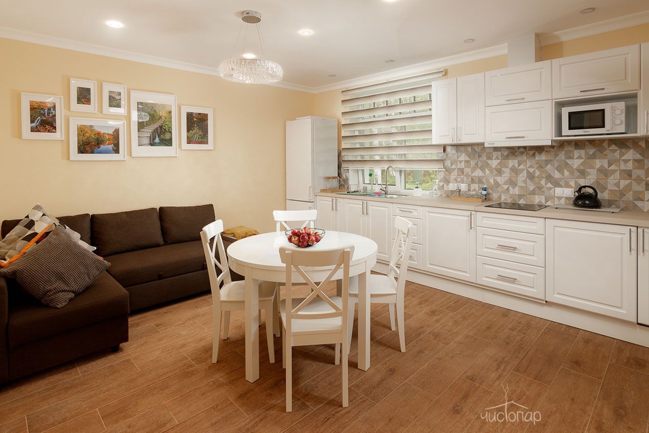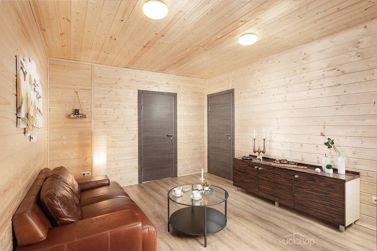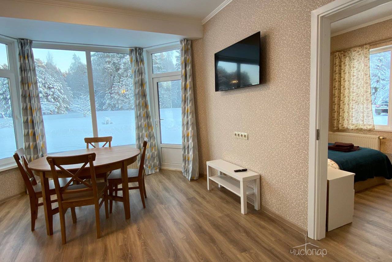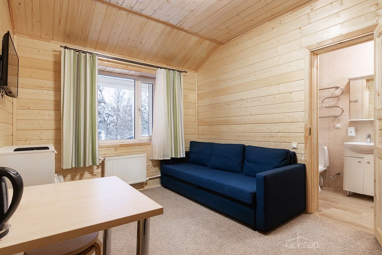 2 изолированные спальни, Гостиная+кухня, 2 СУ (на 1м и 2м этажах), Электрическая сауна внутри домика, ТВ, холодильник с морозилкой, газовая плита с духовкой на 4 конфорки, посудомоечная машина, микроволновая печь, Набор посуды для готовки и для сервировки.