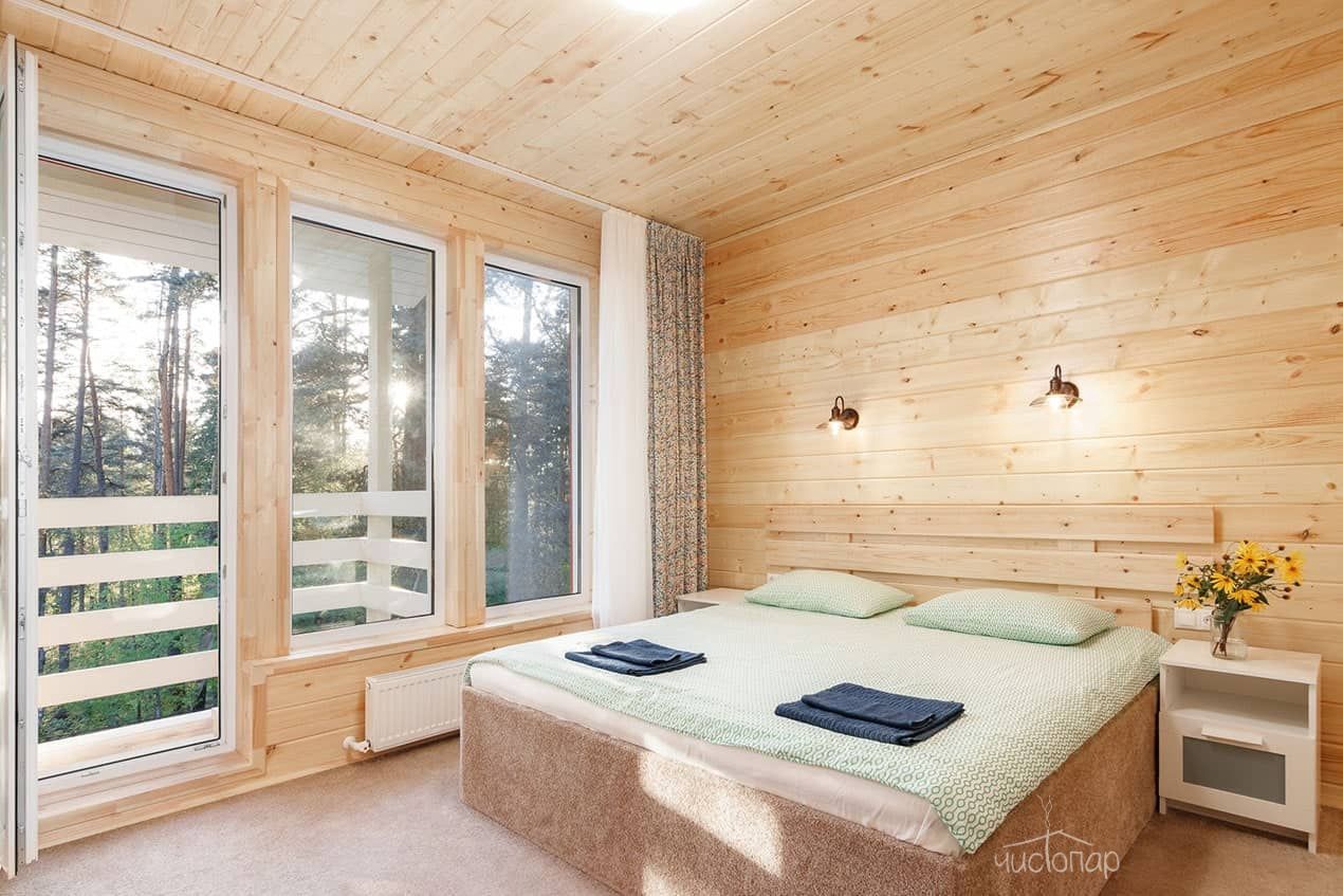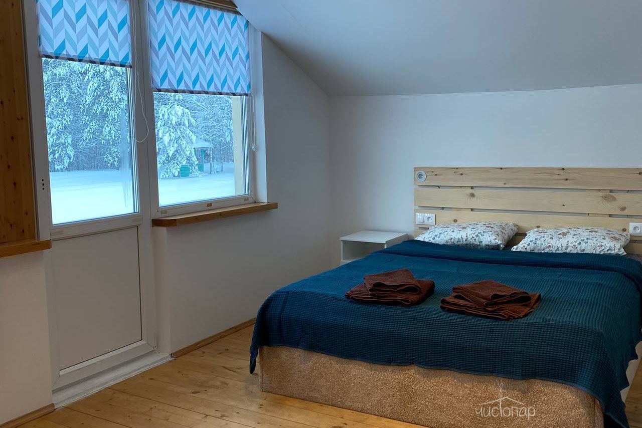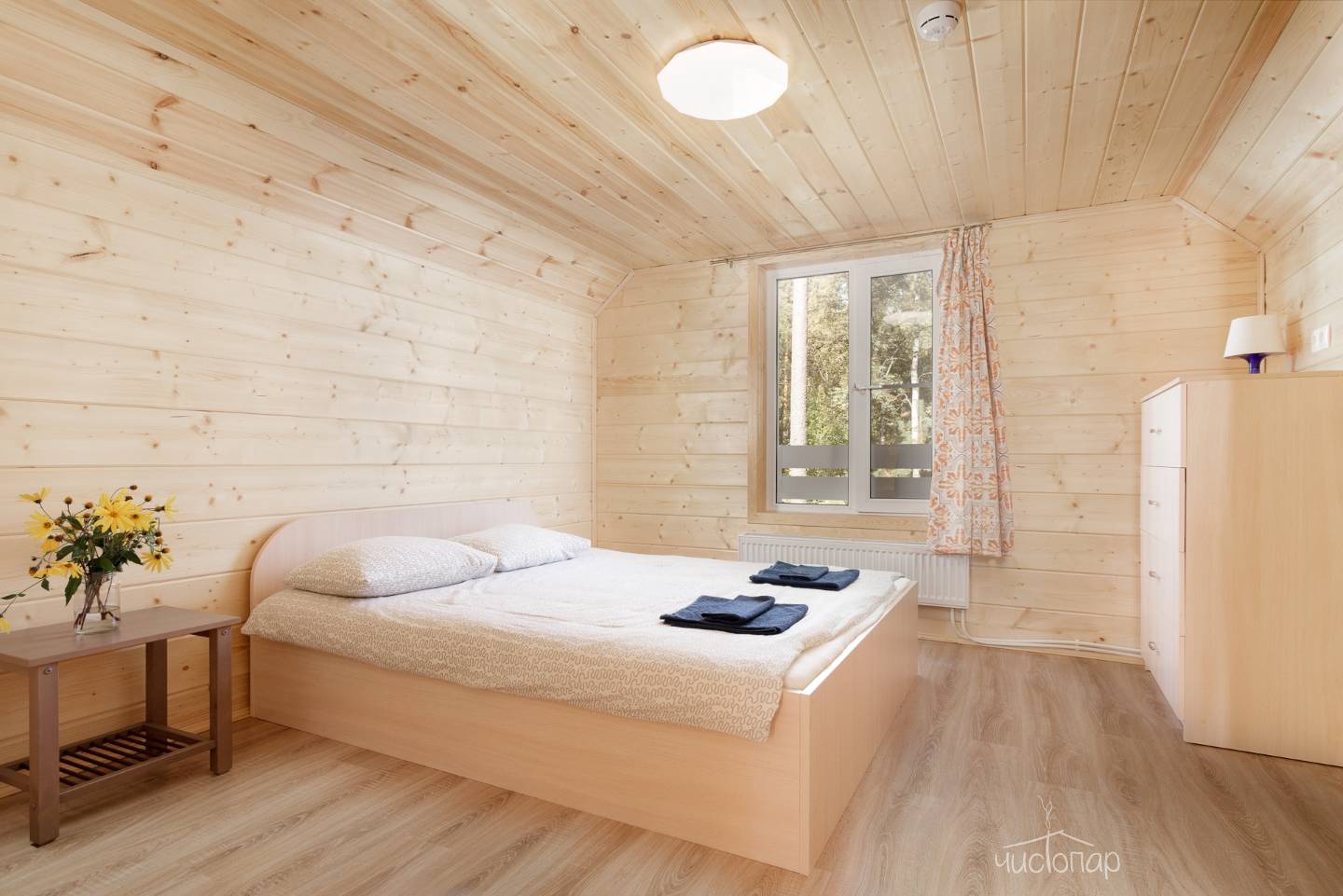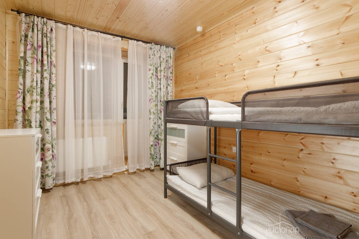 В спальне первого этажа - полуторная кровать, выход на уличную террасу, выход в СУ с сауной. В кухне-гостиной двуспальный раскладной диван (1-2 доп.места), В спальне второго этажа - 2 двуспальные кровати + выход на балкон.