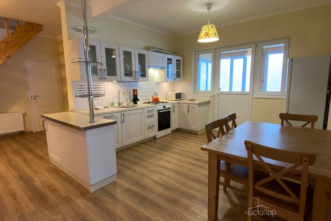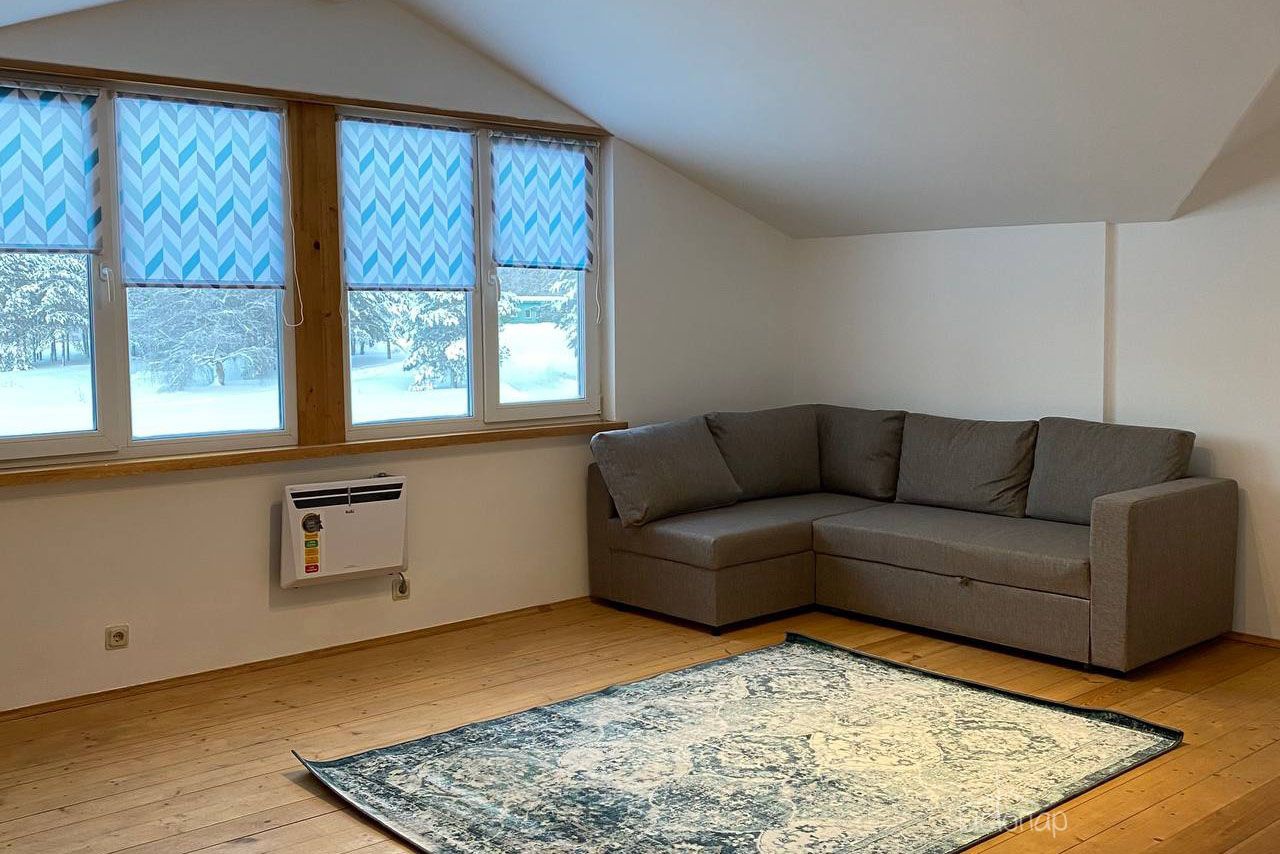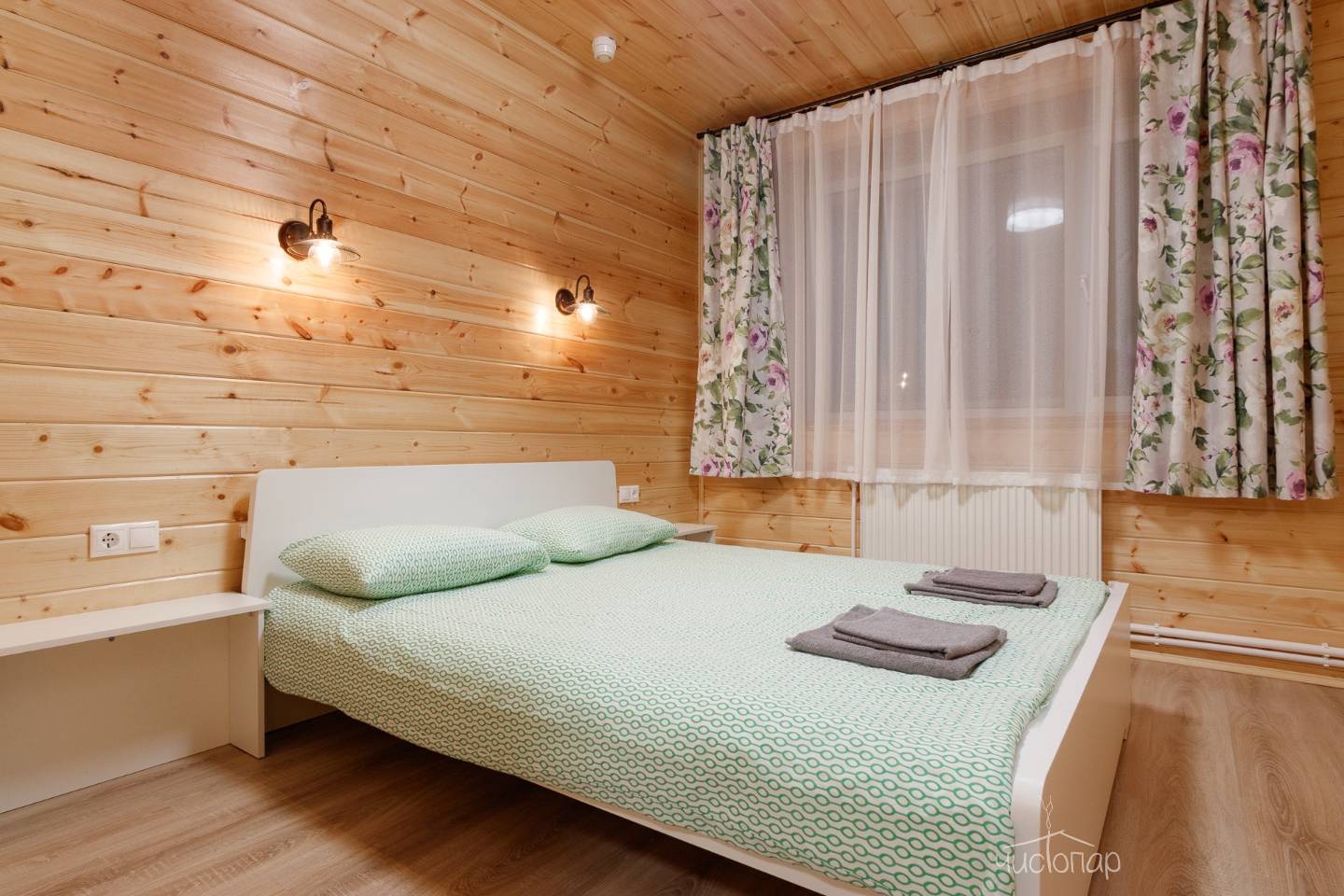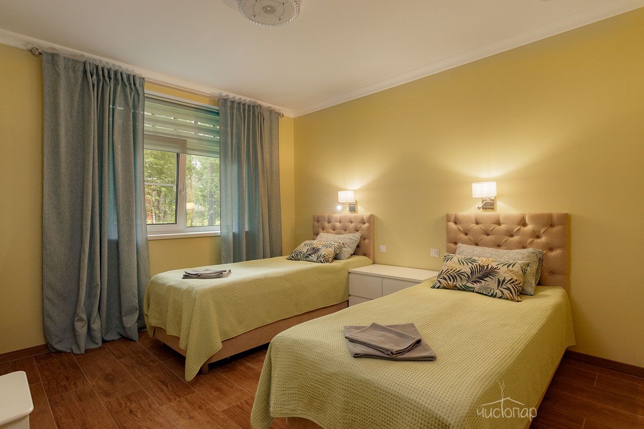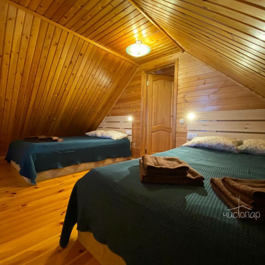 В спальне первого этажа - полуторная кровать, выход на уличную террасу, выход в СУ с сауной. В кухне-гостиной двуспальный раскладной диван (1-2 доп.места), В спальне второго этажа - 2 двуспальные кровати + выход на балкон.