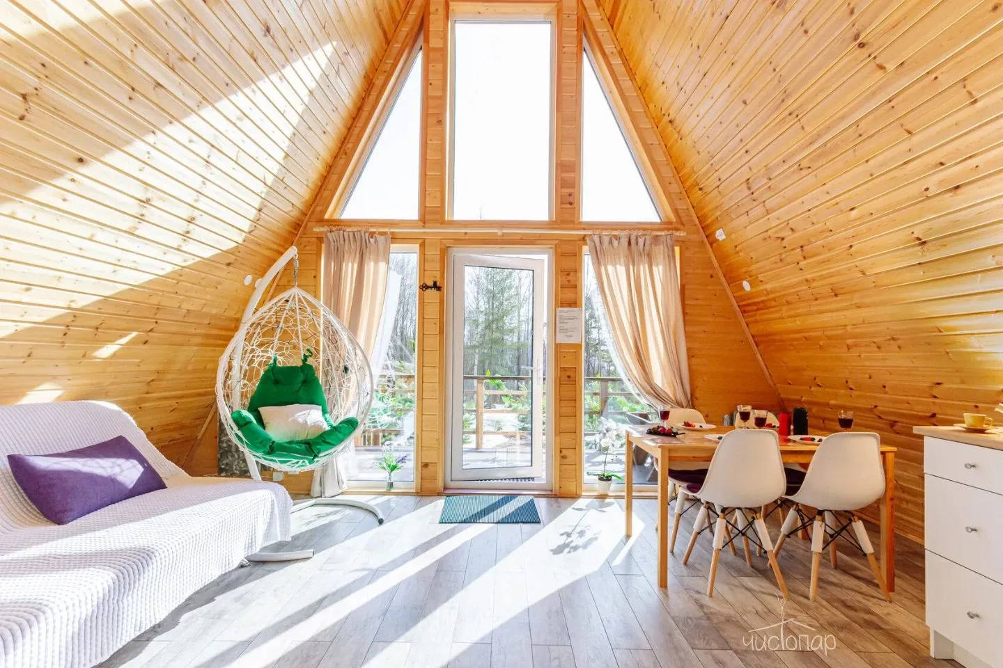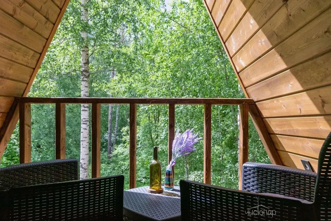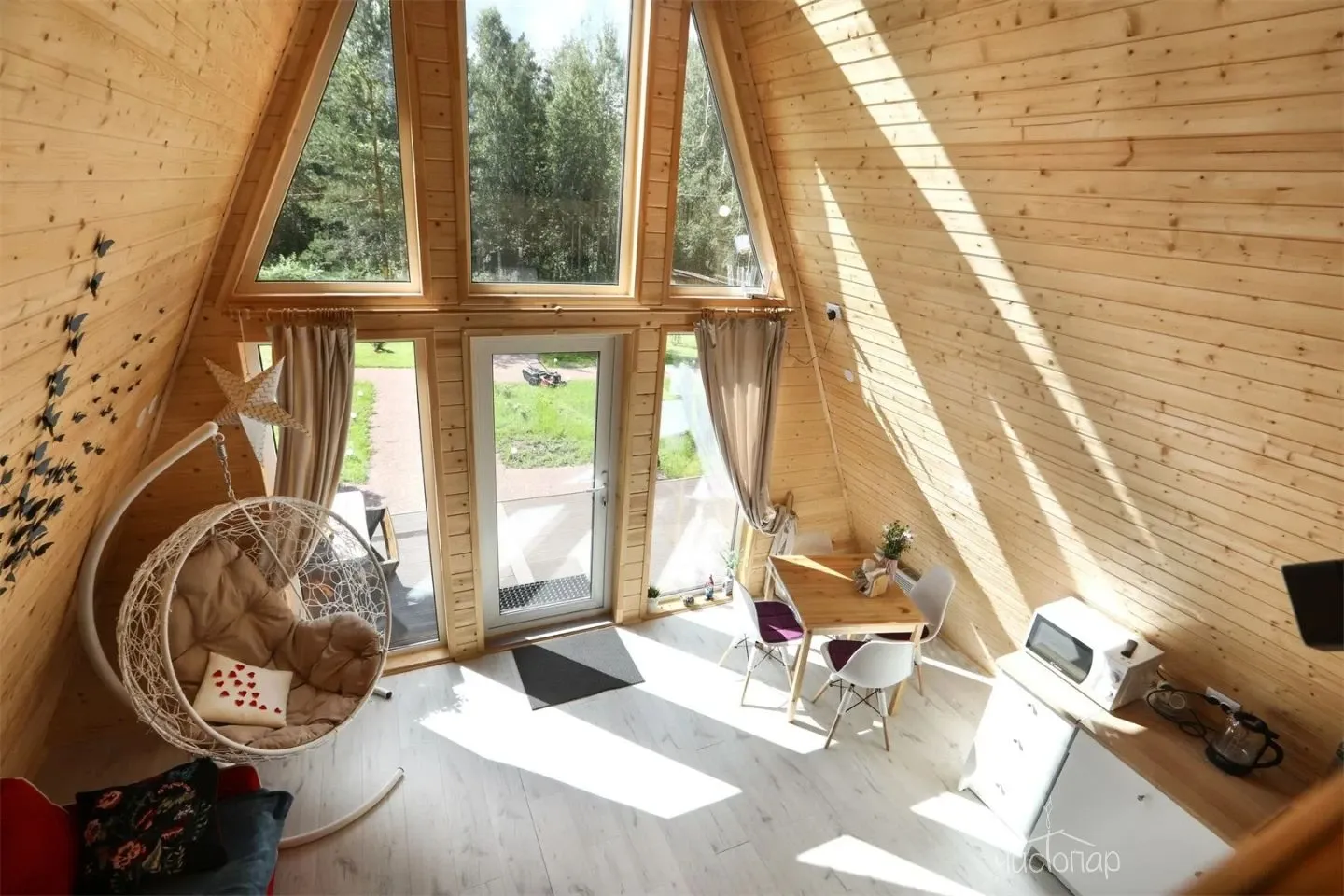 Треугольный дизайнерский домик— шале с балконом (вместимость до 10 человек), общая площадь 72 кв.м. Дом для отдыха полностью выполнен из дерева и оборудован для комфортного отдыха. В доме теплые водяные полы с датчиком регулировки температуры, настенный кварцевый обогреватель, вентилятор, установлен бойлер, современный экологический септик.