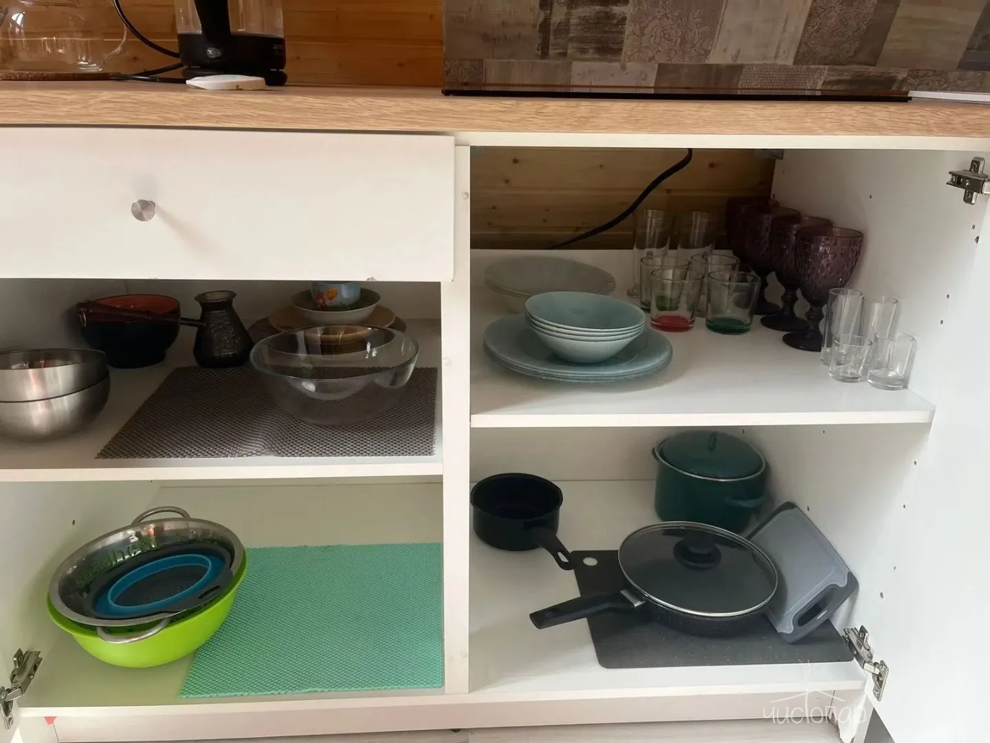 - Мини-кухня (большой обеденный стол и стулья, холодильник, микроволновая печь, набор посуды/утвари для приготовления еды и красивой сервировки стола, чайник, электрическая плита, средства для мытья посуды, губки, кухонные полотенца);