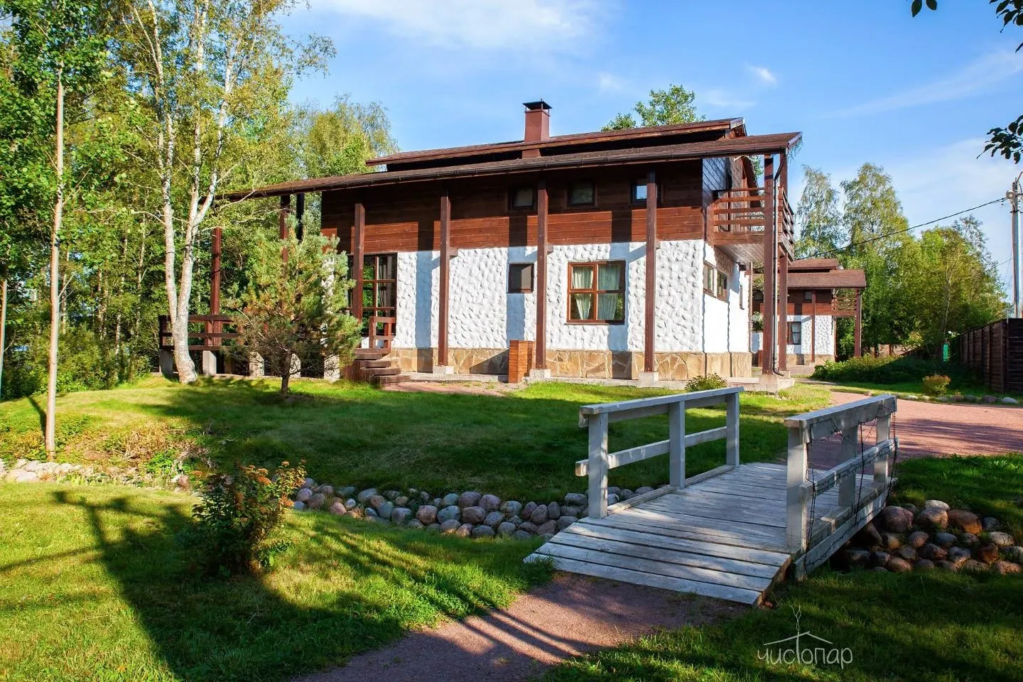 Для размещения гостей коттеджи в стиле альпийского шале площадью 200 м2. В доме 50-ти метровая гостиная с камином, 4 спальни на 8 человек и огромная 70-ти метровая терраса с садовой мебелью и мангальной зоной возле каждого дома